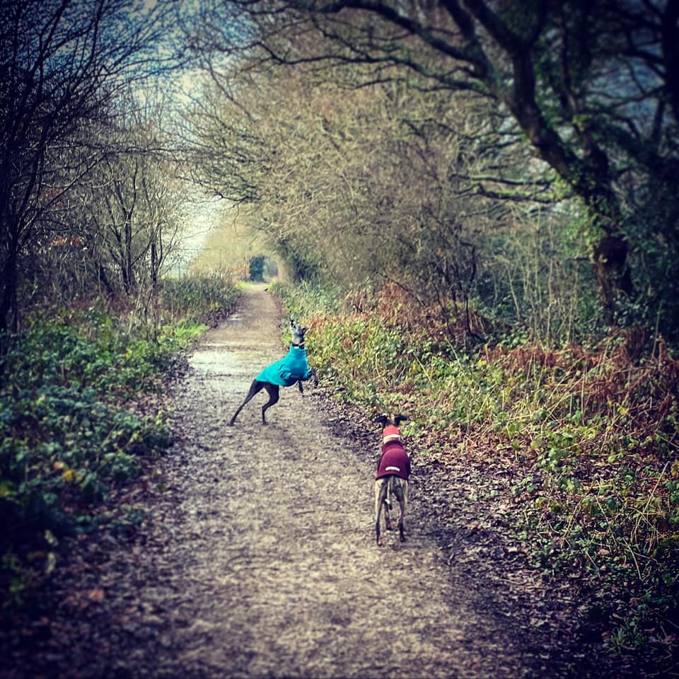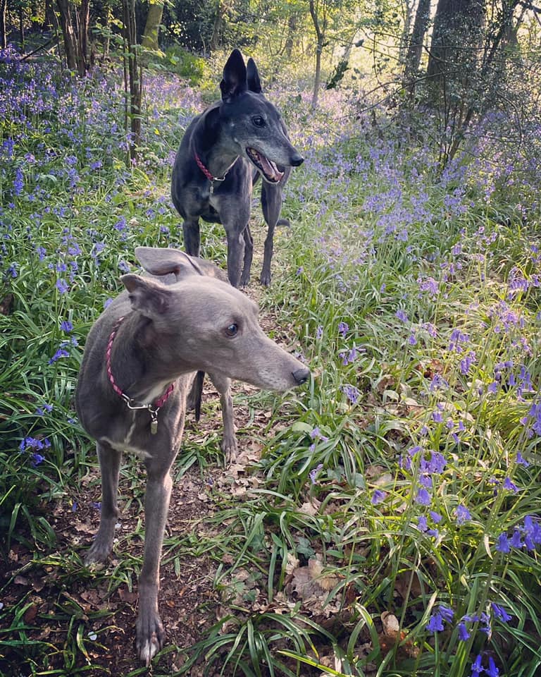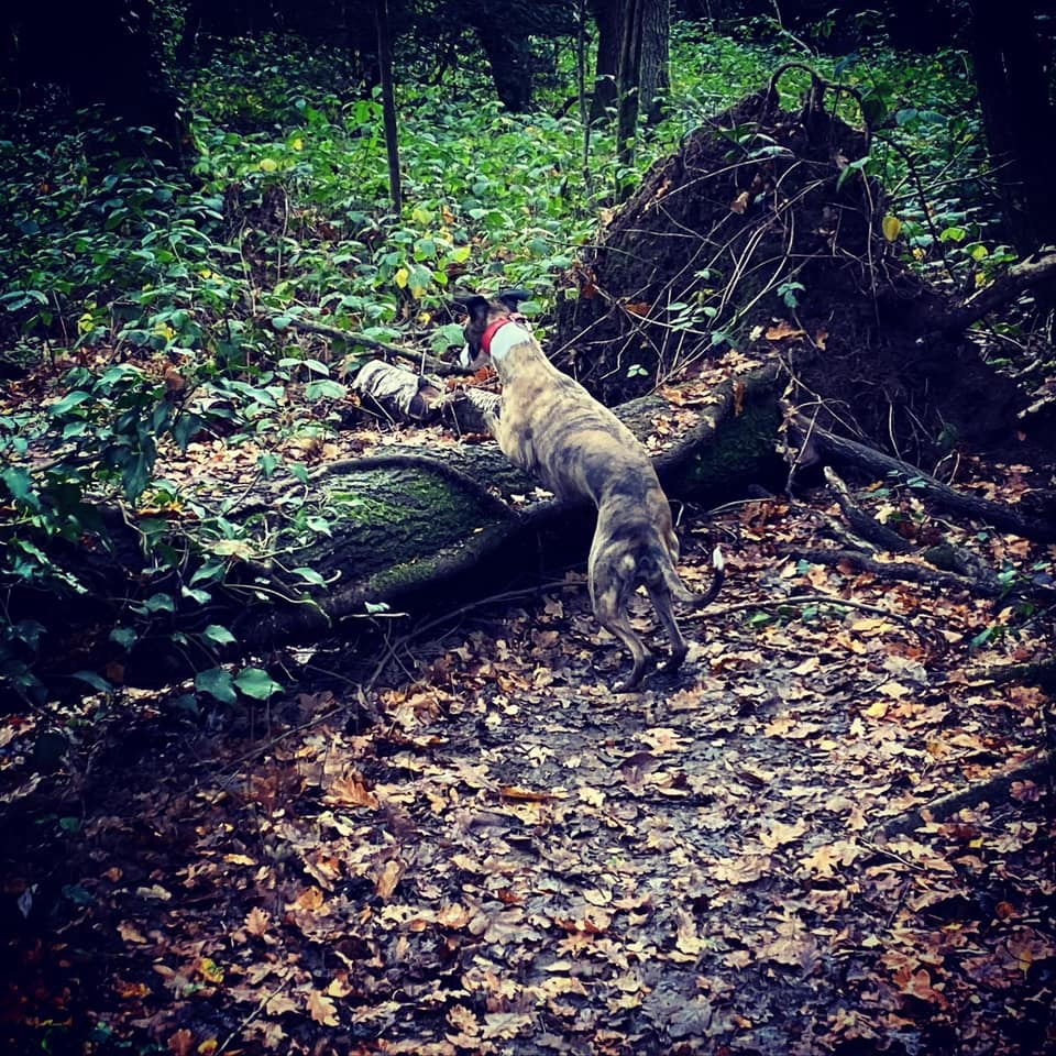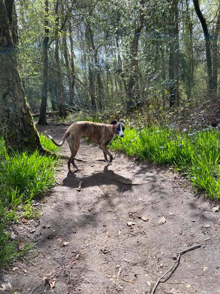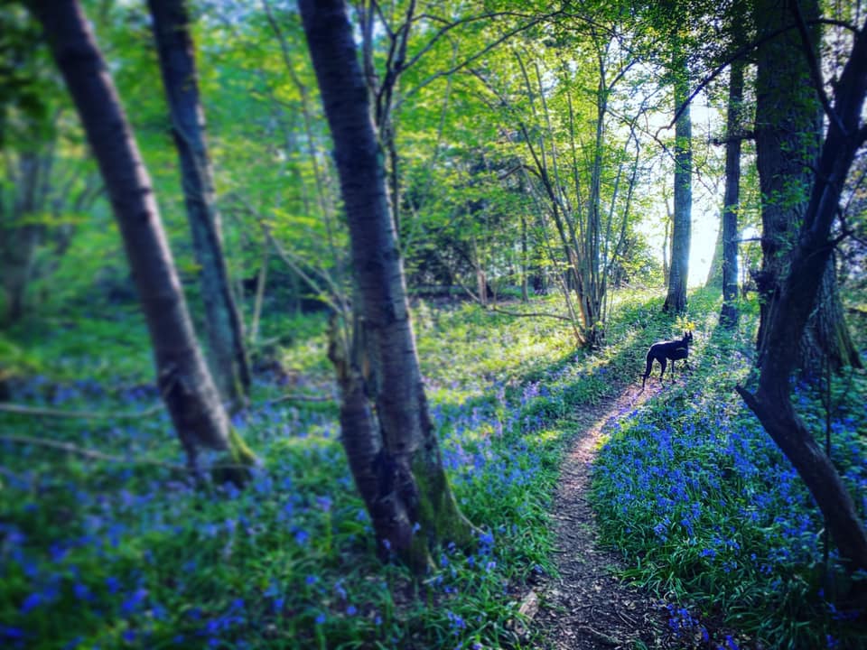 Step over this (Jett sometimes opts to go under it as per the photo), and follow the little path as it winds through the woods of Ainsley Berry Shaw. In the late spring, there are bluebells in here and, as the woods aren’t that well known, they’re not usually trampled all over.