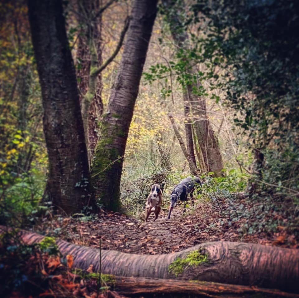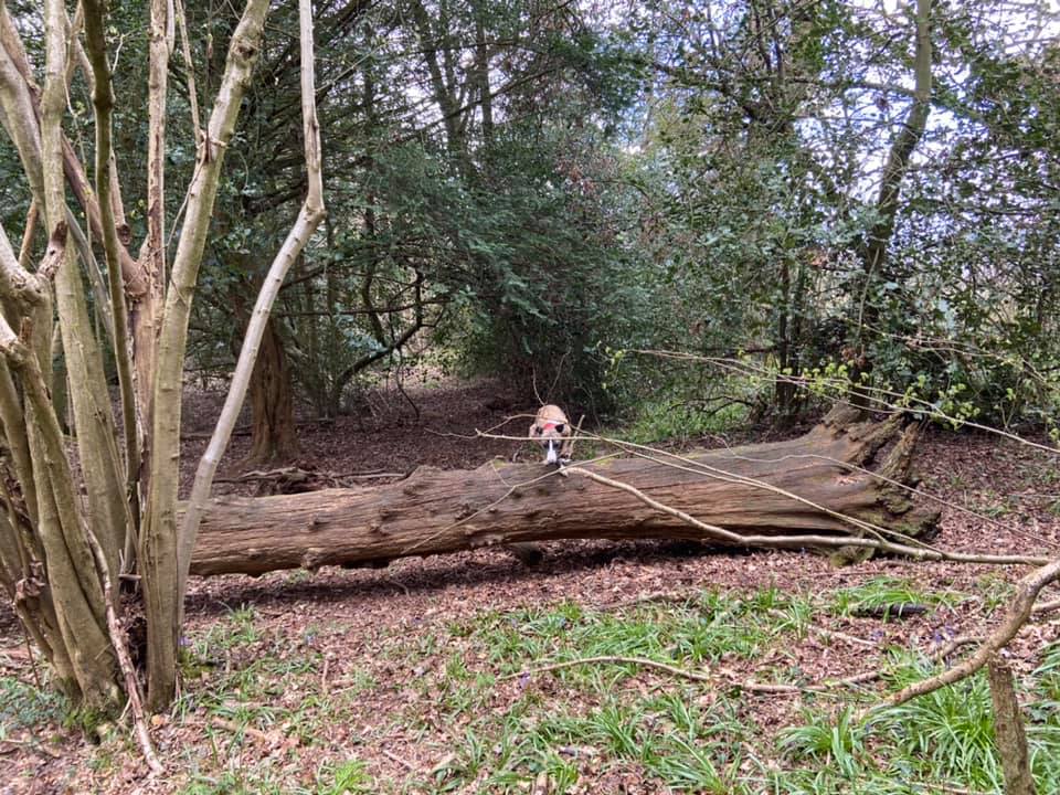 You’ll carry on winding through the trees, then go down a dip and under a couple of fallen trunks (they are together), then up a slope – ignore the path that comes off to the right, keep on straight. When you get to a fork with a fallen tree across the left path, bear left and over the trunk. Keep going. Cross over another couple of tree trunks (again, these are right together) and then go around another, larger fallen tree trunk (or leap over it if you’re feeling athletic). Carry on down the same path and you’ll come to yet another fallen tree. This is covered in ivy. Go over this (or under it but it’s quite a duck) and then over the smaller fallen trunk right behind it.