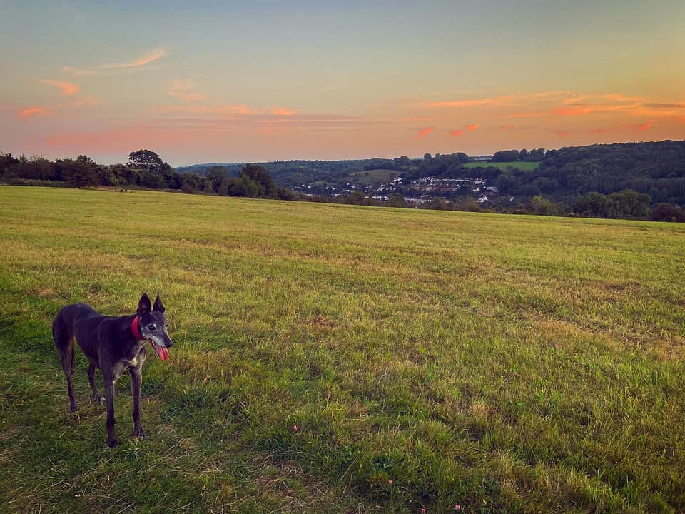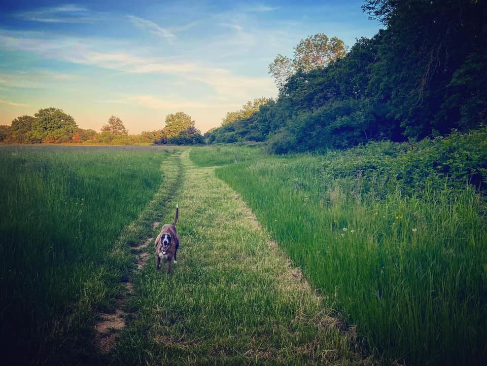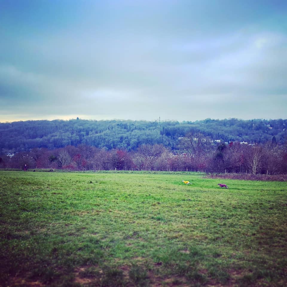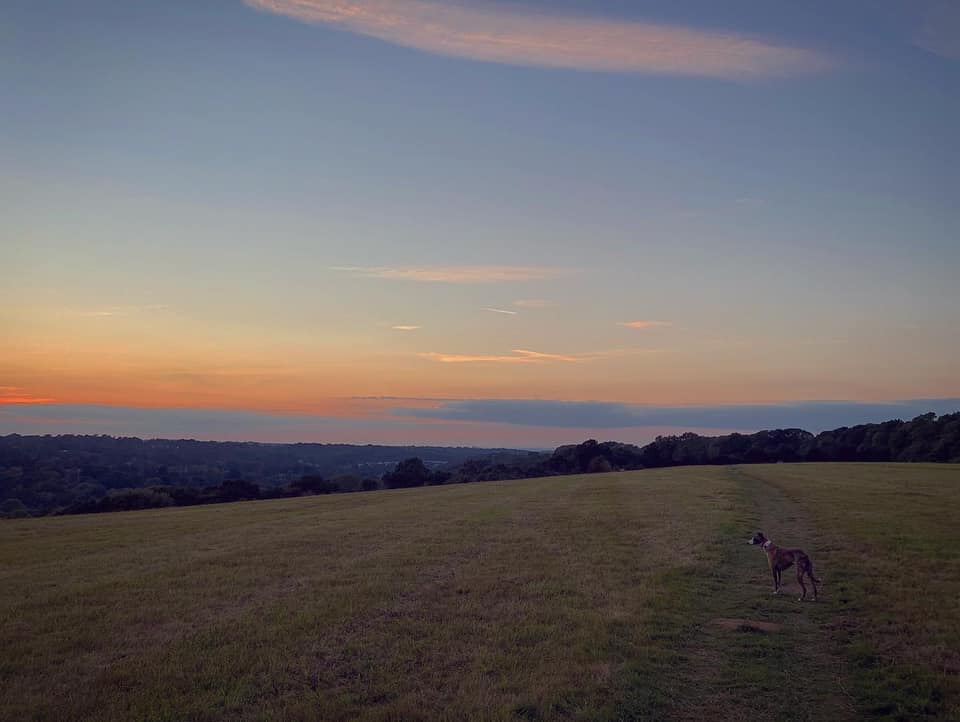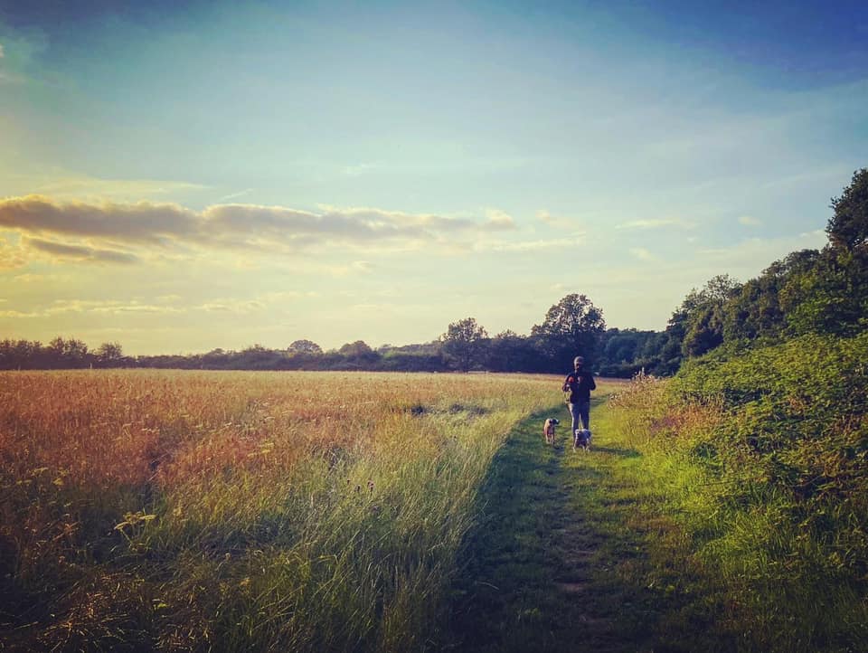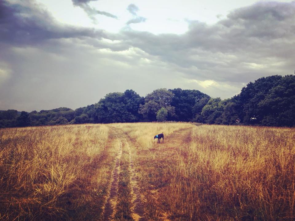 At the tall hedge that marks the end of this space, go through the gap and you officially pass the Croydon/Tandridge border and are now in the county of Surrey. A short way ahead, the grass path joins a stony path, which is part of section 5 of the London LOOP (yes, in Surrey). Turn right and walk straight until you come to a pond on the left by some trees. My dogs like to stop here for a paddle and a drink (and, in Rena’s case, a wee in the water because she is a bit gross like that).