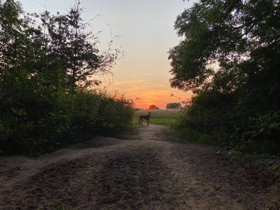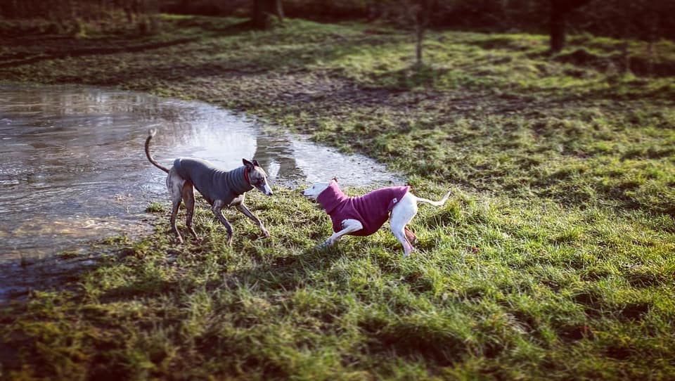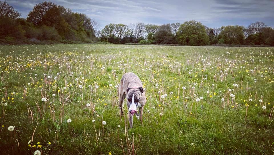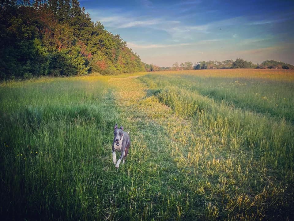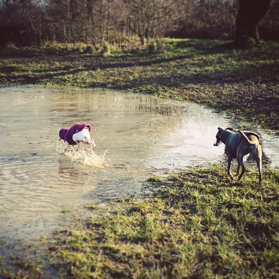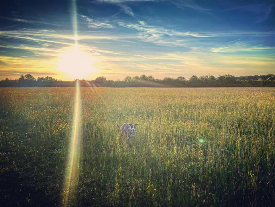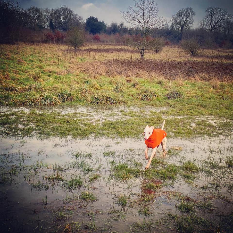 At the tall hedge that marks the end of this space, go through the gap and you officially pass the Croydon/Tandridge border and are now in the county of Surrey. A short way ahead, the grass path joins a stony path, which is part of section 5 of the London LOOP (yes, in Surrey). Turn right and walk straight until you come to a pond on the left by some trees. My dogs like to stop here for a paddle and a drink (and, in Rena’s case, a wee in the water because she is a bit gross like that).