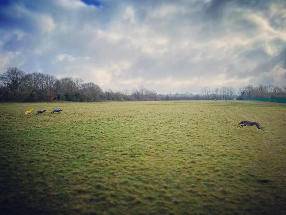 Go through the kissing gate and follow the path straight down alongside a scrubby area with small trees (called Barnfield Shaw, and a favourite place for Jett whippet to run off and freak me out) until you reach the end, which is by a primary school. Turn left and walk along the school playing field fence. Keep straight until you come to a sheltered junction of cross paths by three tree stumps. Turn left here – and almost immediately go right down a little path with a fallen tree trunk across it.