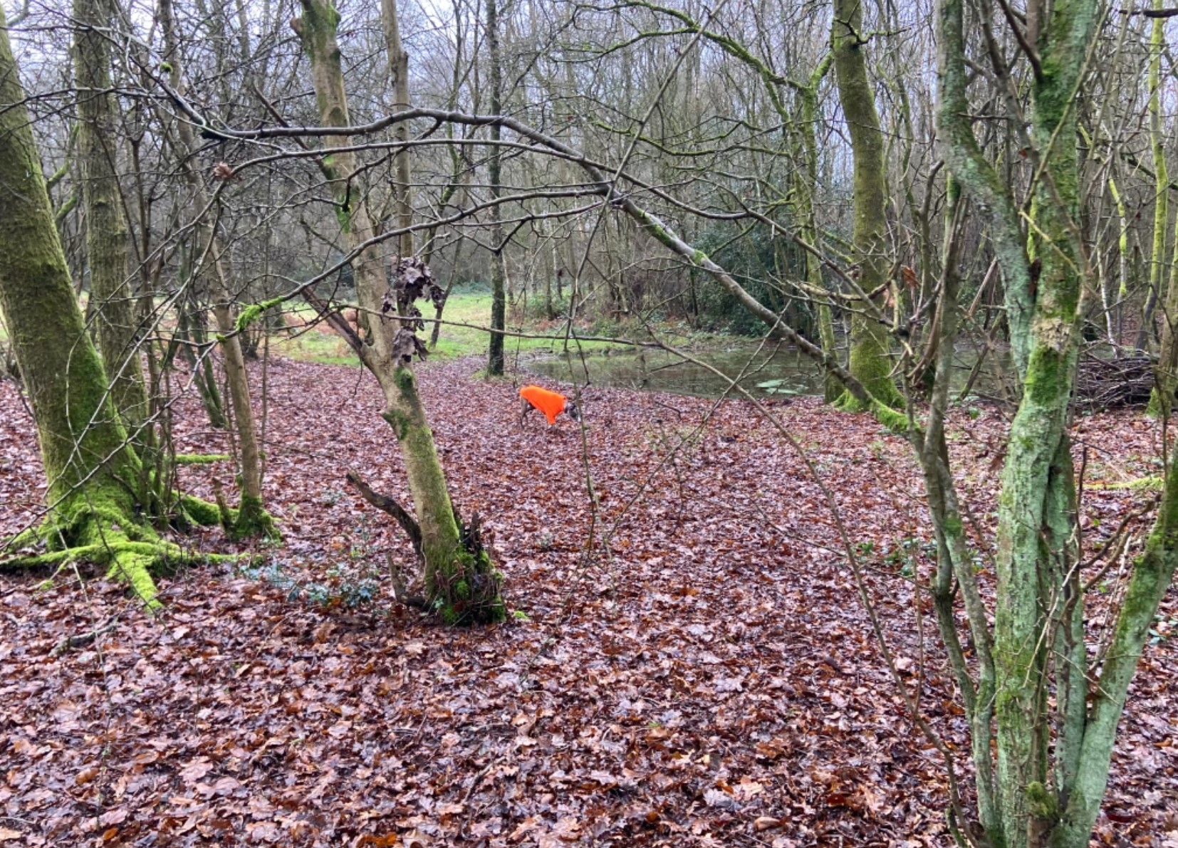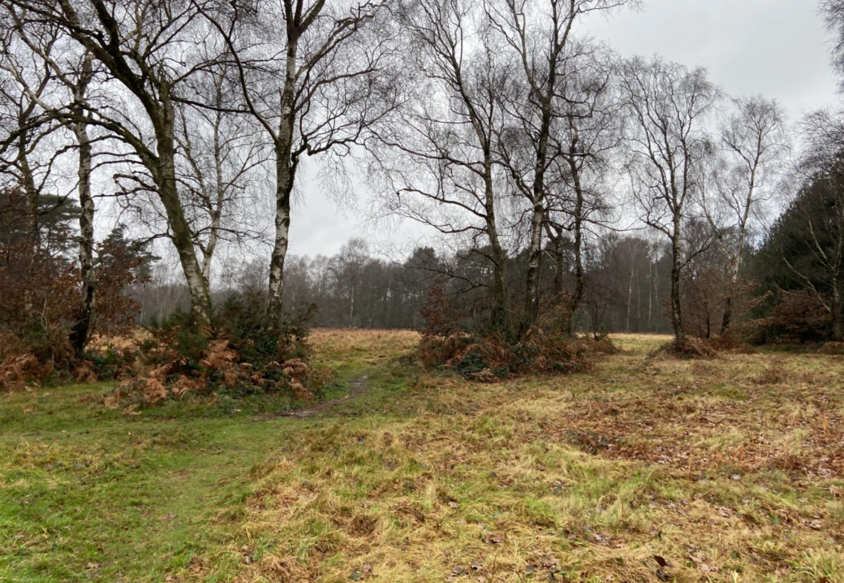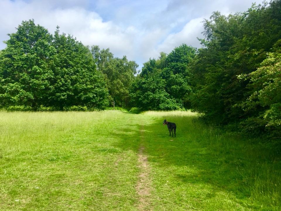 At the end of this path, bear right onto the path that cuts across. Follow this for a little way and it’ll bring you out at a clear footpath running left to right. There’s often a puddle here. Turn left and follow this path up the slope. You’ll come out of the trees and this area is often covered in ferns or grass.