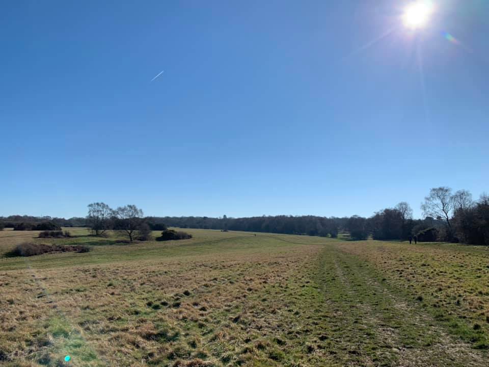 With the pub building and car park behind you, take the main footpath from the end of the lane onto Banstead Heath. Keep to the right-hand side with the woodland on your right. To your left, you’ll see a wide expanse of grassland. Walk straight ahead for quite a way until you come to a junction of paths and turn left. Almost immediately, the path heads up slightly with a clump of woodland on the right.