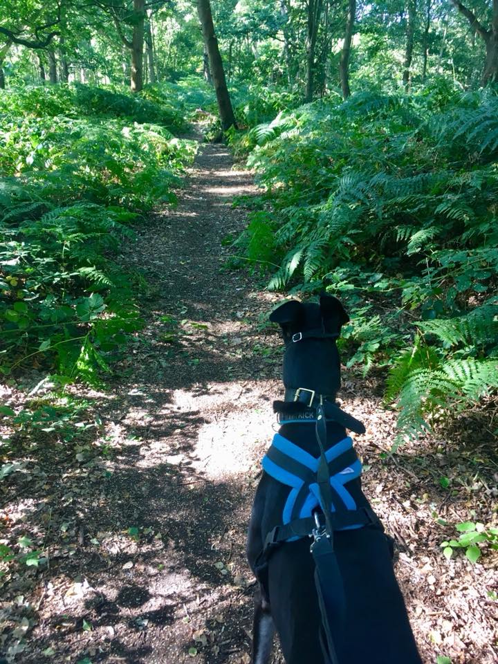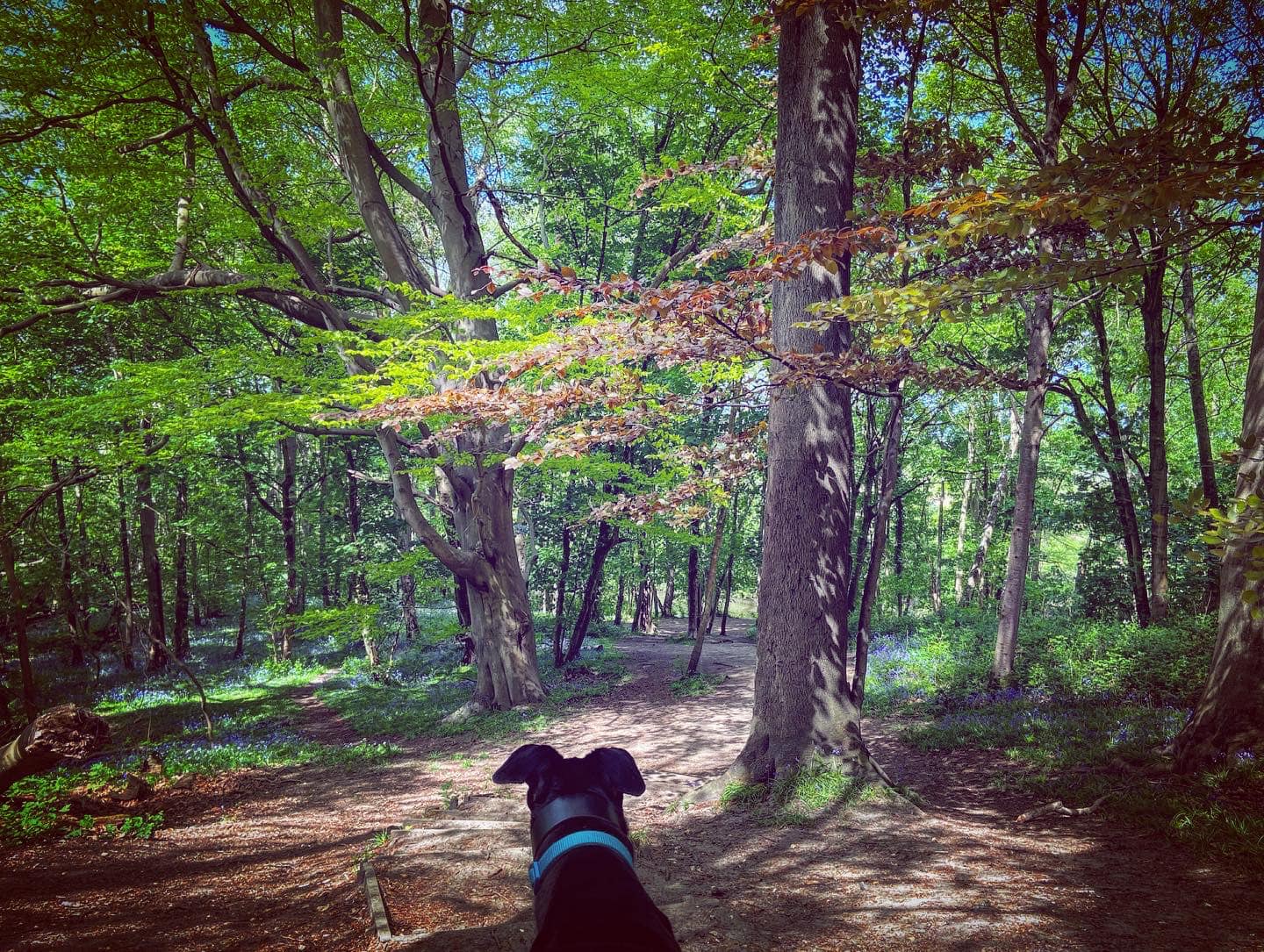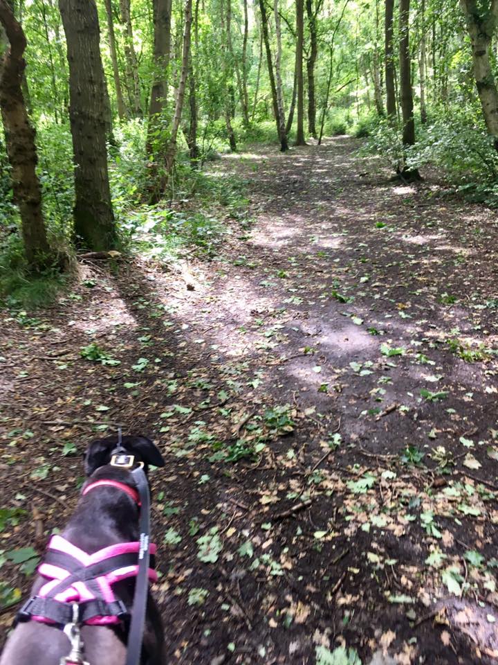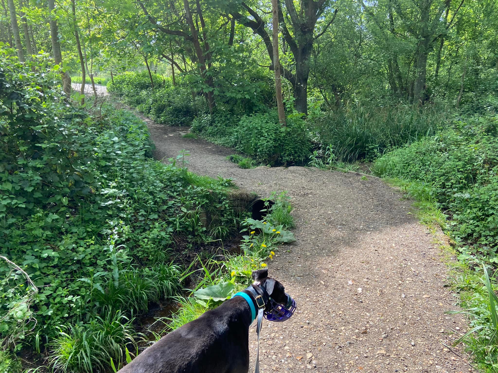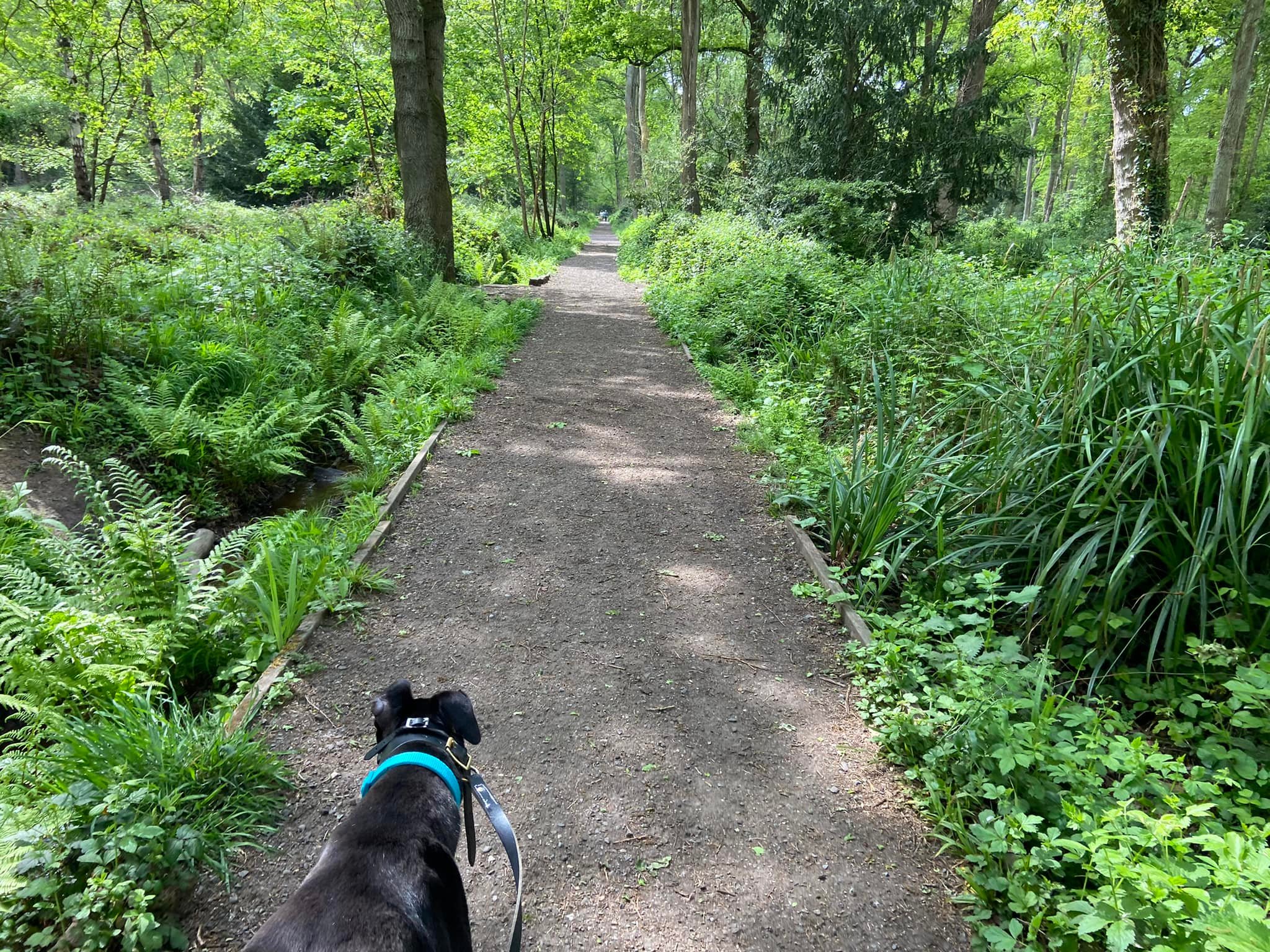 Keep your dogs on lead for this part of the walk as you want to take the path all the way to the roadside. When you reach it, one path over planks goes to the road but you want to take the other one, which also goes over planks but diagonally to the right. Walk a few more paces and then turn right to head away from the road and into the woods.