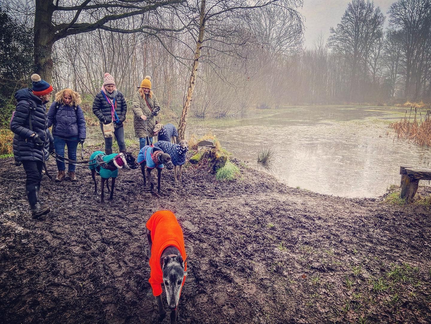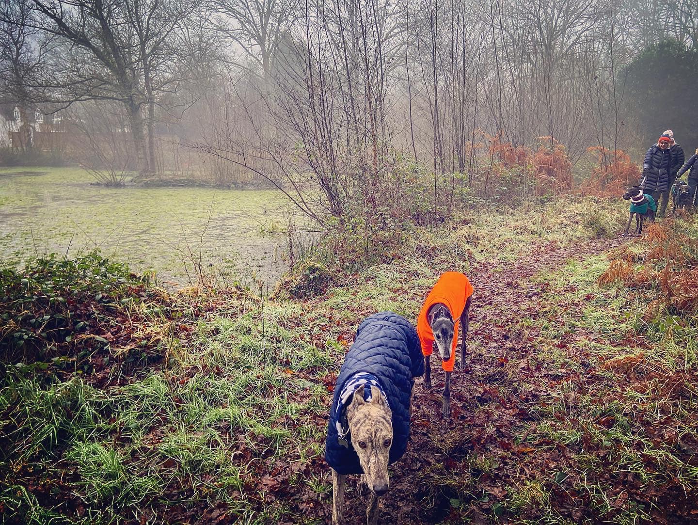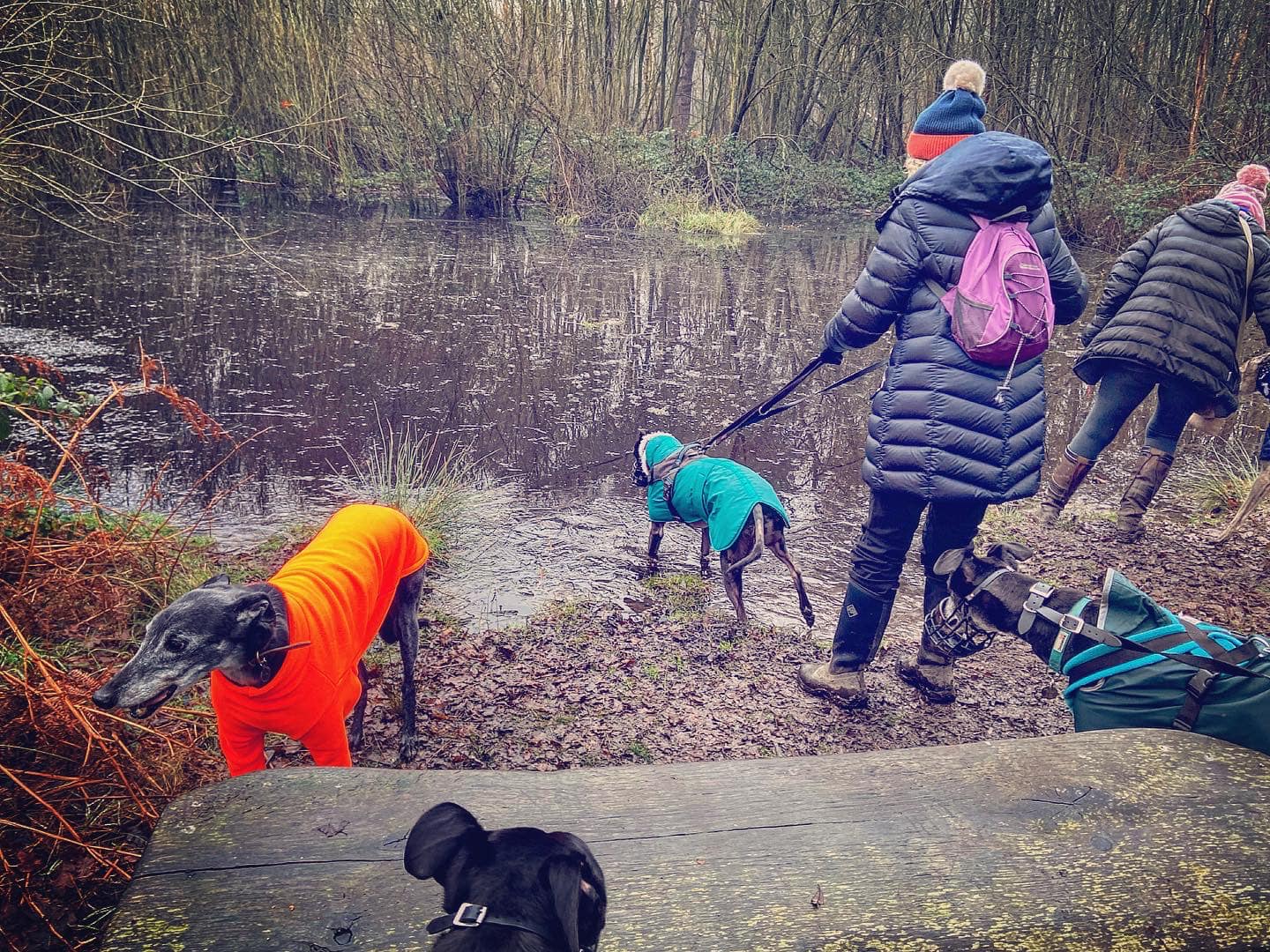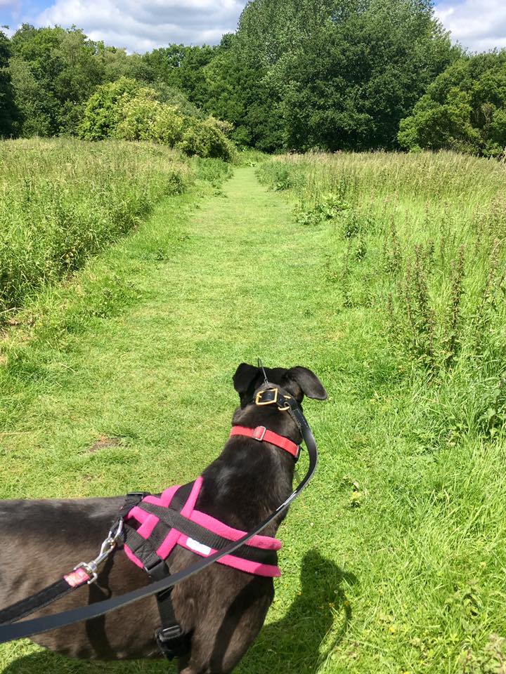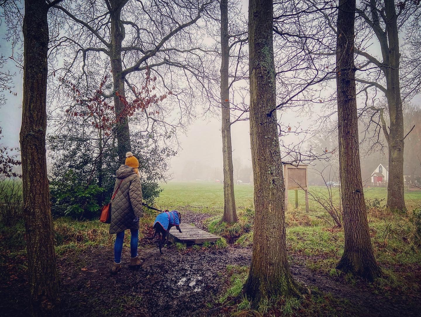 Keep your dogs on lead for this part of the walk as you want to take the path all the way to the roadside. When you reach it, one path over planks goes to the road but you want to take the other one, which also goes over planks but diagonally to the right. Walk a few more paces and then turn right to head away from the road and into the woods.