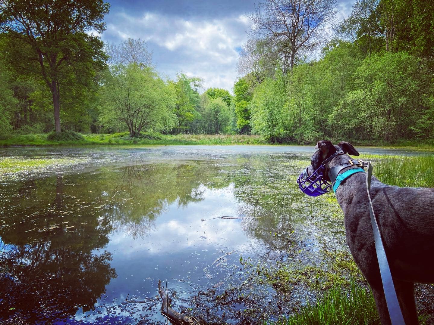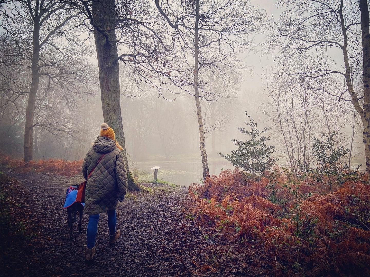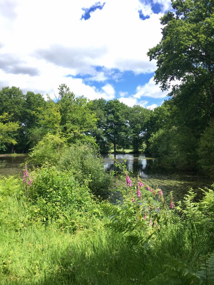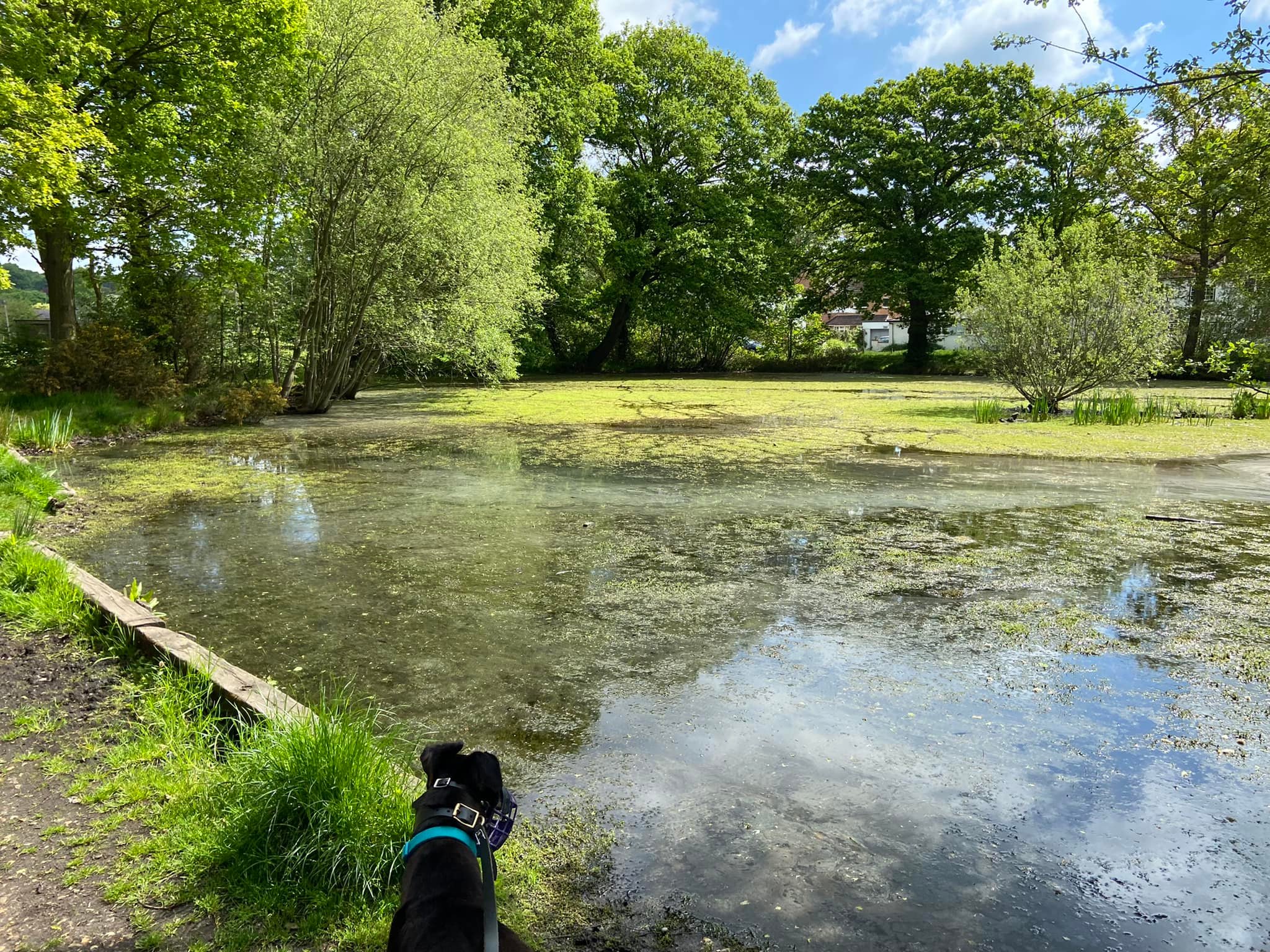 Ignore the first main path on the right next to the way marker with the blue arrow. Shortly after, there’s a bit of a clearing where paths come together. Traverse diagonally across it, passing some stumps, to a small path over a wooden plank bridge. Go right at the fork to Lardy Pond. When you’re done here, you can follow the path that goes along the left-hand side of the pond, which should take you back to the main path but this is often very overgrown and boggy so you may prefer to turn back the way you came and retrace your steps from the pond to the main path, turning right onto it and down to the car park.