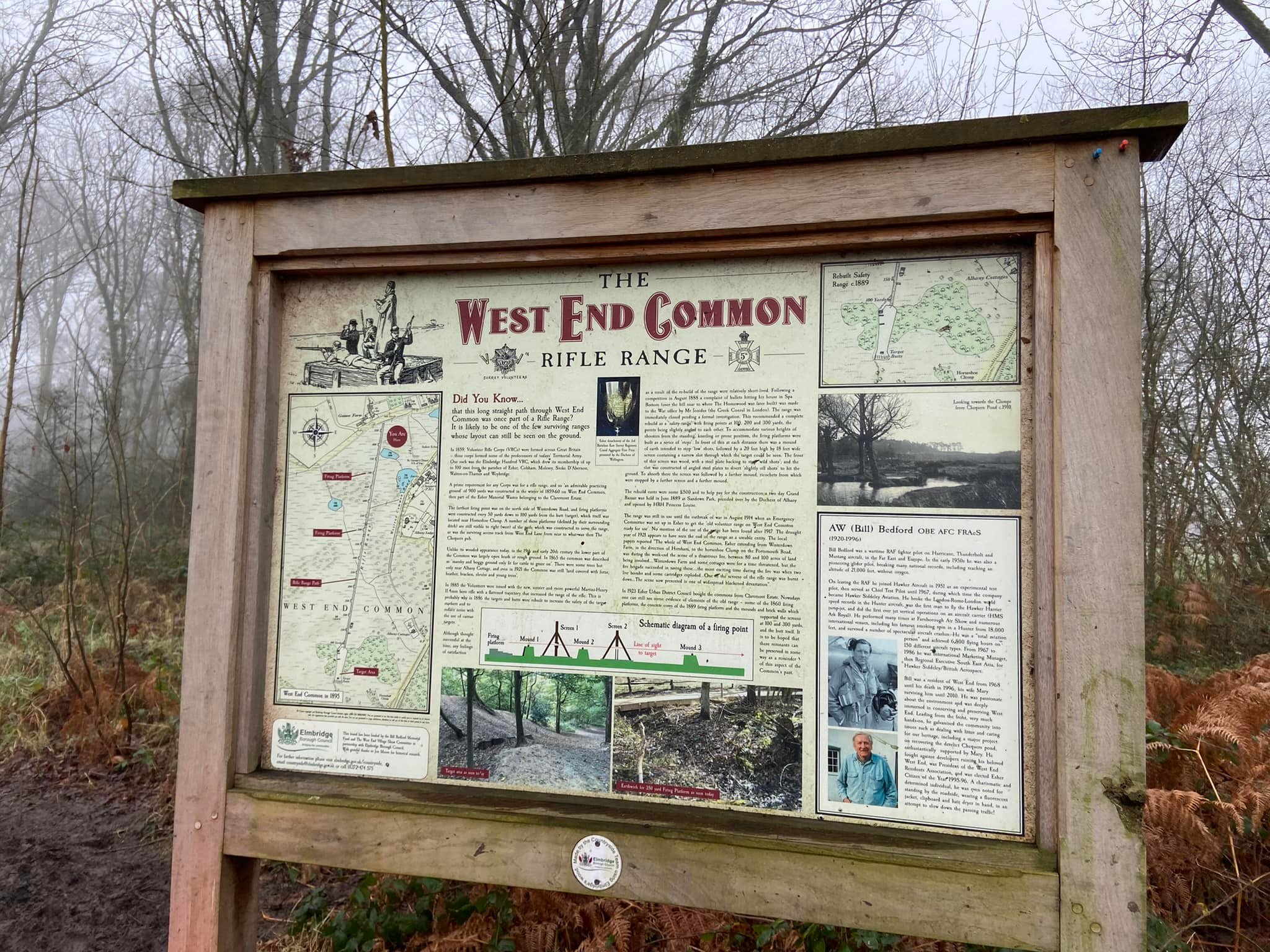 This path used to be part of the rifle range mentioned on the information board and is one of the very few surviving ranges where the layout can still be seen on the ground. Constructed in the winter of 1859-60 when there were no woods on this part of the common, it was 900 yards long with firing platforms every 50 yards down to 100 yards from the target. The range was in use until the outbreak of the First World War in 1914.