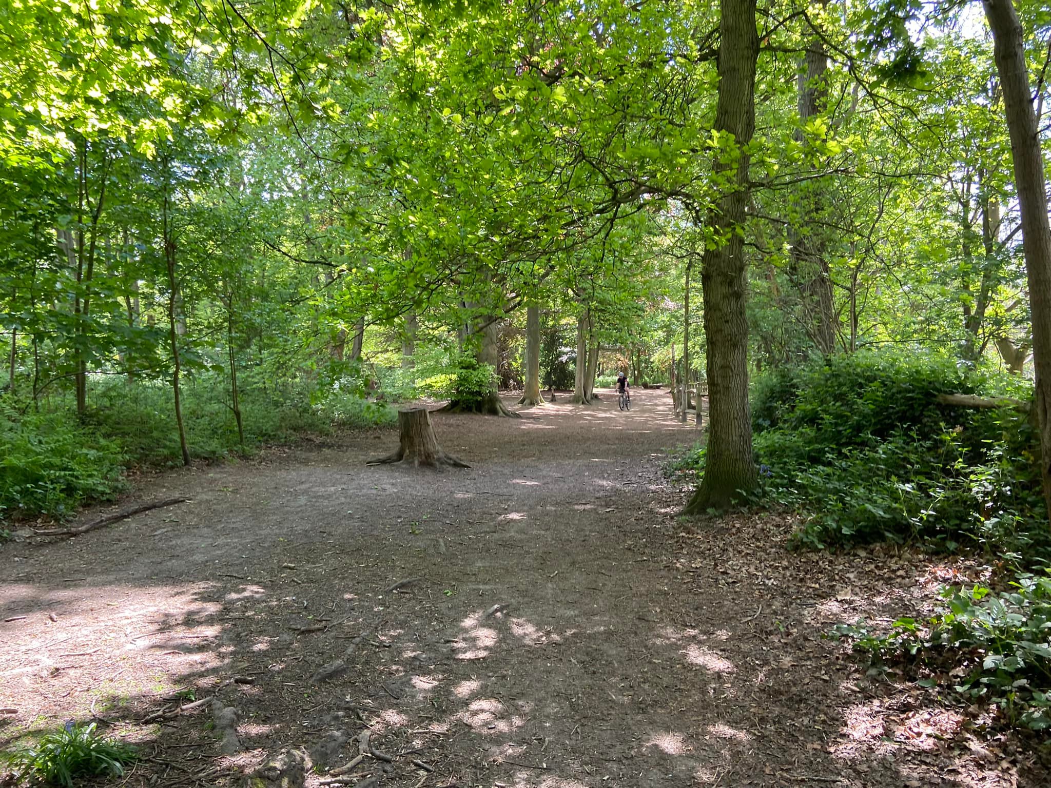 Towards its end, this rifle range path curves sharply to the left and if you look over the foliage to your left, there’s Ash Pond but it can be hard to see as it has lots of aquatic plants and reeds. The path then goes up a few steps and through a wooden barrier.