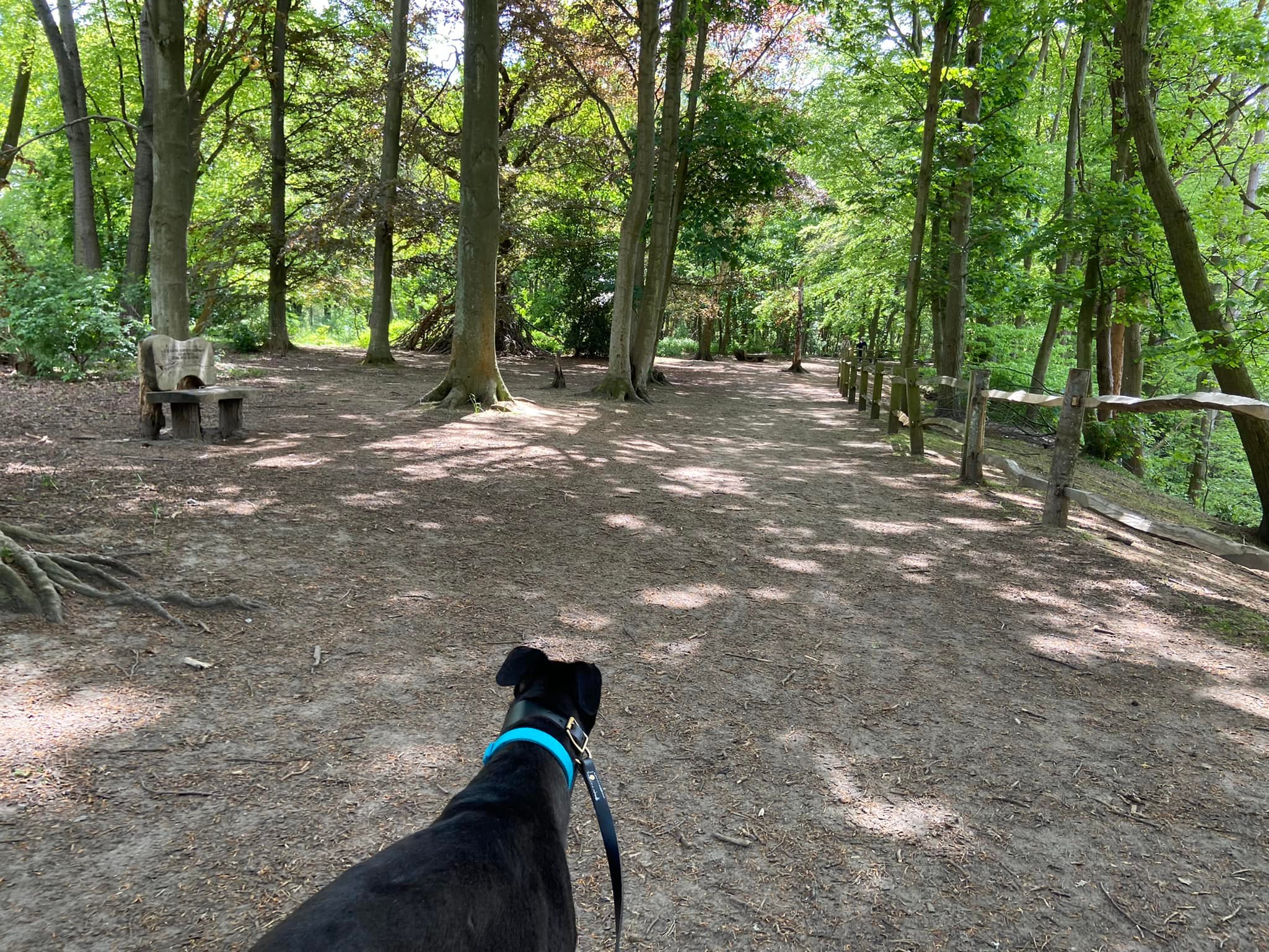 When you come to the junction of paths at a large tree that has some stones marking the path edges, go straight across and continue ahead. (The path left to right is long and extremely straight and you will walk down it later!) You are now heading towards the road so if your dog is off lead, put it back on.
