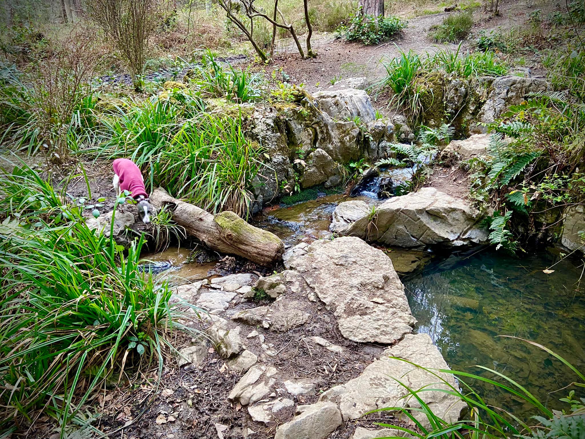 Follow the path round and then down hill. Its route is largely straight, give or take a few wiggles, and skirts the stream on the left. You’ll pass some pools and little waterfalls. As you head down, you’ll come to a more impressive waterfall (but still quite small so manage your expectations) that drops into a pool surrounded by large boulders. These are the rocks from Cheddar Gorge.