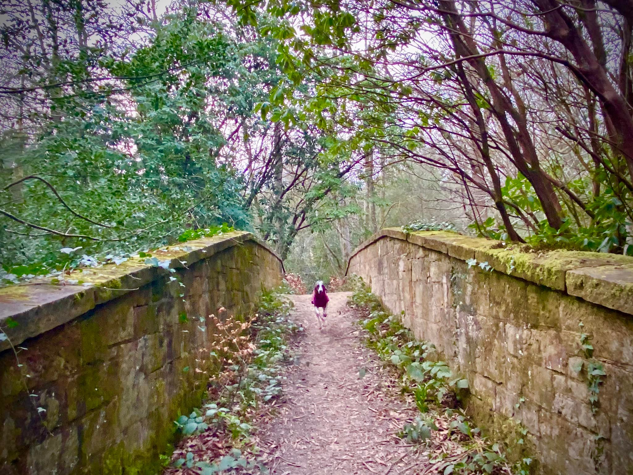 When you’re ready to move on, turn right at the end of the path that has brought you down the side of the waterfalls. Presently on your left, there is an information board about Chelwood Vachery. Pass this and continue ahead, and then the path will curl round to the left and go through the arch of the Folly Bridge, down to the Millbrook stream.