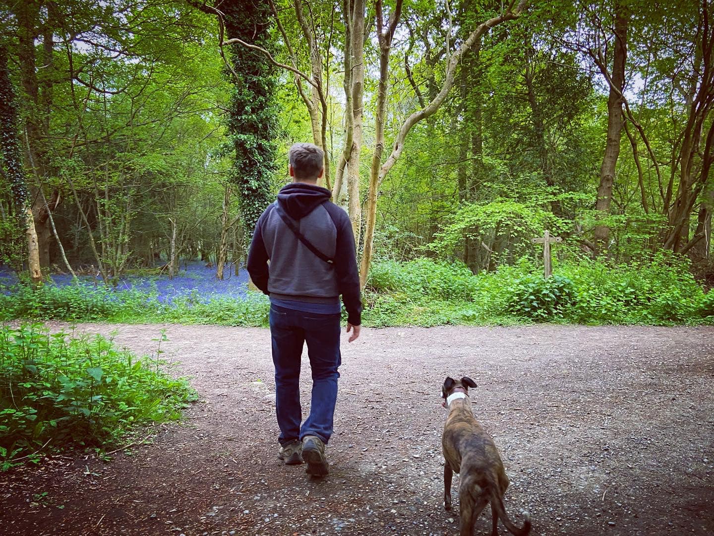 Cross over the access driveway/track and continue straight ahead for a very short distance on the grass. At the next tarmac lane, turn right and follow the lane down through trees and round to the right. In the late springtime, you’ll be treated to bluebells in the woods either side.