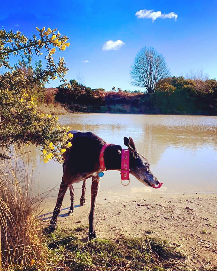 After a bit of a way, a path will head off to the right and, shortly after that, another leads off to the left. Take this left-hand path. It will bend round to the right and continue straight, running parallel with the airstrip. (You can stay on the airstrip if you prefer as our route brings us to it again in a bit, but I think this little detour is a bit more interesting than a long straight). You’ll pass a pond on the right, which is the final water feature for dogs that like a splash about.