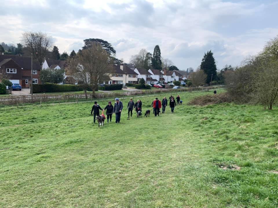 In the Holly Lane car park, stand with the road behind you. You want to exit the car park in the far right rear corner, through a kissing gate next to a green poo bin that takes you into a grassy field.