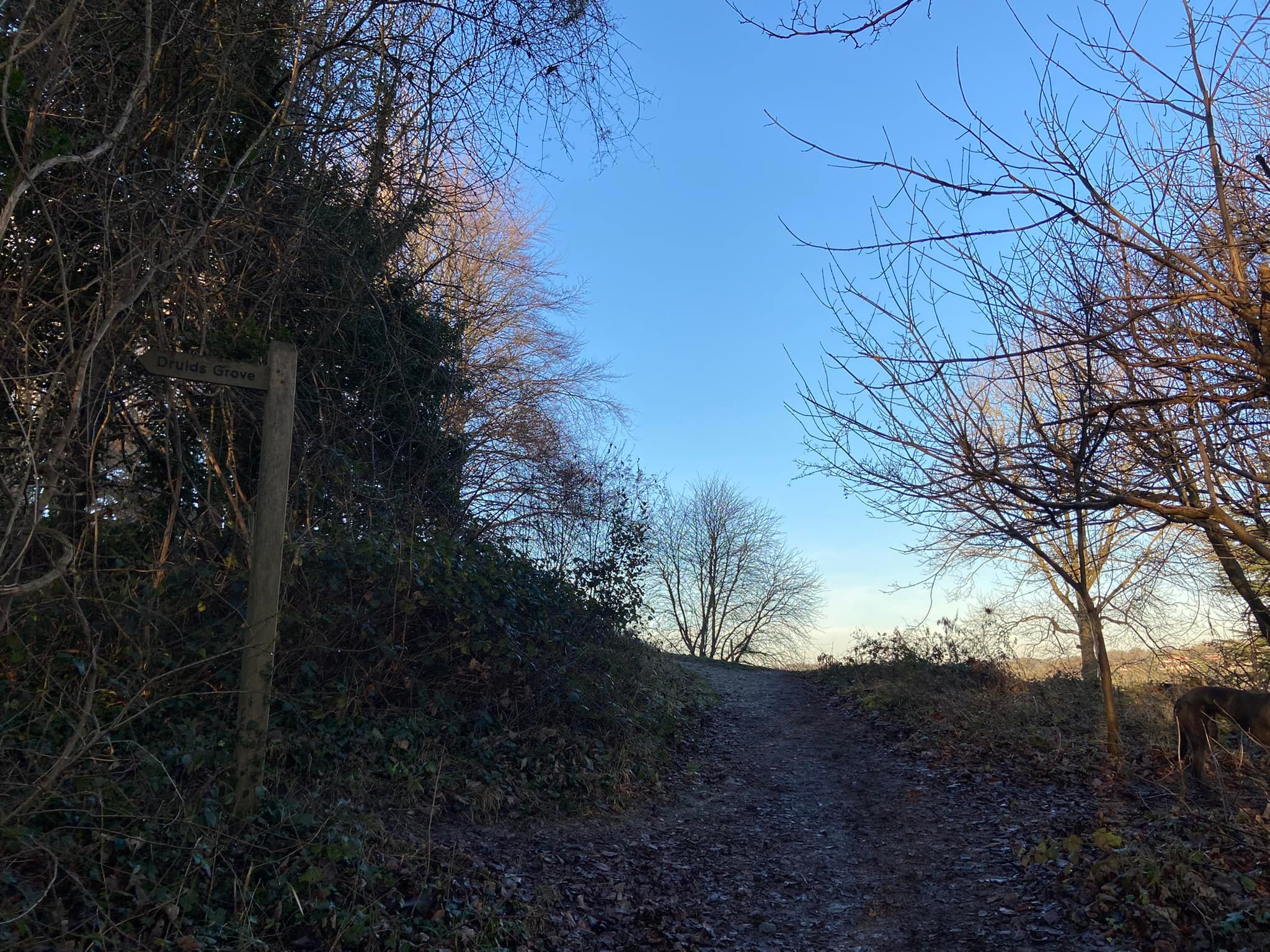 As you reach the top of the hill, the path starts curling to the left. At the top, you’ll exit the trees by a finger post* pointing left to Druids Grove, where the majority of the old yew trees in Norbury Park are located. (If you decide to detour here for a look, be mindful that it’s a fairly long way down the little path, which is narrow and can be steep in places. Another way to get to Druid’s Grove is described on my Norbury Park West post.)