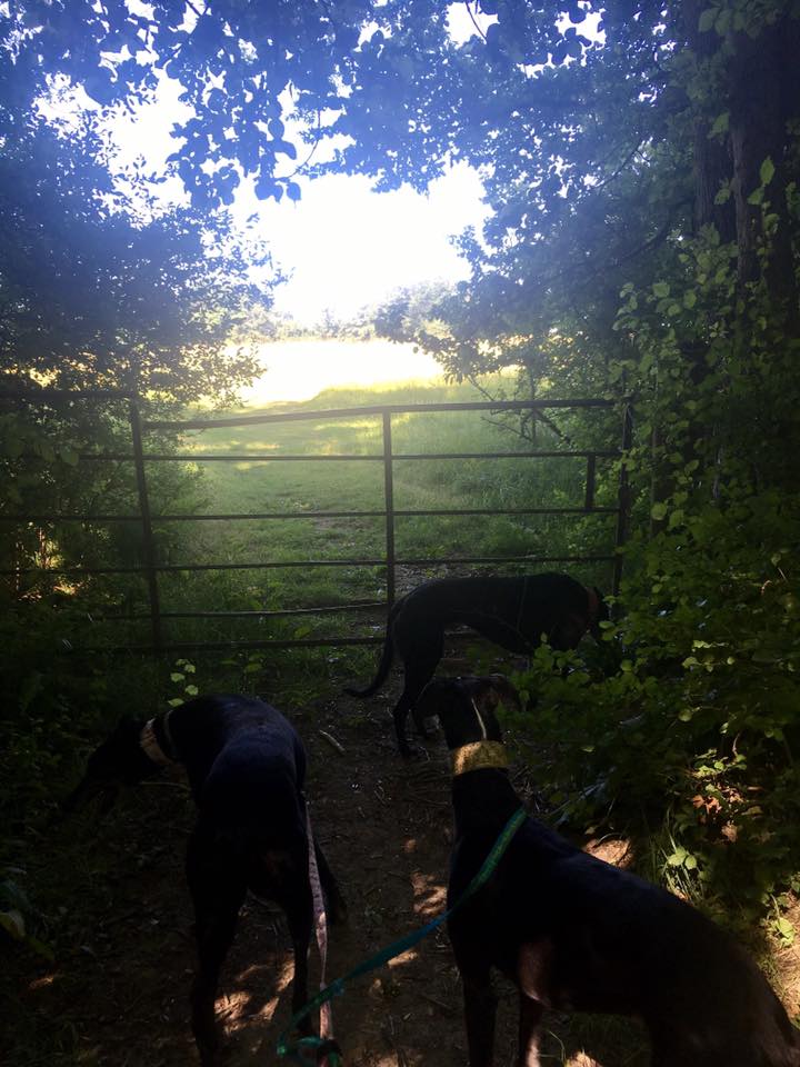 Go through the gate at the end of the trees and walk straight through the middle of the field. At the fork partway across the field, keep straight on the right path, ignoring the one that curves off to the left towards the farm and its fence/hedge. Continue straight and go through the rusty double gate (usually open) at the field boundary ahead. Here, continue straight ahead along the left-hand edge of the field with trees on the left, ignoring the path that goes off diagonally to the right.