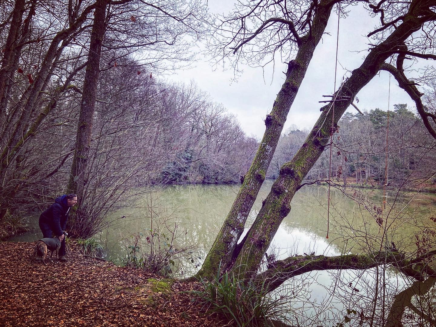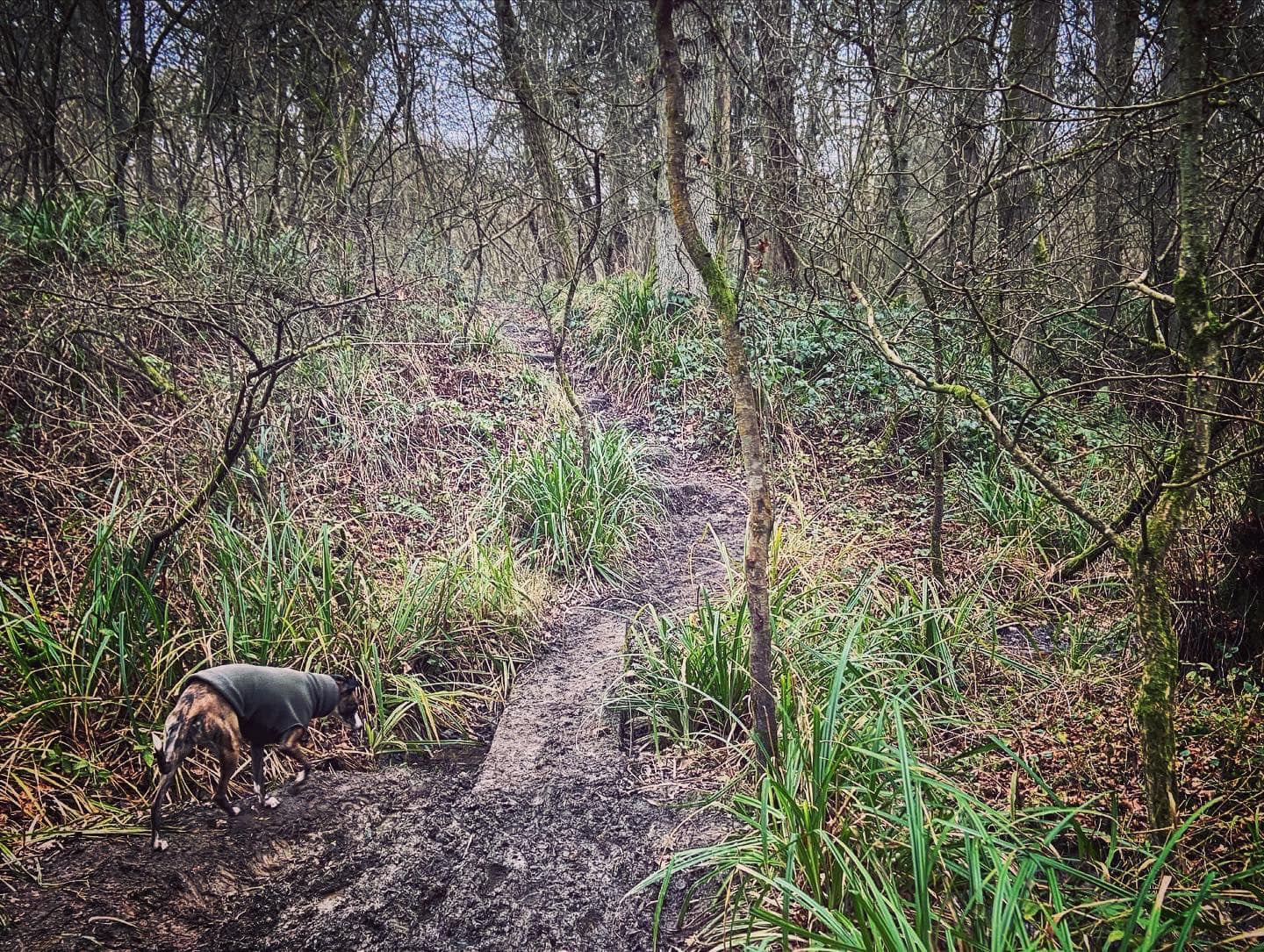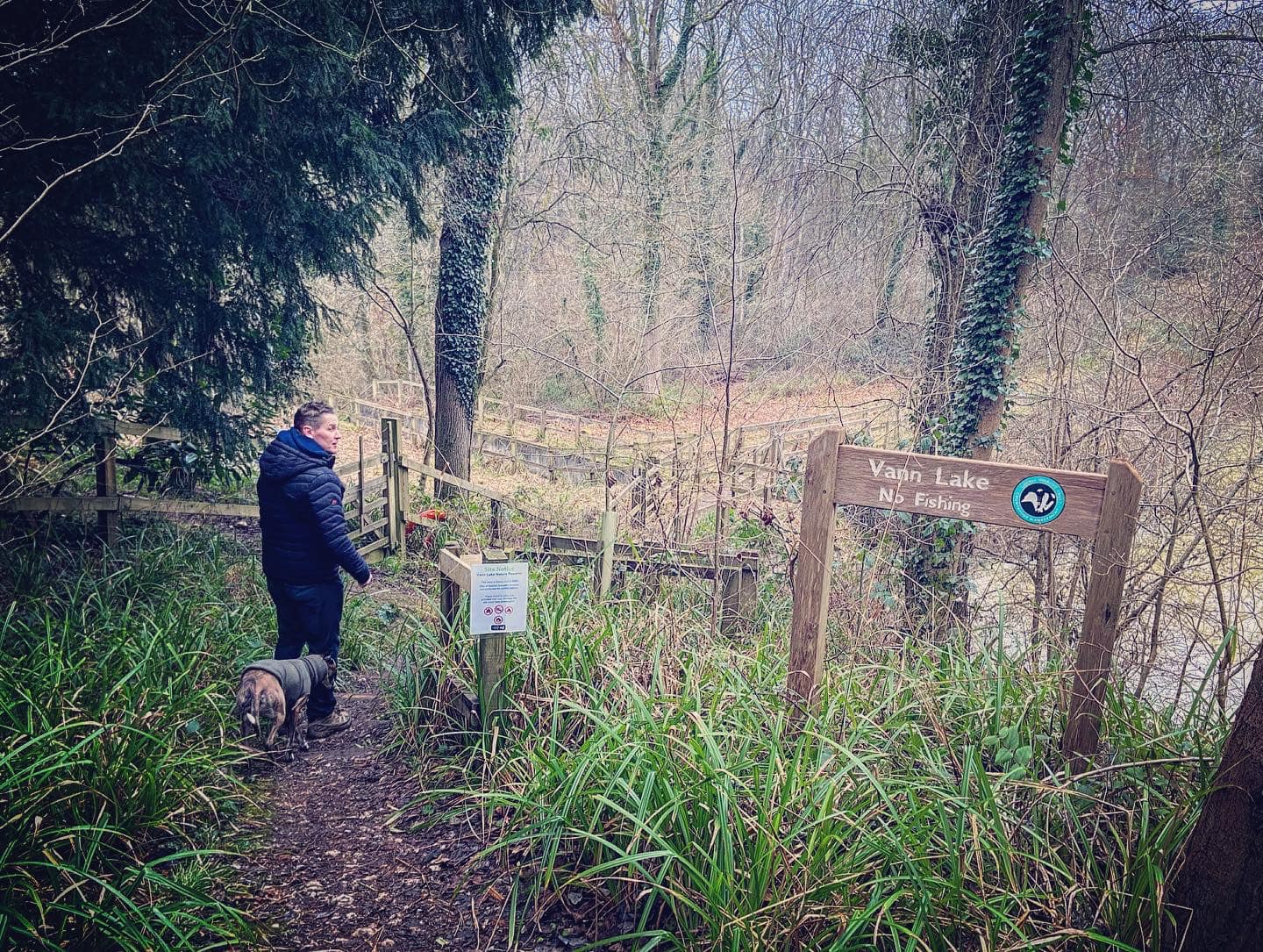 Take care going around the fallen tree. Pass another sign for Vann Lake (on your right) and then a bizarre little stretch of low wall which runs a very short way along the right hand side of the path. Take care going over another fallen tree. The path goes very close to the lake edge for a bit – mind your footing on the tree roots of a few trees that it goes over. The path will rise up at a fallen tree (on the right) and there is a fork. It doesn’t matter which fork you take here – the one down to the right is muddier and has tree roots to navigate and the one to the left stays high but then has a short but steep dip down. They converge at a little wooden bridge. Cross the bridge and go up the steps – it can be extremely muddy here.