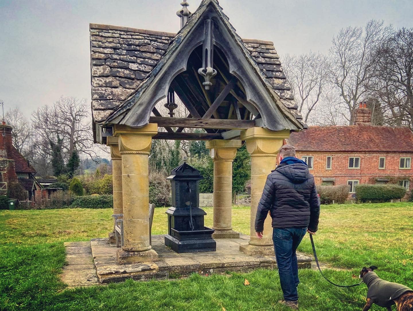 Park in the large car park for the Inn on the Green. Exit the car park and turn left, cross the road opposite the pub and walk straight down the drive, passing the pump on the green on your left. This is called Scott’s Well and was installed as stipulated in the will of a woman called Jane Scott, who died of tuberculosis in 1838 at the age of just 39. Jane’s legacy was ensuring a supply of water to the Parish of Ockley, and the construction of the village school. The pump was still used until the 1950s.