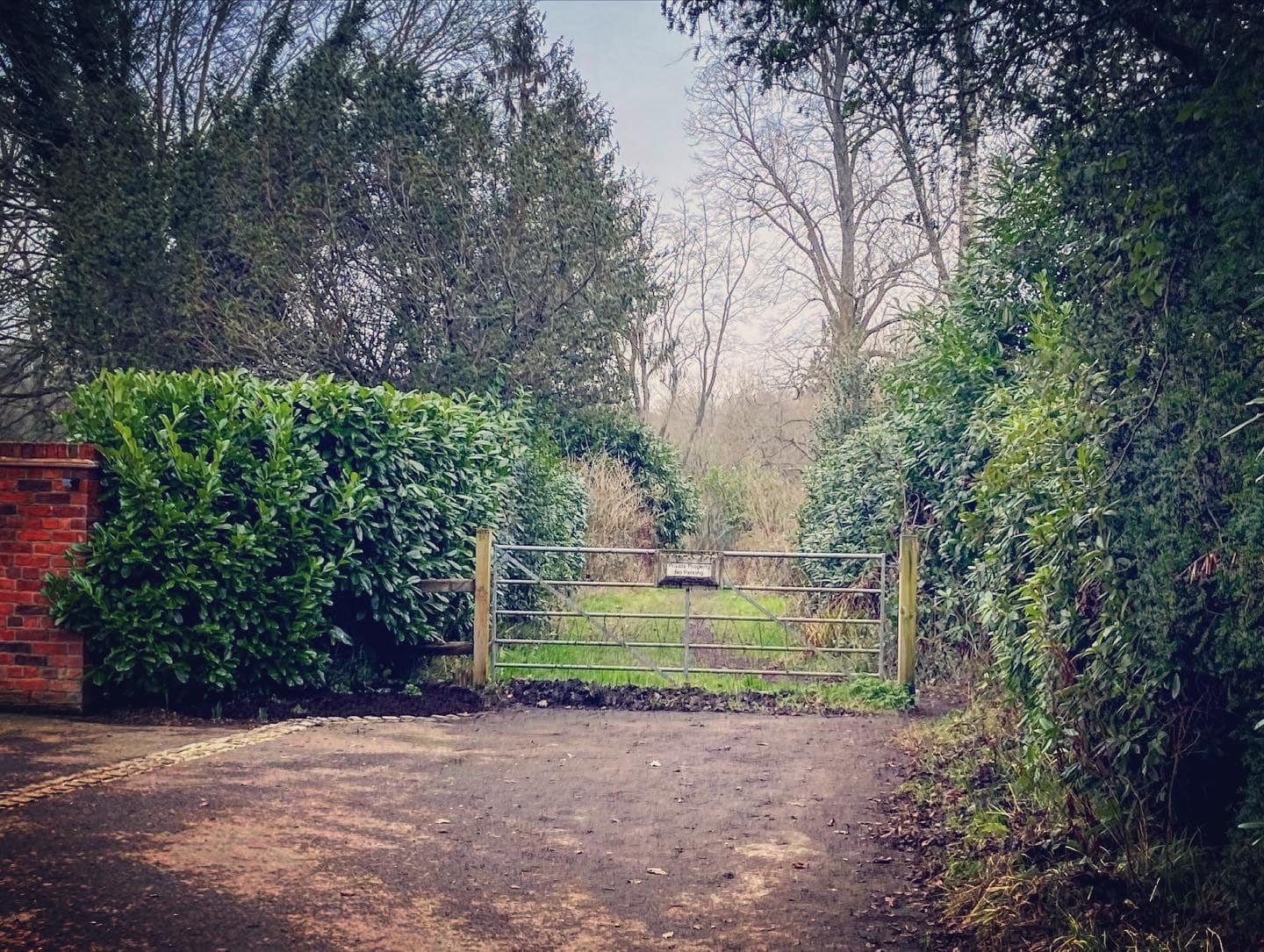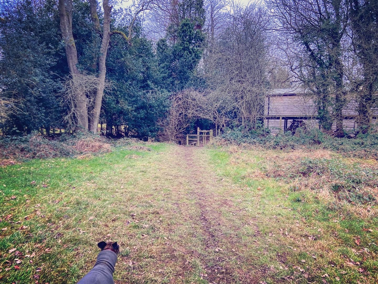 Turn right when you get to the T junction at Vann House, which used to be the marital home of Katie Price and Peter Andre and featured in their TV show Katie and Peter. Ignore the footpath that comes off to the left and goes down the right-hand side of Vann House. Instead, continue straight along the lane with green fences on either side. Go around the the vehicle gate at the end and onto the footpath.
