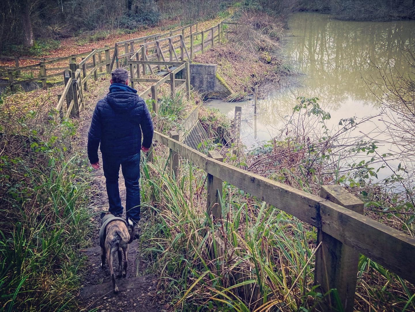 Cross the bridge over the stream and head up the slope. Take the left hand fork at the finger post and follow it round to the left and onto the lane. Just after Rill Barn (on your left), there’s a wooden fence on the left with a wooden vehicle access barrier upon which there’s a black circle with a yellow arrow. Take the little path to which the arrow points on the right hand side of the post and follow it down steps to Vann Lake. Cross the bridge and walk along the bottom of the lake.