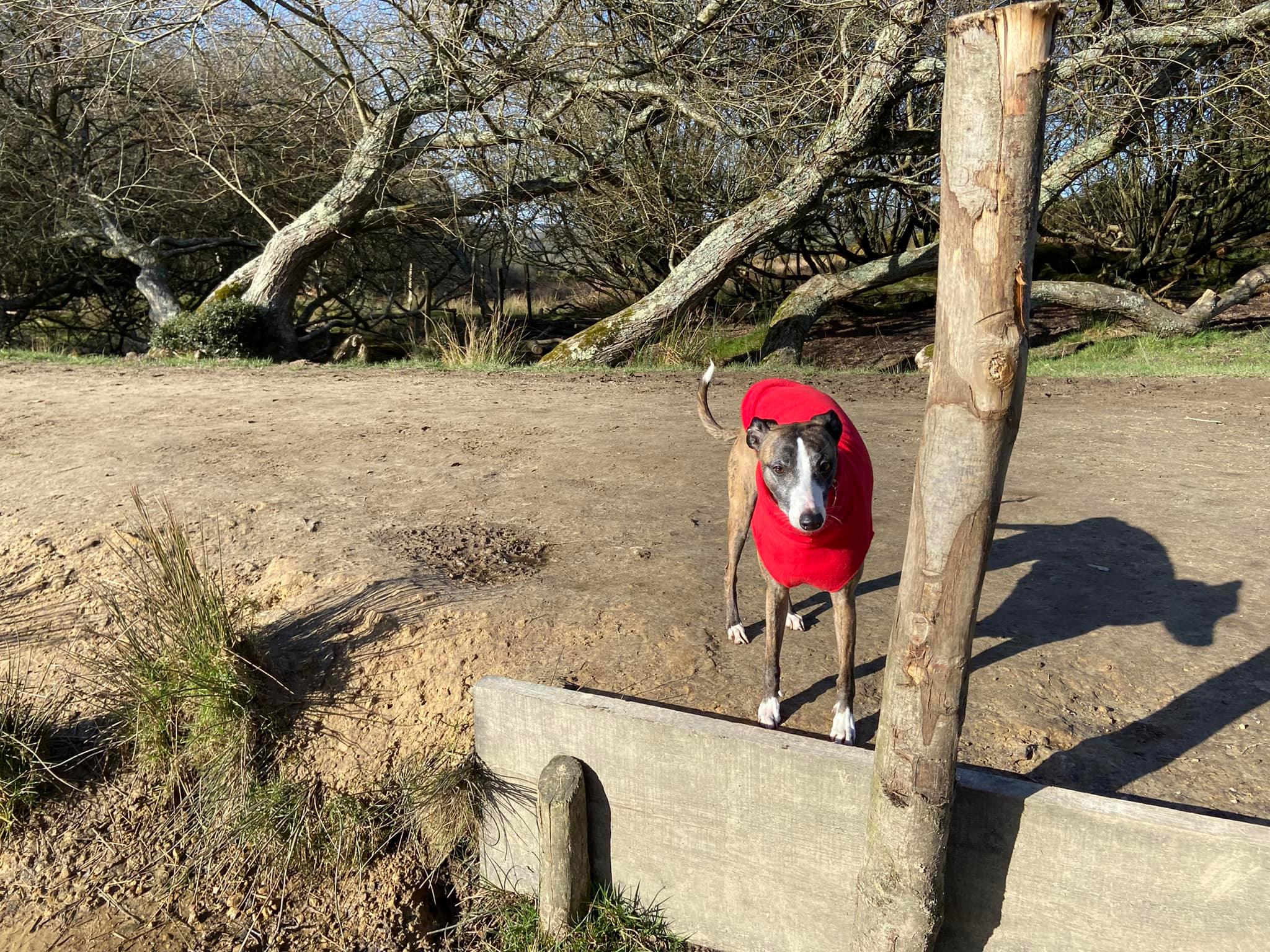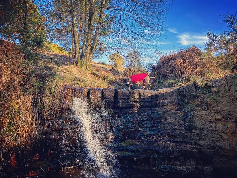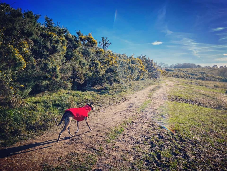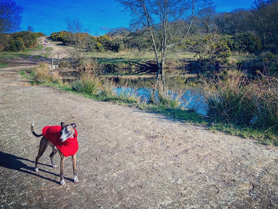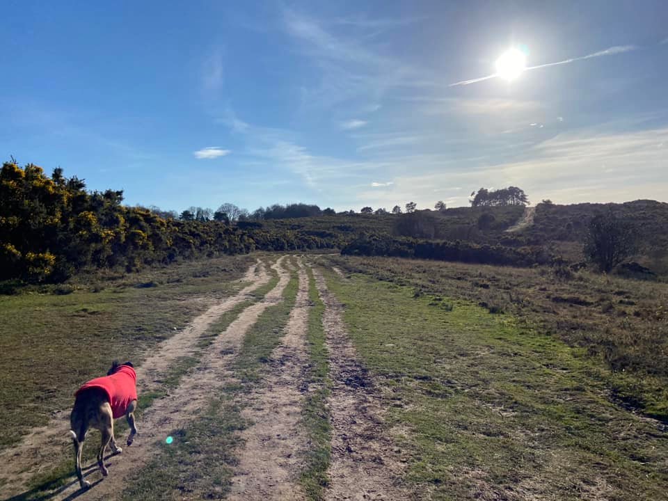At the next fork, take the left-hand option. Go either side of the gorse bush in the middle of the path and at the next fork, take the lower one on the right. Both head to the same path so it doesn’t matter too much if you get the wrong one but this path is a gentler gradient. This whole area is very open – and that means very blowy on windy days (quite exhilarating!) and there’s no respite from the sun in the summer so go early before it gets too hot for dogs. You’ll head through another section of gorse bushes. Keep right and you’ll emerge out onto a grassy area by a little pool, which makes for a welcome slurp for dogs.