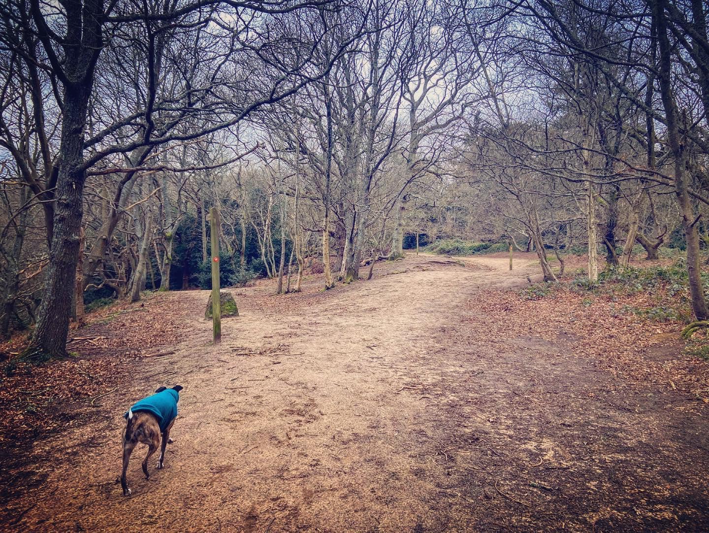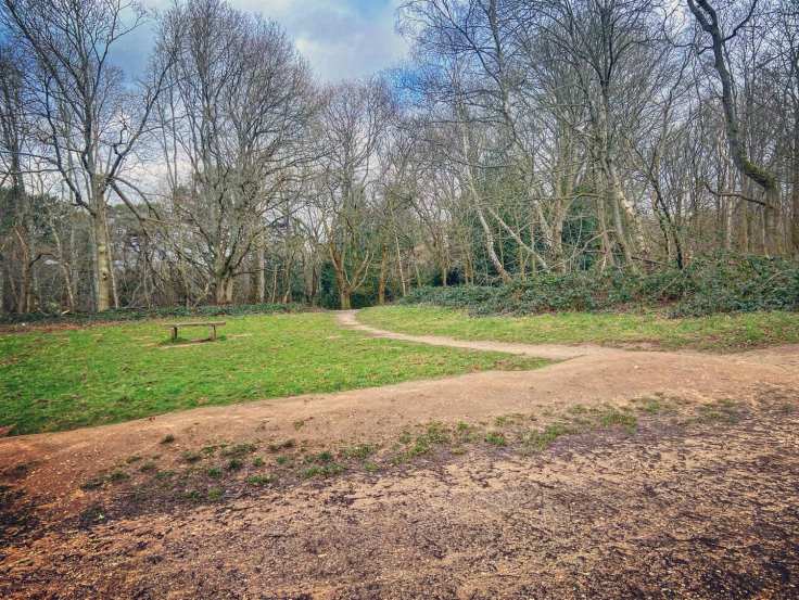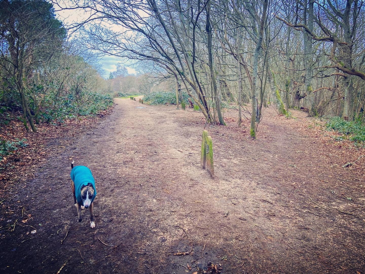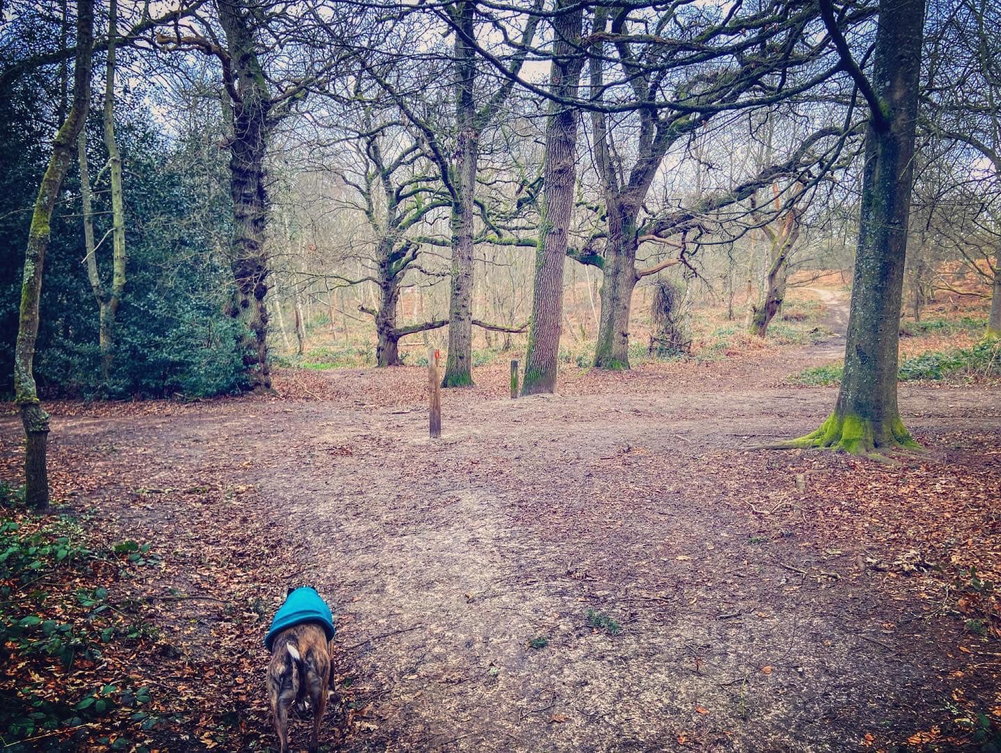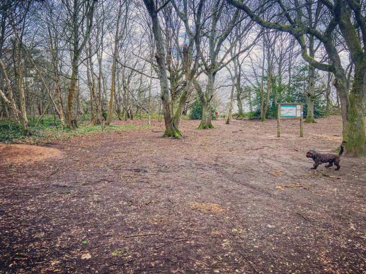 When you’re done, continue through to the gate at the other side of the churchyard. Here you want to take the wide main path ahead and slightly left down the hill. Pass the grey and green electricity boxes (on the right) and a finger post, and go downhill on the main path, which is edged for a little way by wooden slats. Ignore the next path to the right – just keep going. Jett and I walked this route just after the storms in February and, at the time of writing, a tree was down across the path. Walkers have made a way around its root ball but it’s such a major obstruction, I expect it’ll be cleared so there may or may not be a fallen tree to go around here!