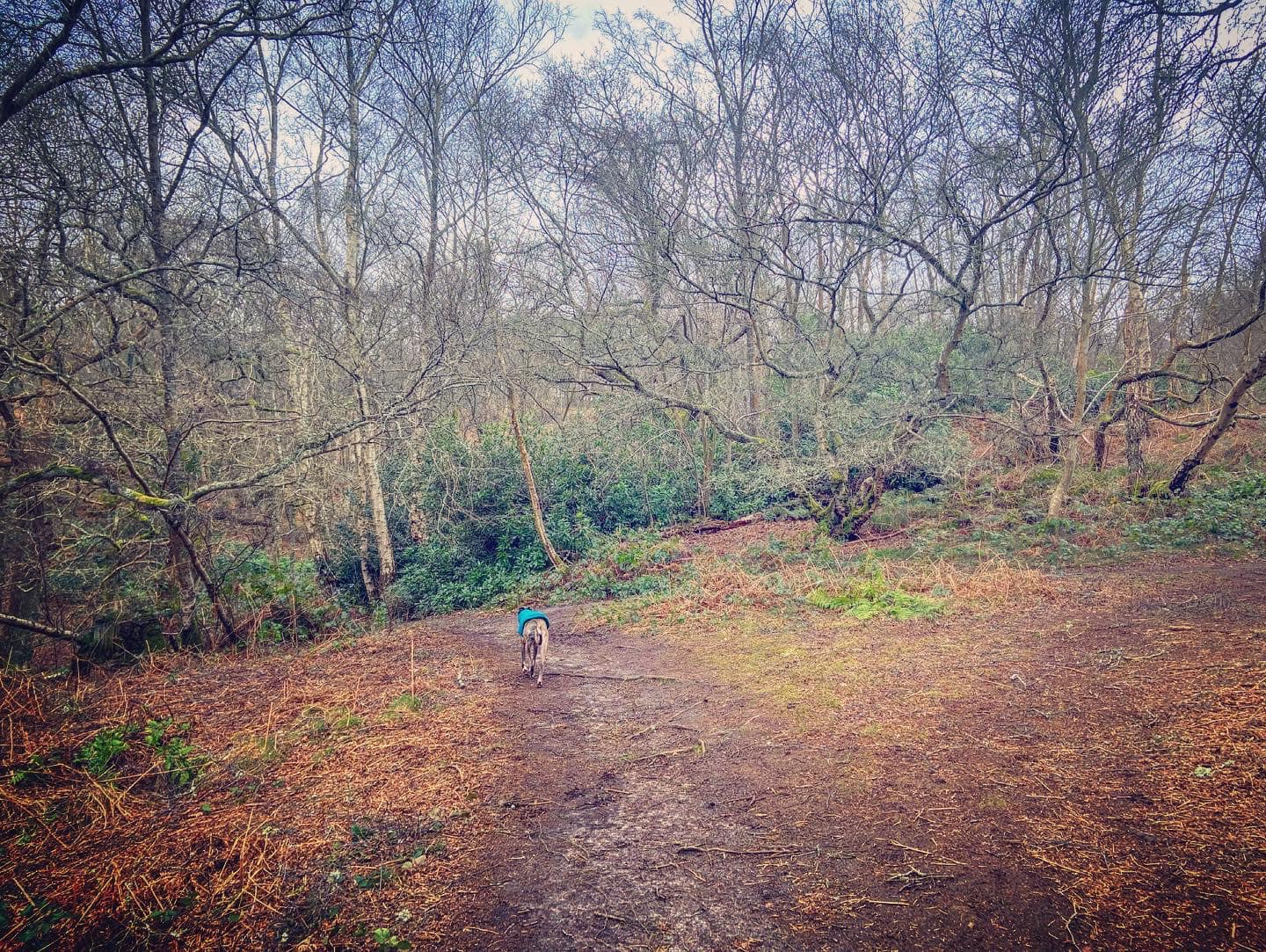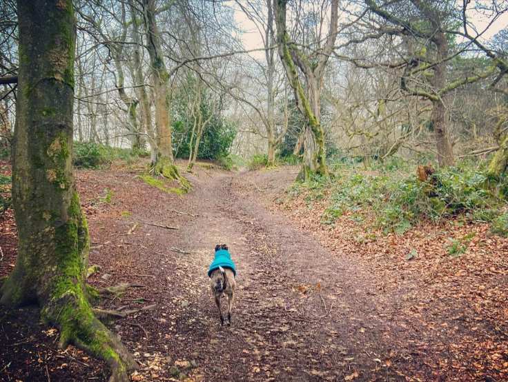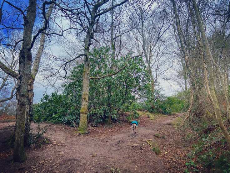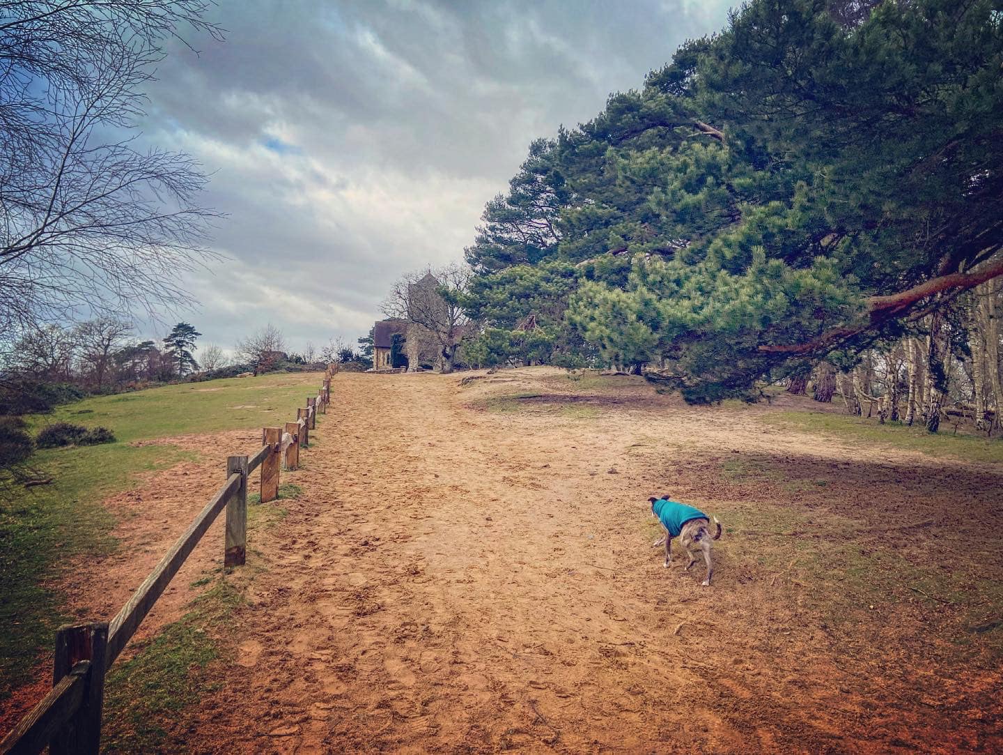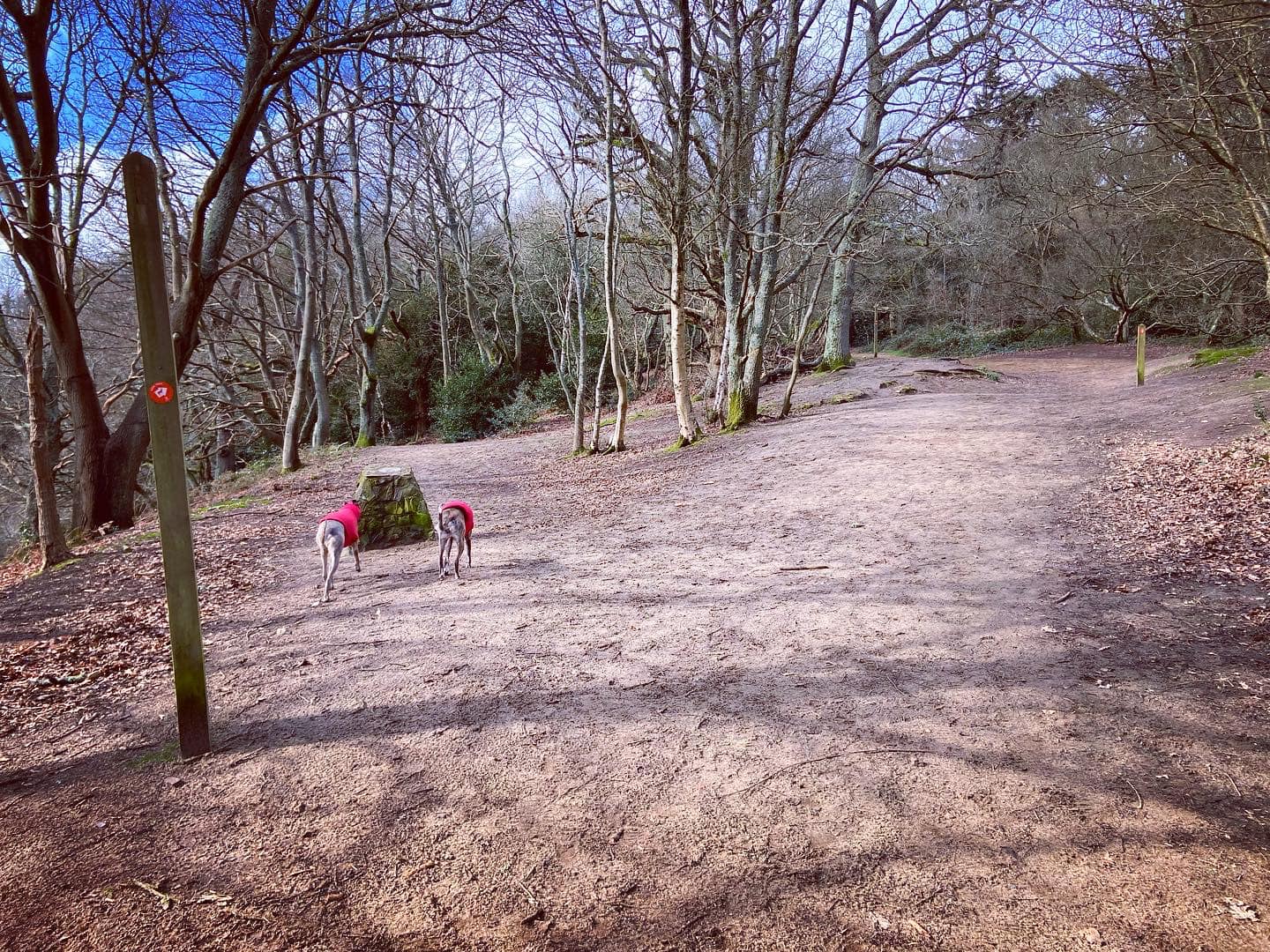 When you’re done, continue through to the gate at the other side of the churchyard. Here you want to take the wide main path ahead and slightly left down the hill. Pass the grey and green electricity boxes (on the right) and a finger post, and go downhill on the main path, which is edged for a little way by wooden slats. Ignore the next path to the right – just keep going. Jett and I walked this route just after the storms in February and, at the time of writing, a tree was down across the path. Walkers have made a way around its root ball but it’s such a major obstruction, I expect it’ll be cleared so there may or may not be a fallen tree to go around here!