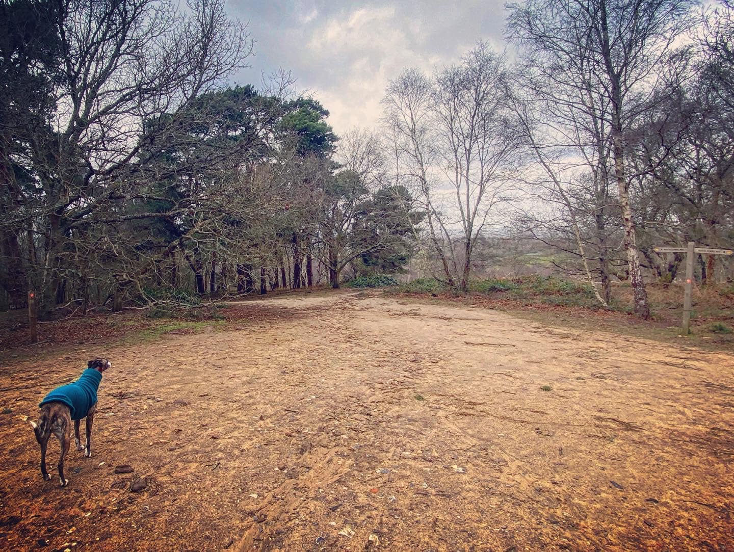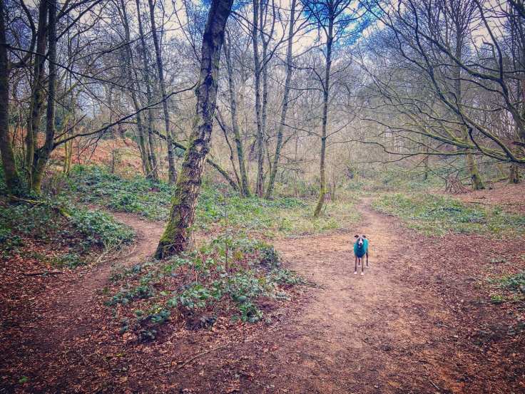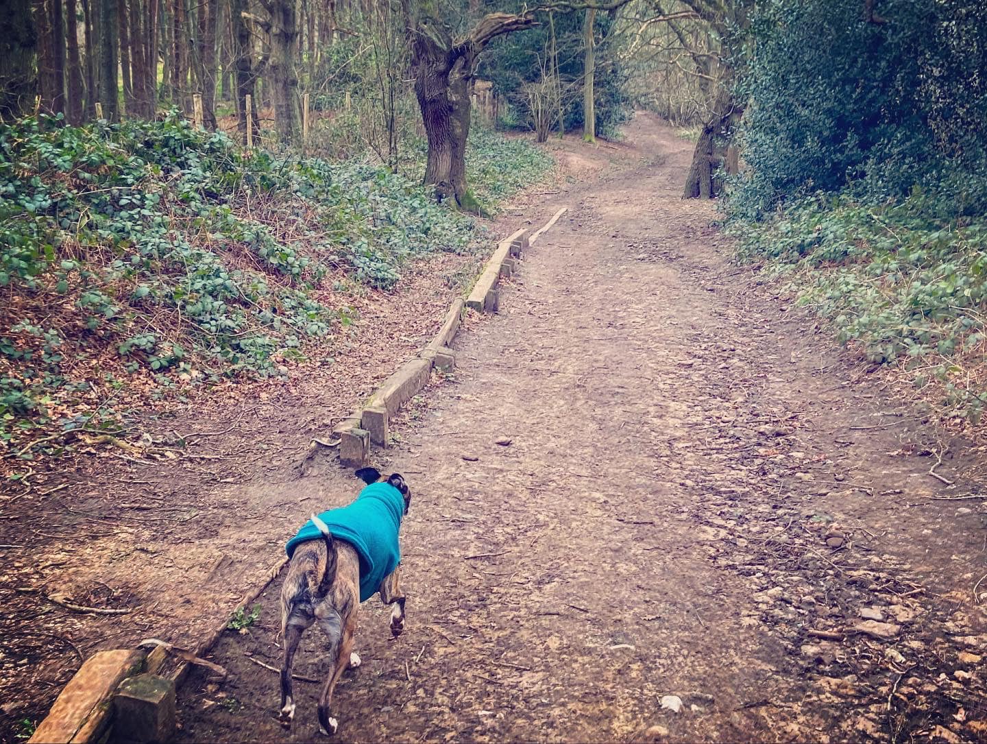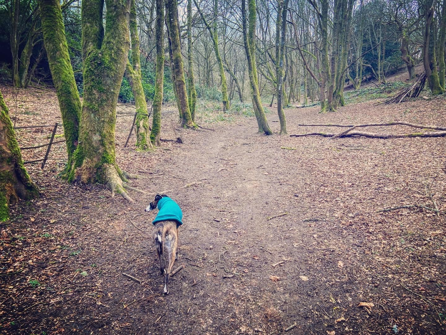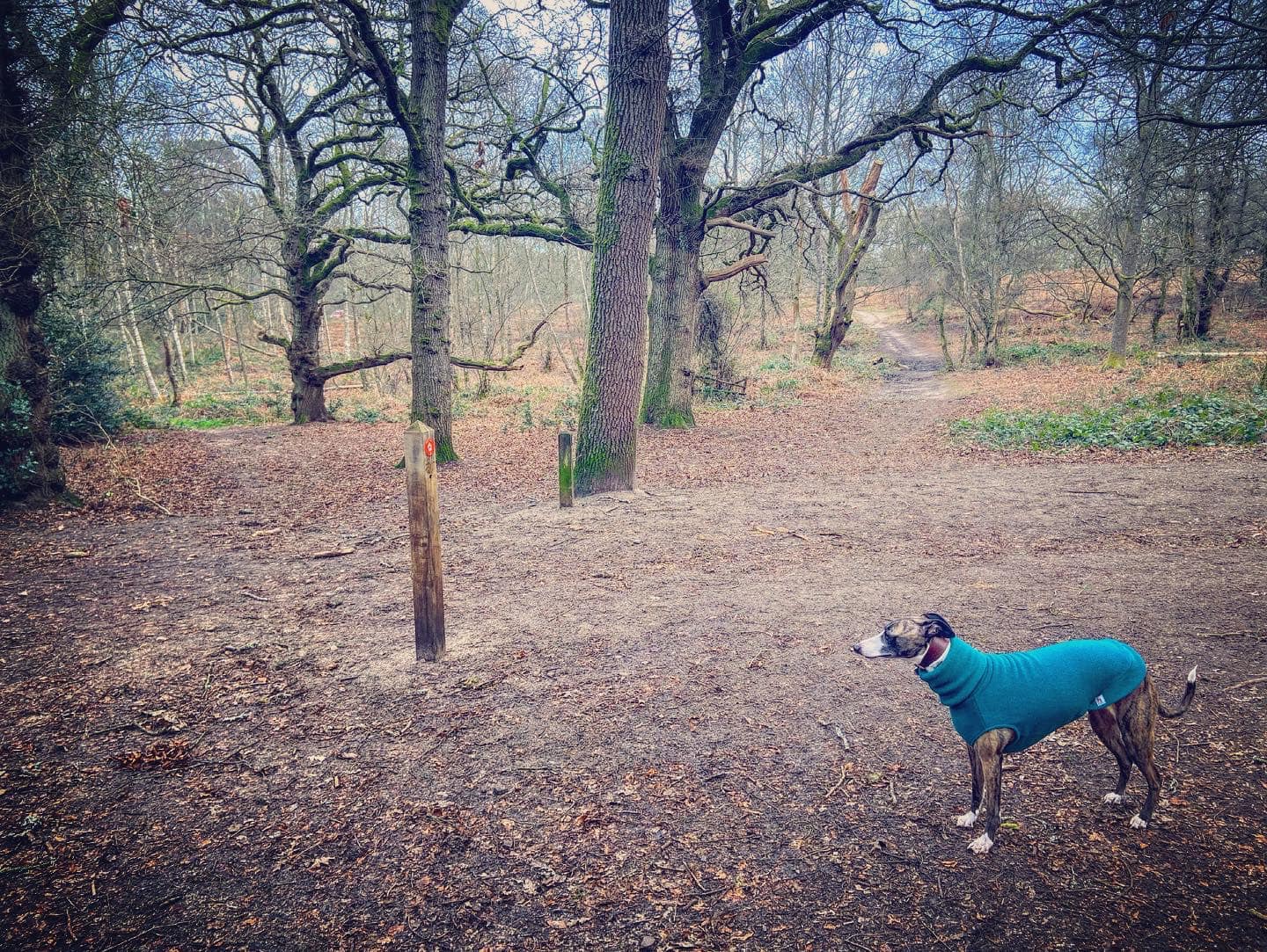 When you’re done, continue through to the gate at the other side of the churchyard. Here you want to take the wide main path ahead and slightly left down the hill. Pass the grey and green electricity boxes (on the right) and a finger post, and go downhill on the main path, which is edged for a little way by wooden slats. Ignore the next path to the right – just keep going. Jett and I walked this route just after the storms in February and, at the time of writing, a tree was down across the path. Walkers have made a way around its root ball but it’s such a major obstruction, I expect it’ll be cleared so there may or may not be a fallen tree to go around here!