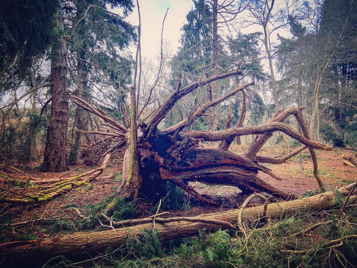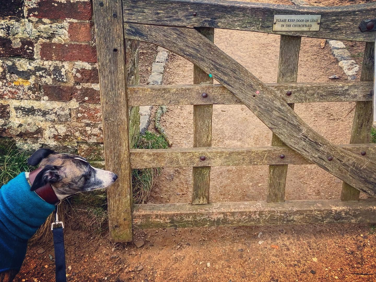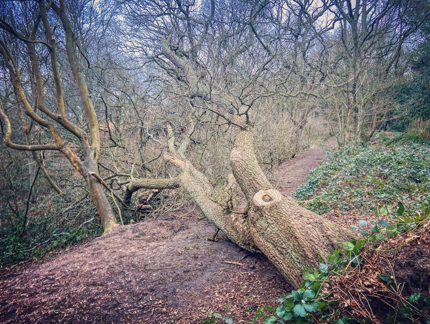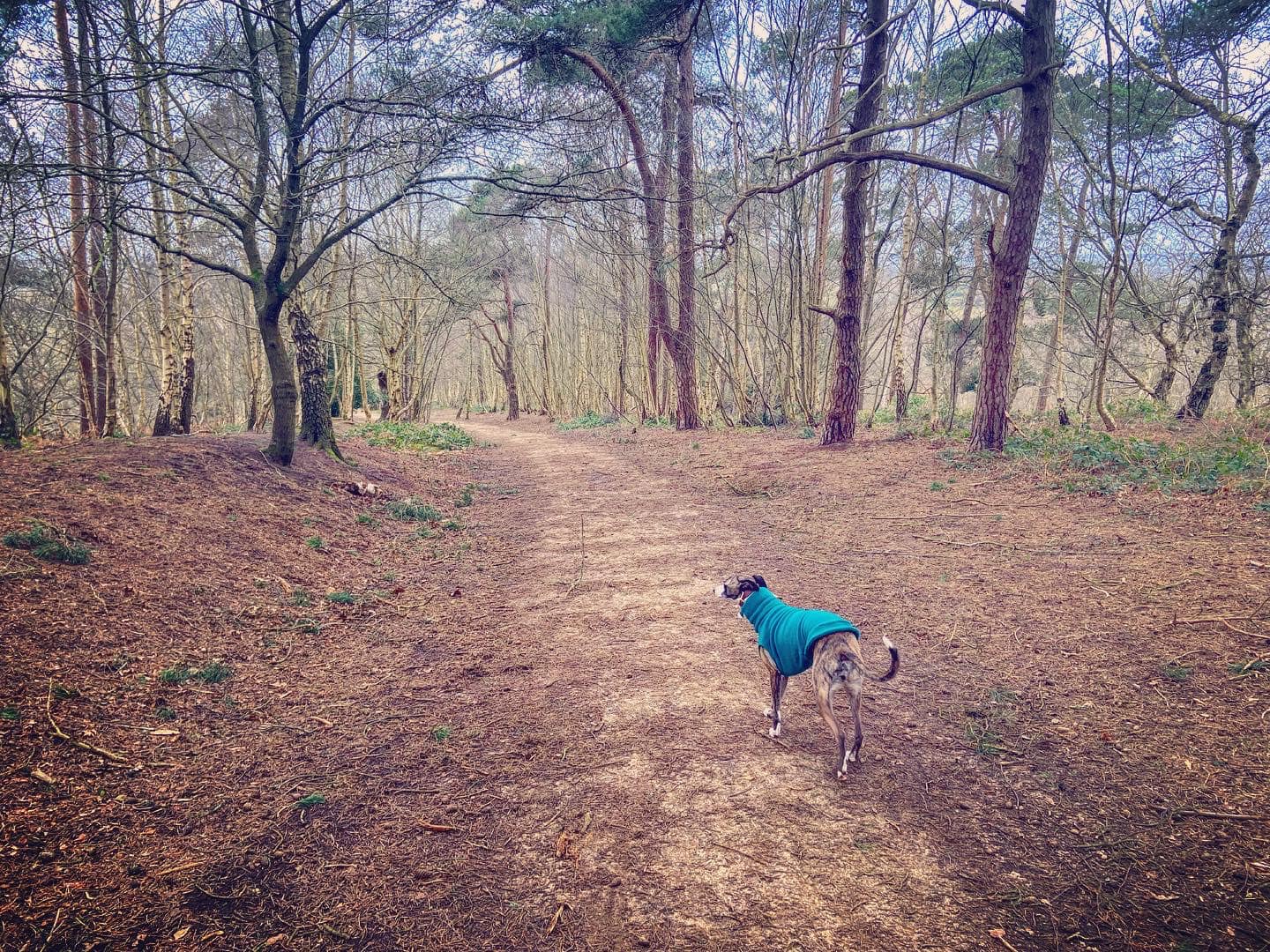When you’re done, continue through to the gate at the other side of the churchyard. Here you want to take the wide main path ahead and slightly left down the hill. Pass the grey and green electricity boxes (on the right) and a finger post, and go downhill on the main path, which is edged for a little way by wooden slats. Ignore the next path to the right – just keep going. Jett and I walked this route just after the storms in February and, at the time of writing, a tree was down across the path. Walkers have made a way around its root ball but it’s such a major obstruction, I expect it’ll be cleared so there may or may not be a fallen tree to go around here!
