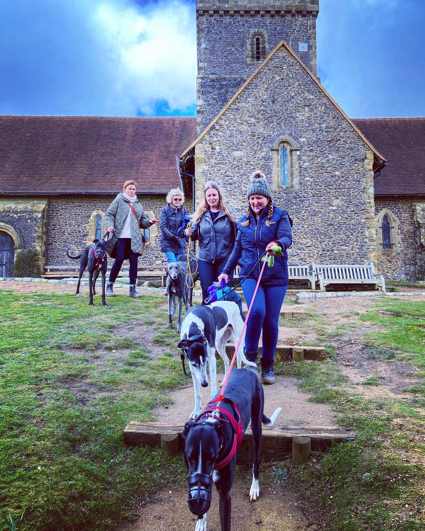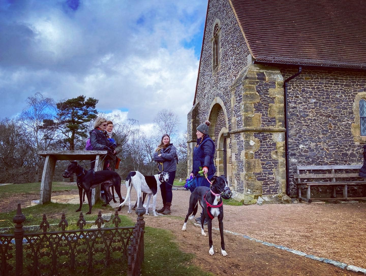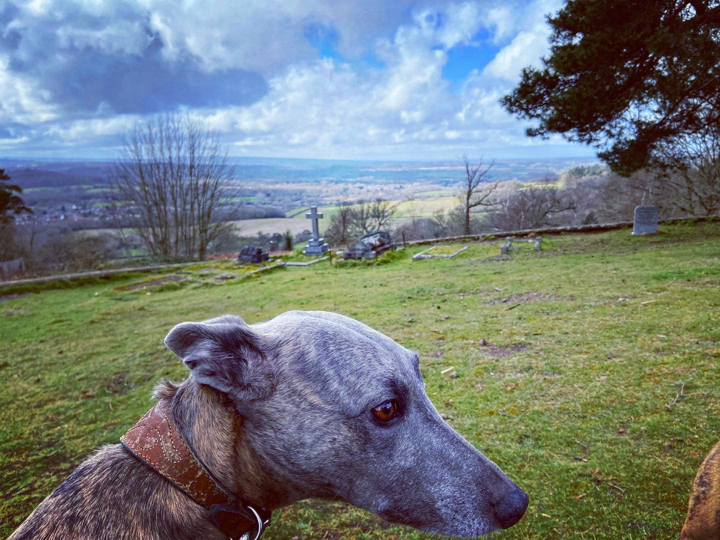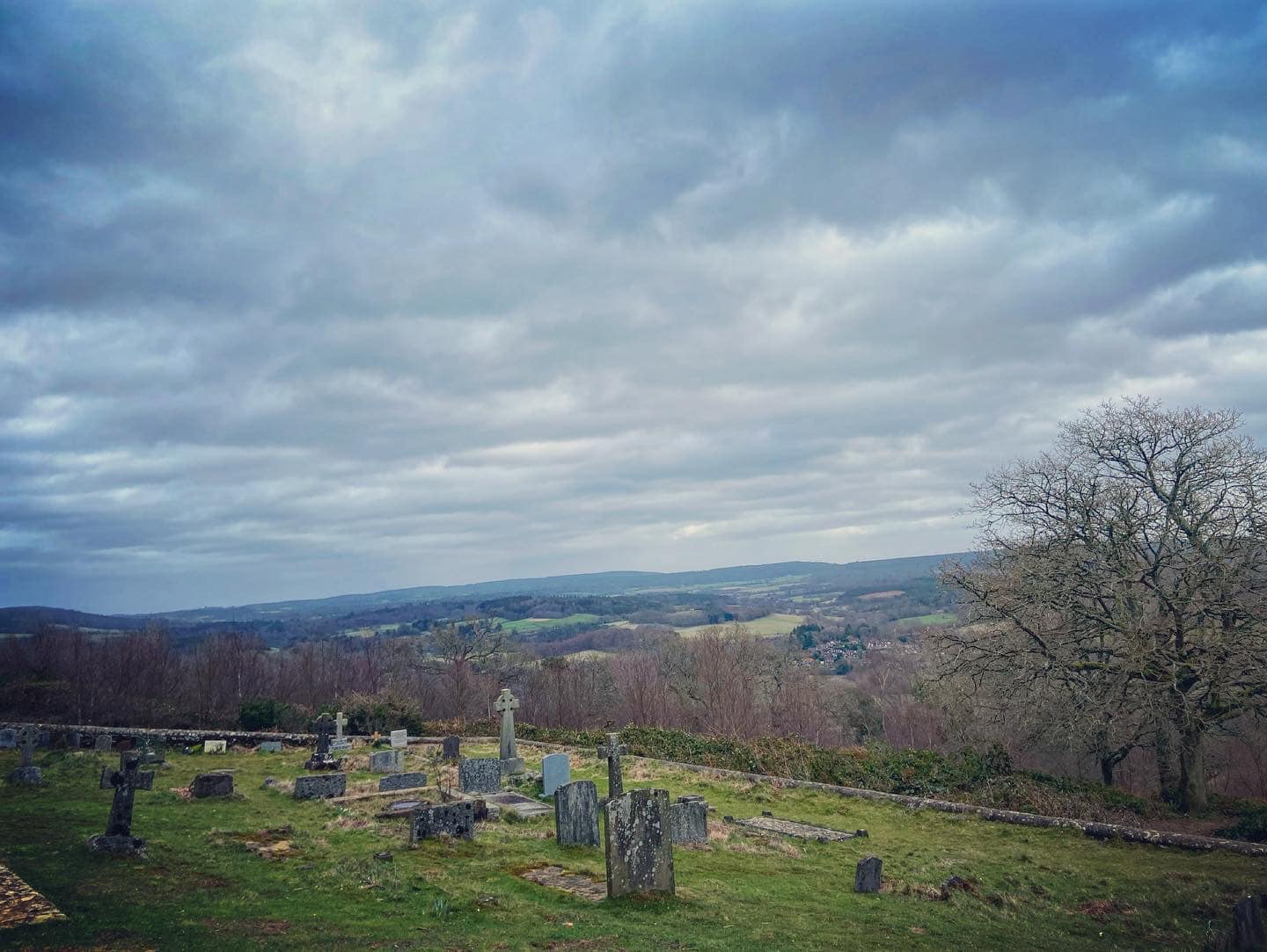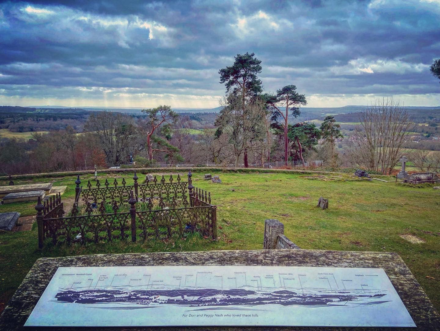 Pass a well placed bench and, if your dog is off lead, pop it back on in order to continue straight through the little gate into the churchyard. Walk past the church (more benches) and follow the little path past a viewing point (on your left), which explains the view from Gomshall and Albury over to the left to Godalming and the Devil’s Punch Bowl to the right (close up of viewpoint).