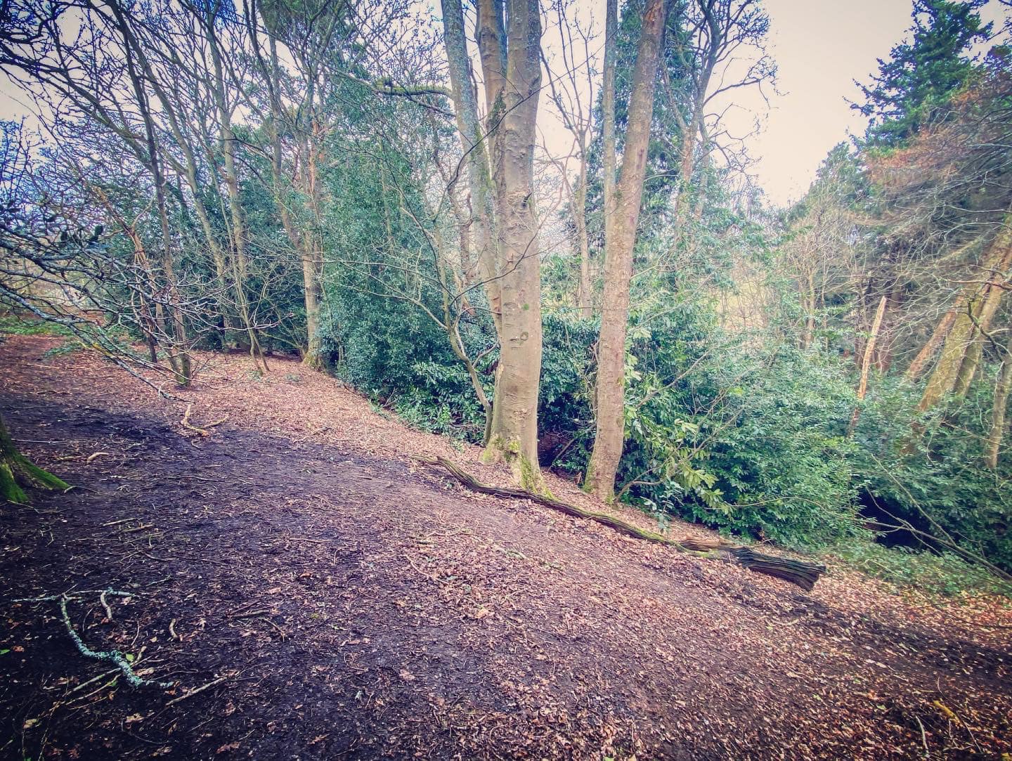 At the bottom, bear right/ahead through the trees. Notice a path coming down the hillside from the right with a moss covered silver birch trunk alongside it. Ignore this and continue ahead here but almost immediately, the path ahead forks – take the left one, which is the slightly steeper of the two (both join anyway). It goes up to the left…