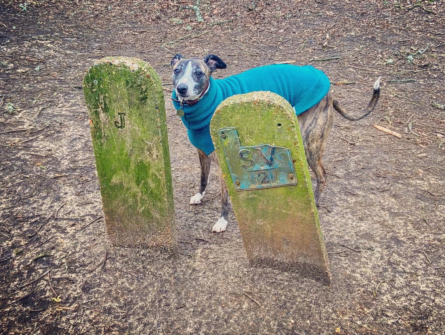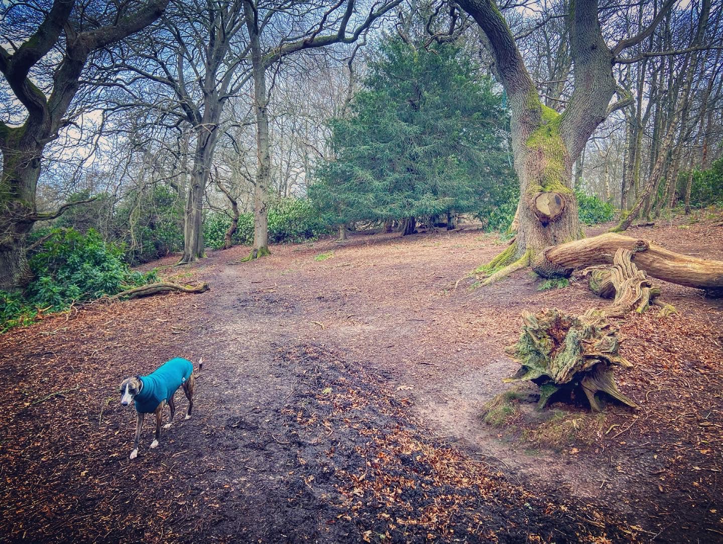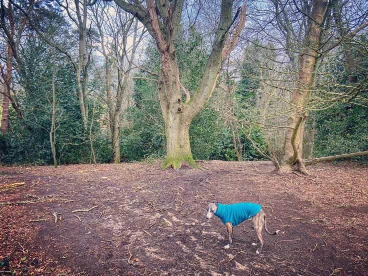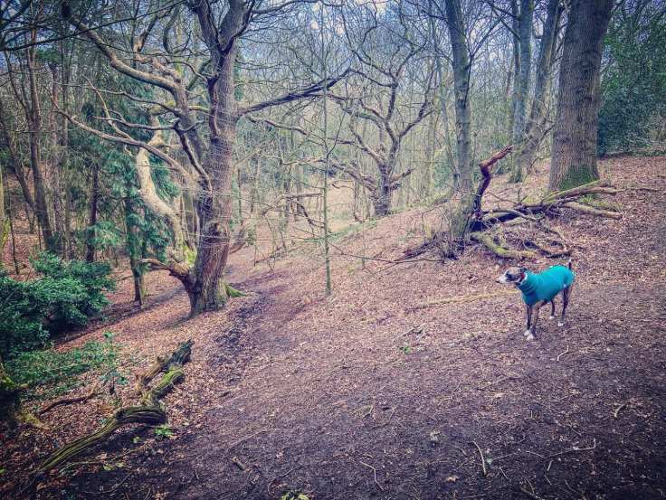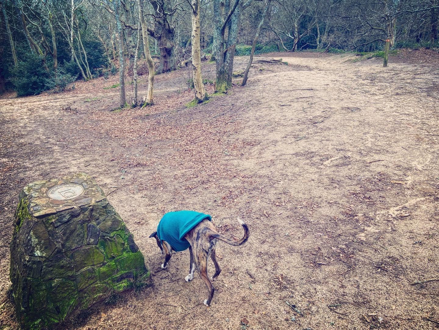 When you’re done, continue through to the gate at the other side of the churchyard. Here you want to take the wide main path ahead, and slightly left down the hill. Pass the grey and green electricity boxes (on the right) and a finger post, and go downhill on the main path, which is edged for a little way by wooden slats. Ignore the next path to the right – just keep going. Jett and I walked this route just after the storms in February and, at the time of writing, a tree was down across the path. Walkers have made a way around its root ball but it’s such a major obstruction, I expect it’ll be cleared so there may or may not be a fallen tree to go around here.