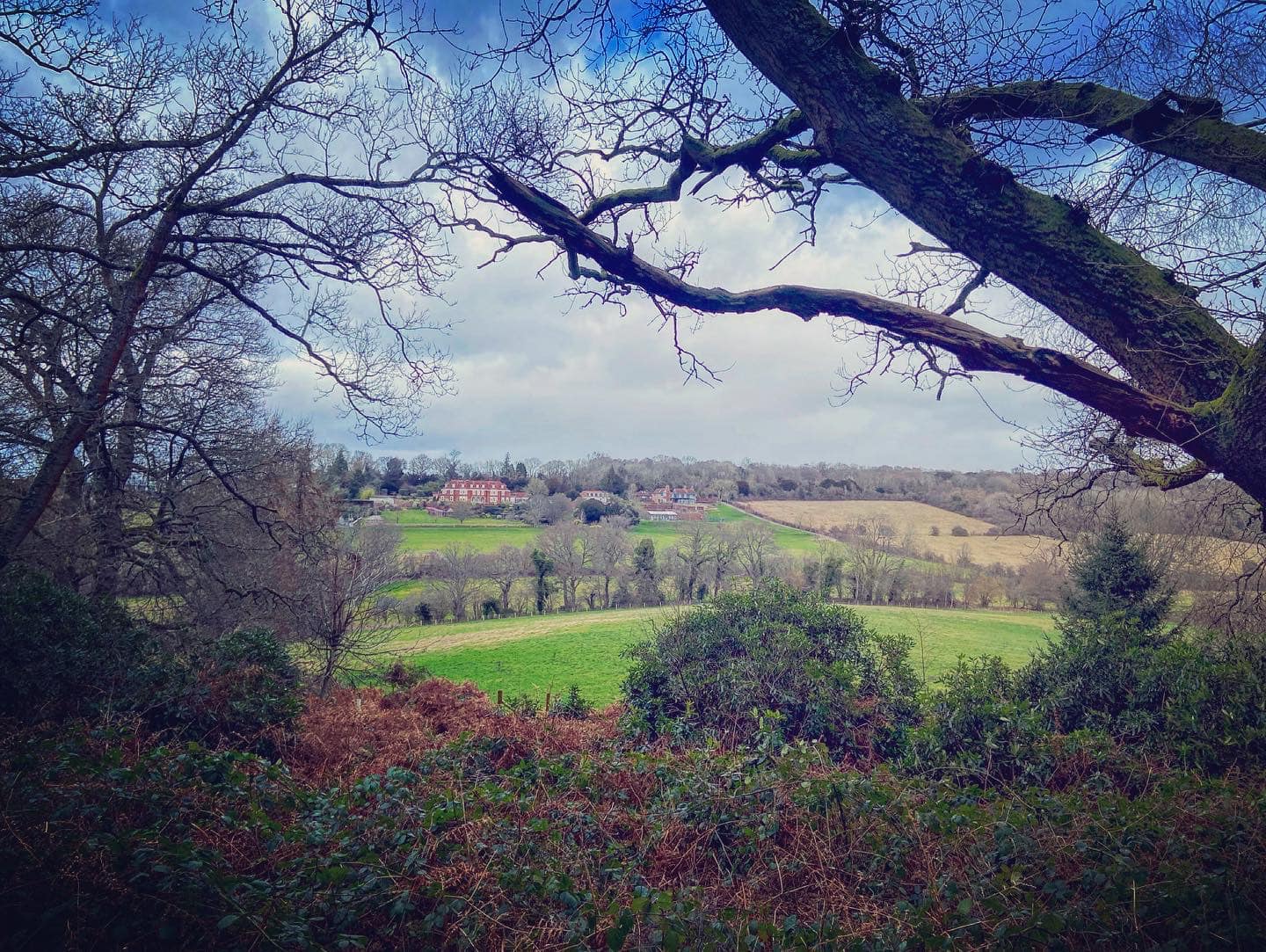 Bear left at the small post with the white marker down slope and then along the contour of the hillside. You’ll notice some pretty impressive properties to your left across the fields on the road to Newlands Corner.