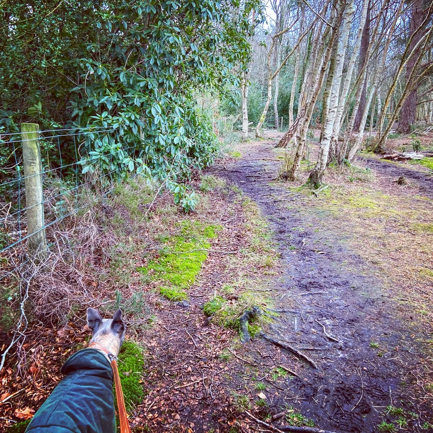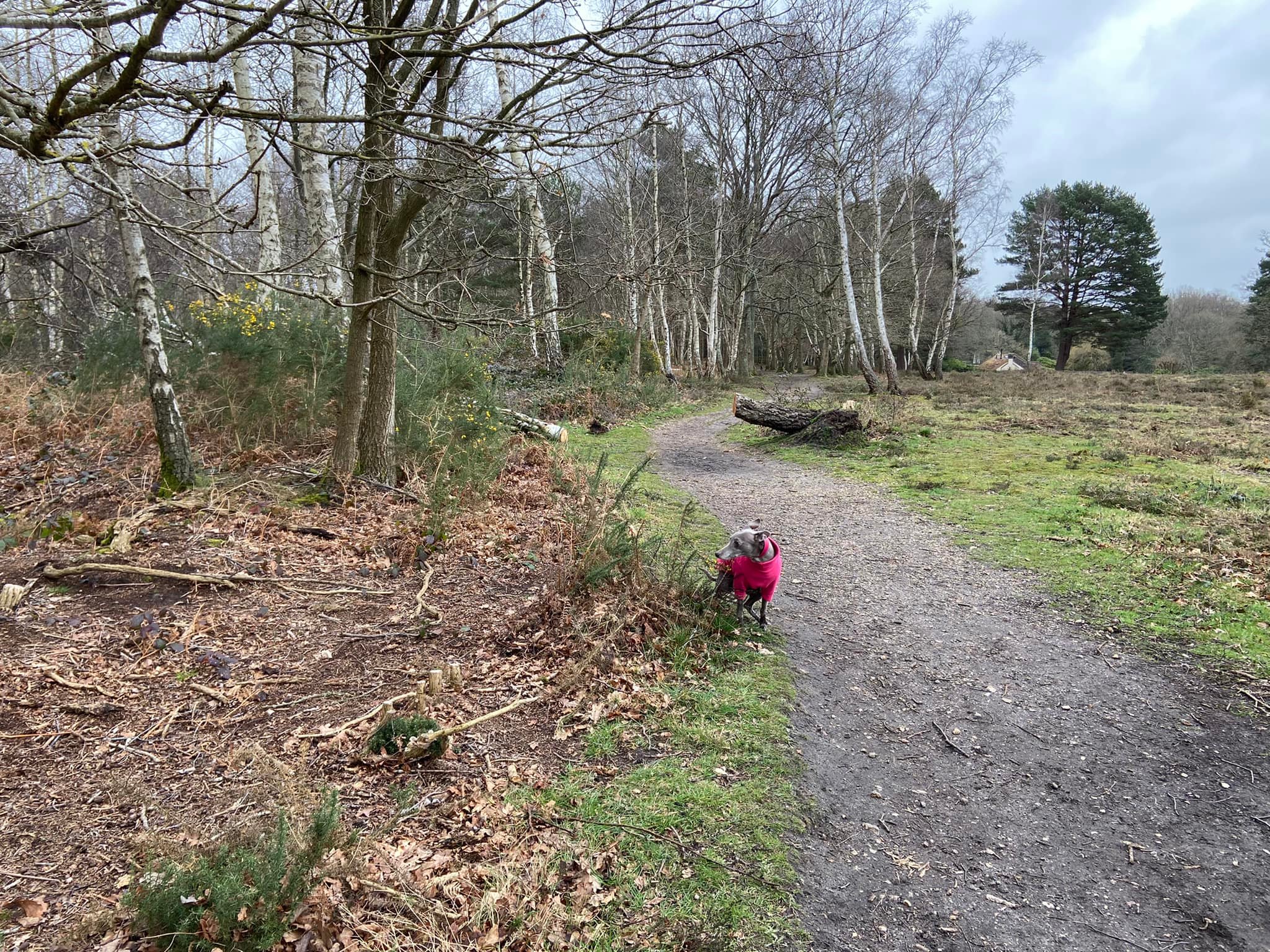 This brings you to a junction with a main path, where you turn left. This path brings you down to a poo bin and a main track. You ‘dogleg’ this bit: go between the little posts and to your right, you’ll see three paths. The first has a metal vehicle barrier across it. You want to take the next path to the left of that, which heads off from the main track at a right angle, over a small open patch and then into silver birch trees.