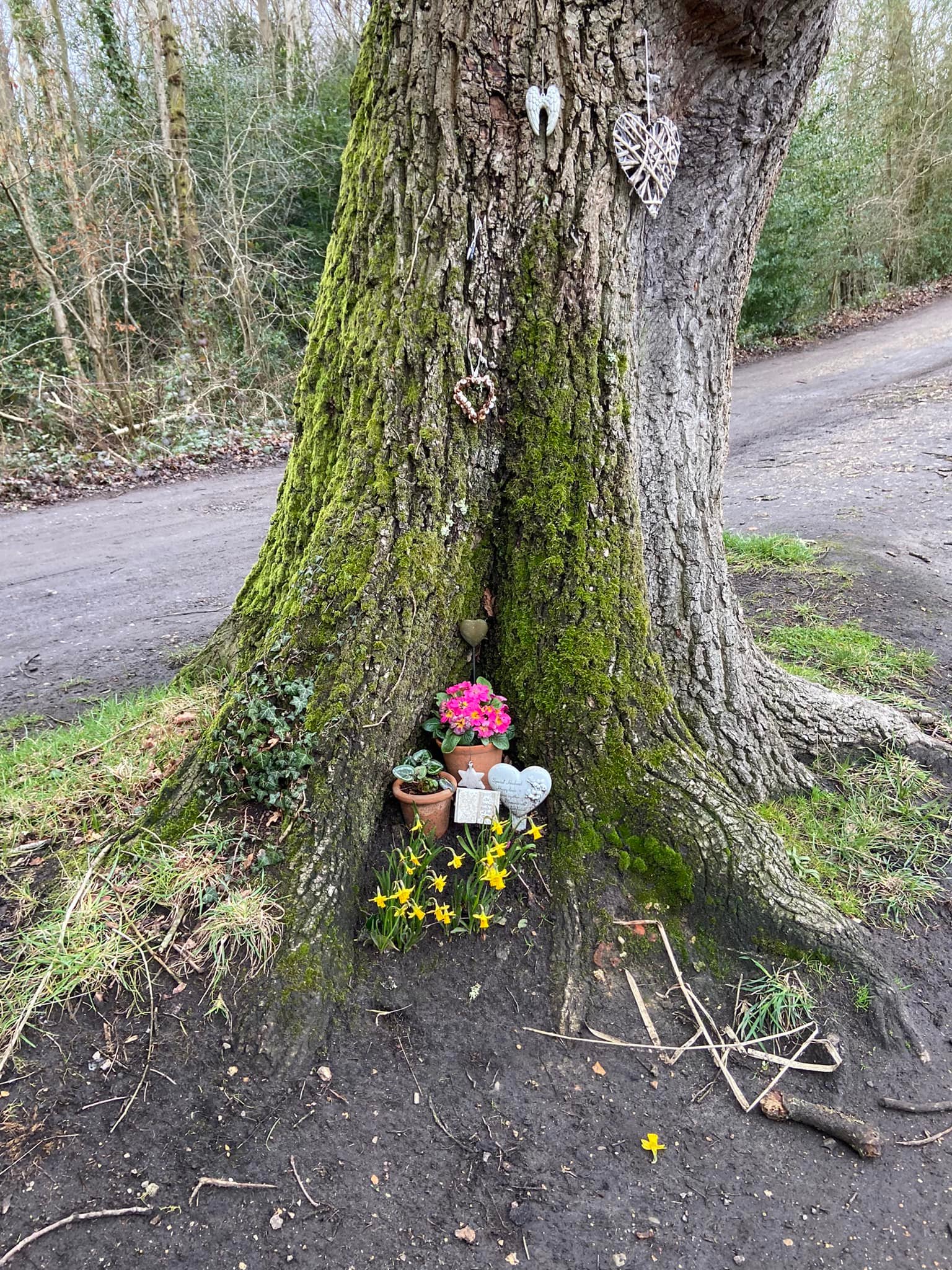 Walk along the tow path and under the green bridge. Pass the tree on the right with a memorial to someone (local I imagine) named Robert McGarry.