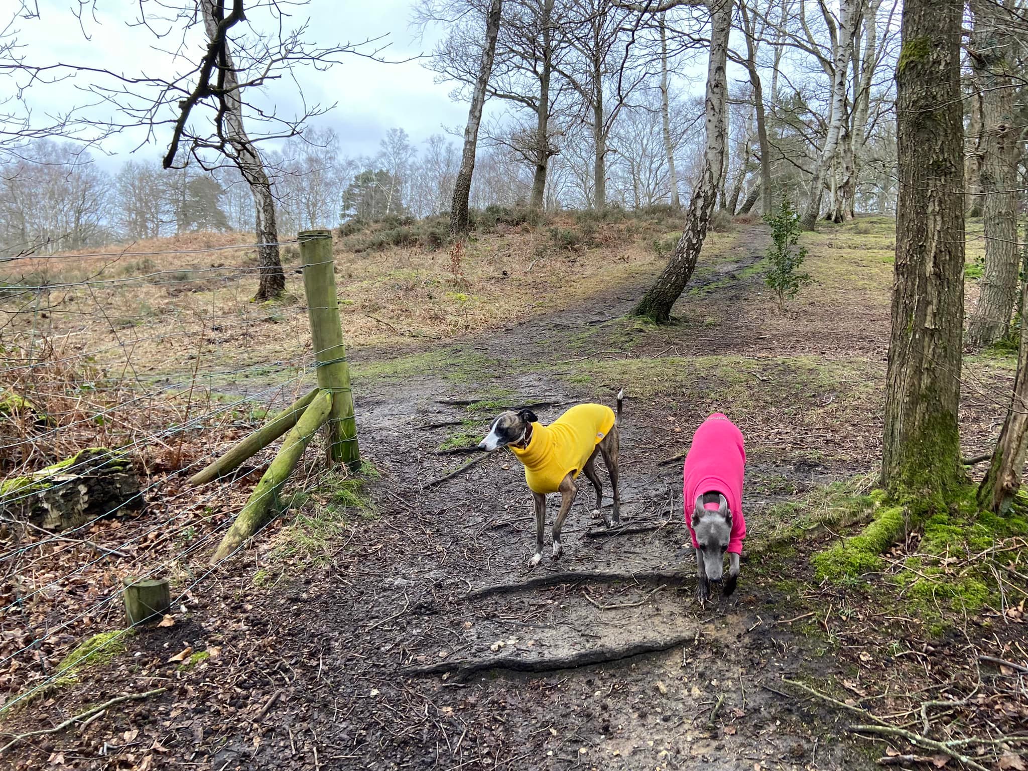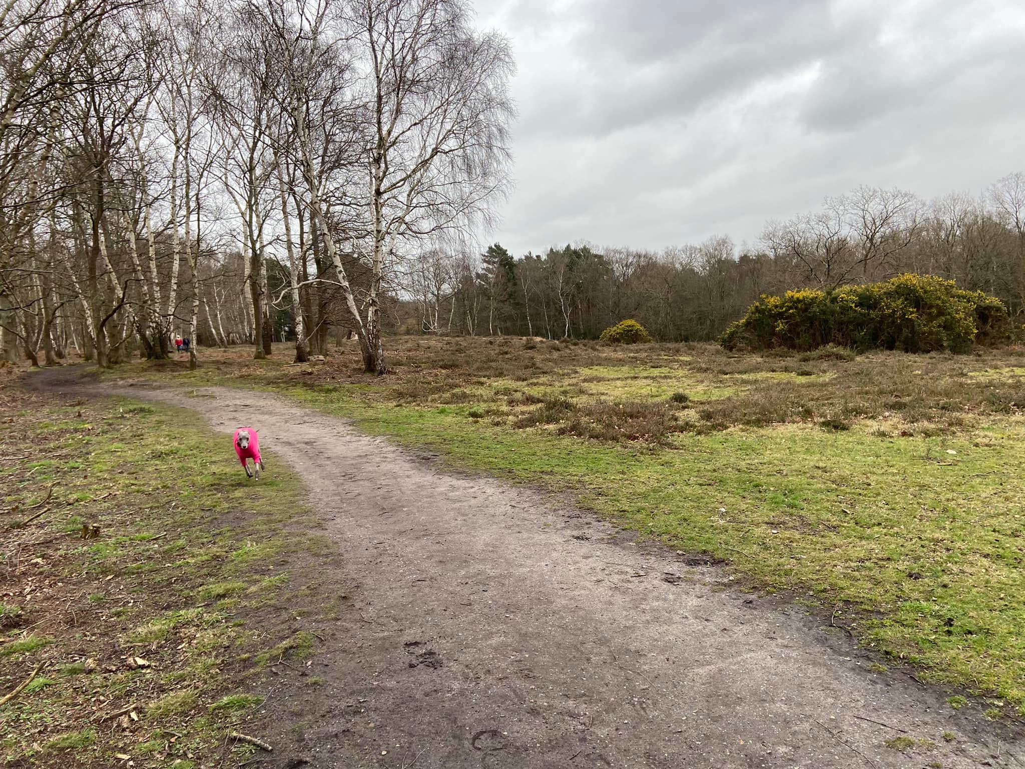 Presently you’ll see in the distance a metal animal drinking trough. You don’t want to get that far so keep an eye out for a path off to the right just by a lone silver birch tree. This little path can be a bit wet and muddy but it cuts off a corner that is much, much worse. At the end of this path, turn right next to the electricity pylon and before the gate. This path skirts the edge of the heath and has multiple gated exits.