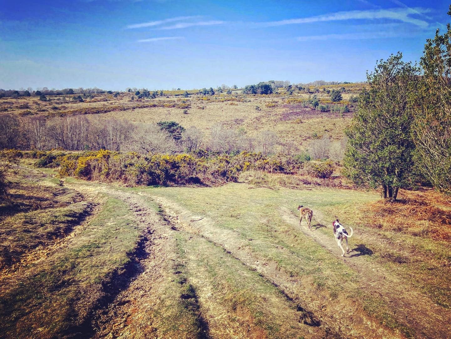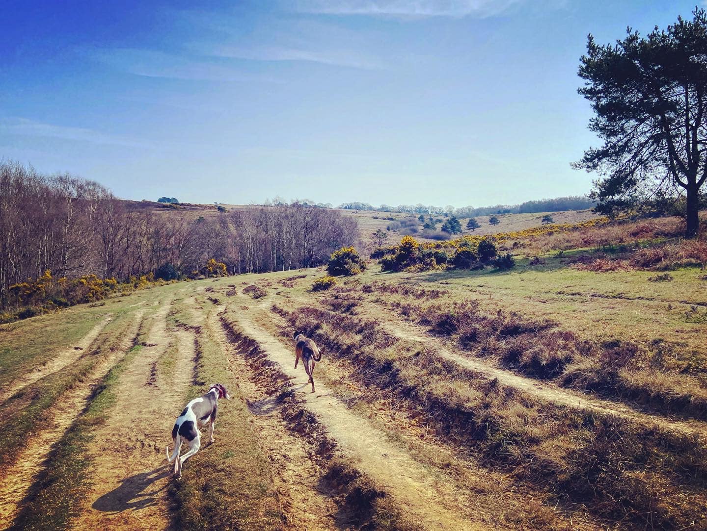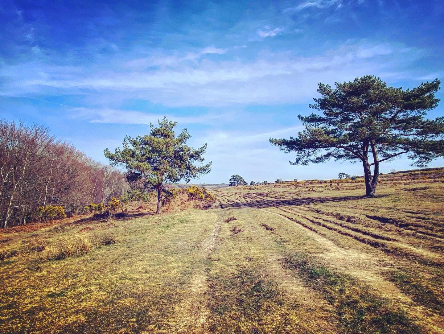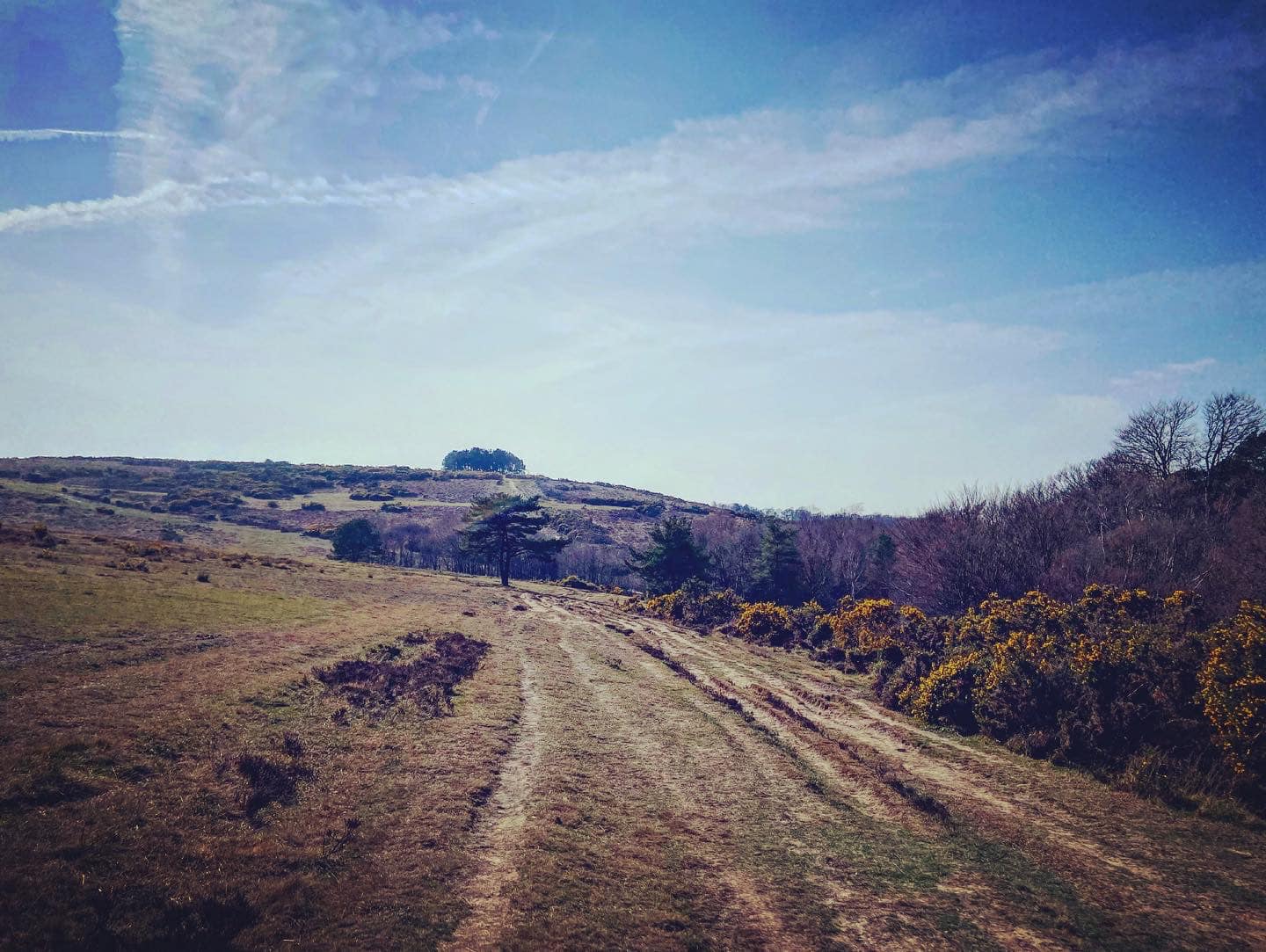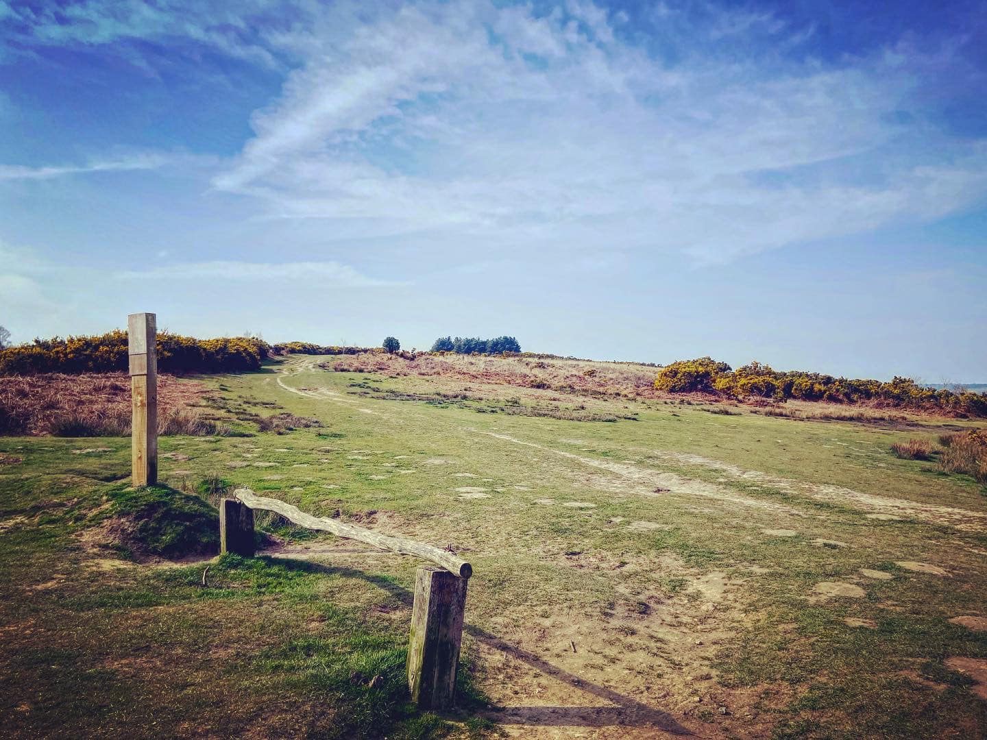 Bear left onto this wide path and you’ll almost immediately come to a large fork – continue ahead on the right hand path. As it descends, the trees give way to heath with lots of gorse. It will curve quite sharply to the left and, as it does so, another wide – but grassy – path comes off down to the right – take this and curve round and down towards some silver birch trees. At the next wide junction, continue straight ahead and ignore the path that curves round to the left.