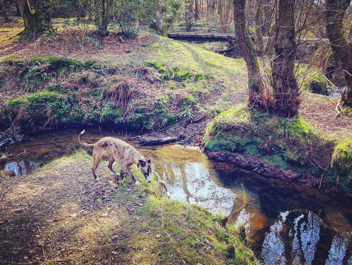 Terrain: This is quite a challenging walk compared to most of the routes on this site. There are fairly steep slopes, and the ground is really quite rugged underfoot in places, especially on some of the wide main paths. The little path that runs along the stream is also very uneven, with lots of ups and downs and tree routes to clamber over – so this is a walk that is best avoided if you’re at all unsteady on your feet. While there are trees sheltering some parts of this walk, quite a bit takes in open heath, with no respite from the sun (or rain) so not a walk for hot days.