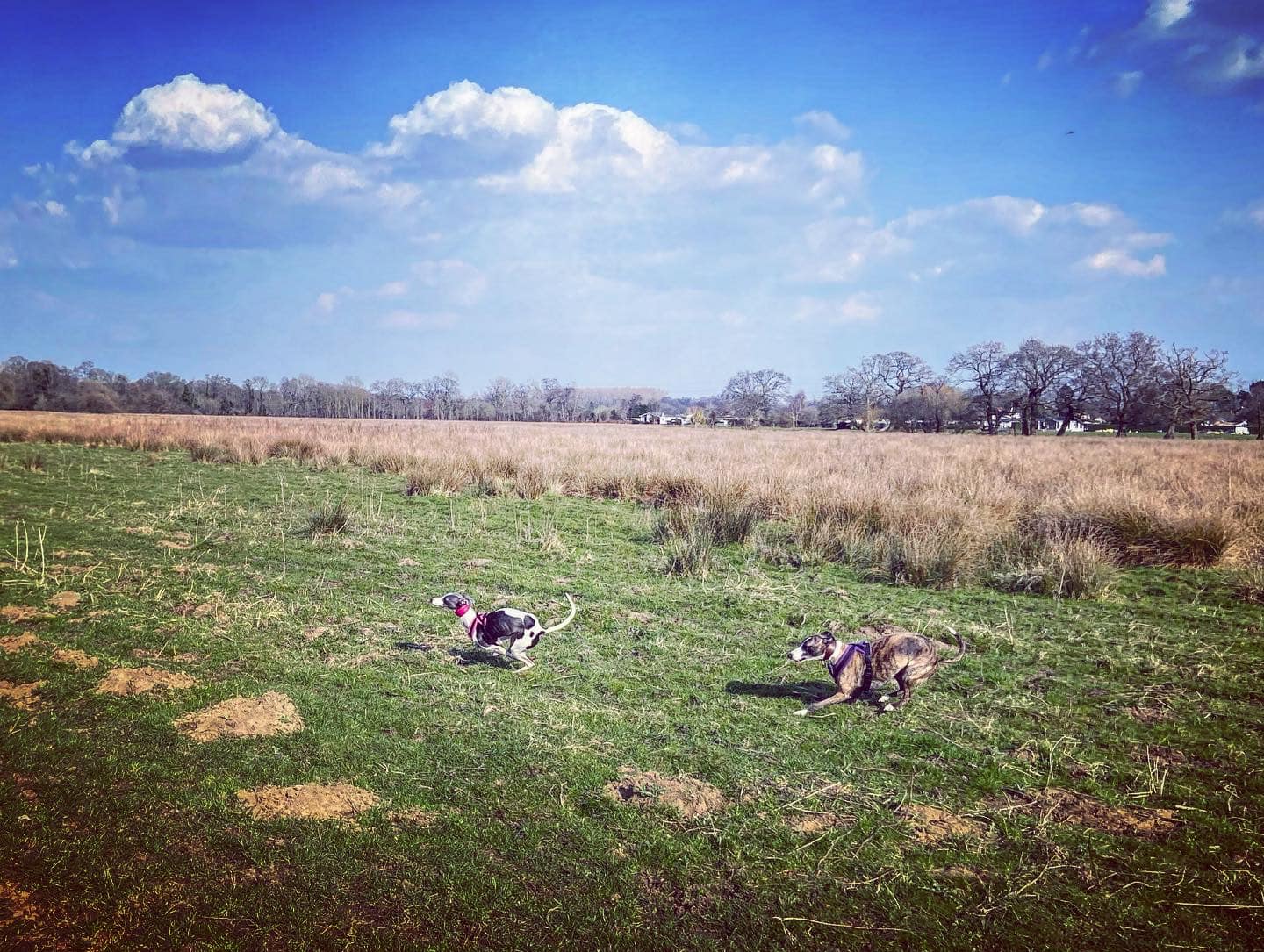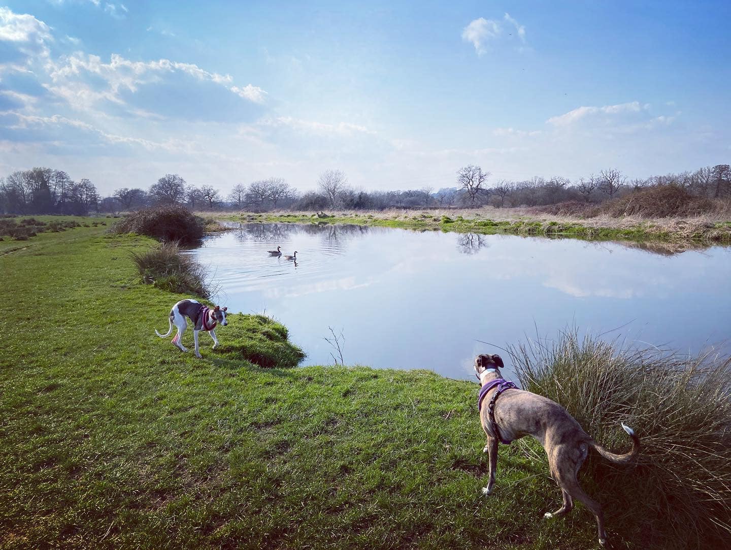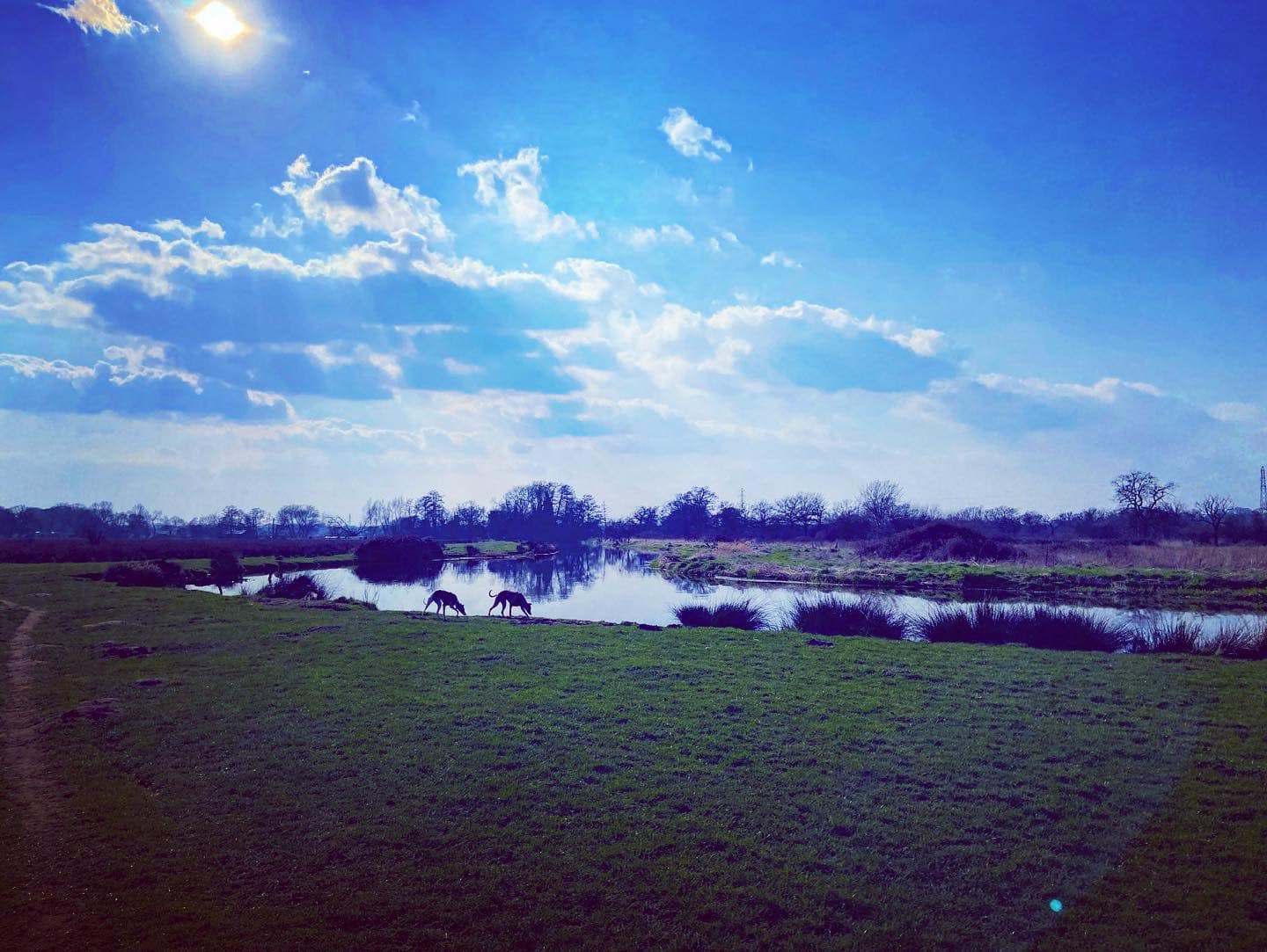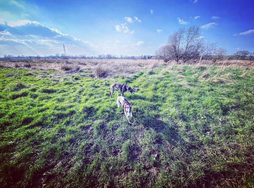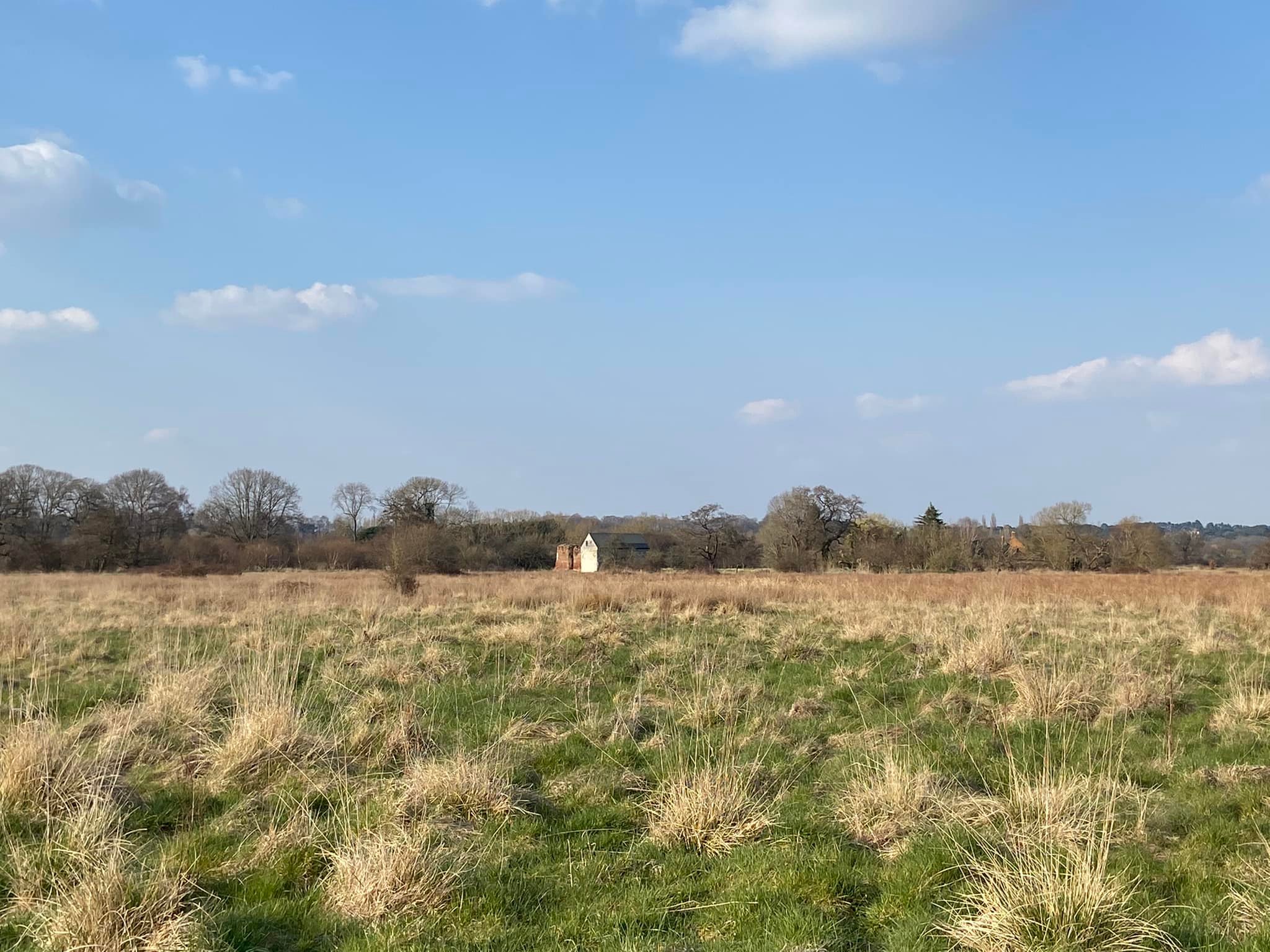 Take the path that goes ahead and slightly left through the meadow rather than those that go left and right along the water’s edge. This path is through the flood plain and it can be very wet and muddy. If you look over to your right beyond the power lines and pylons, you can see a crumbling stone building. This is Woking Palace. It is possible to go and look around them but the route I know to get there involves narrow, scrubby paths and there’s one stile (with a dog passing gap that we fit two decent sized greyhounds through) so it’s doable but it’s an off-the-beaten-track kinda walk. All that remains are a barrel vault and some adjoining Tudor brick walls. The heathen in me thinks it just looks a bit like a barn, to be honest, but history buffs that know far, far more than I have critiqued it among royal sites of the pre-16th century as an “excellent survival” that is highly diverse with large archaeological potential. You can read all about it on the Friends of Woking Palace website and the Wey Valley website. The tall buildings in the distance are in Woking town centre.