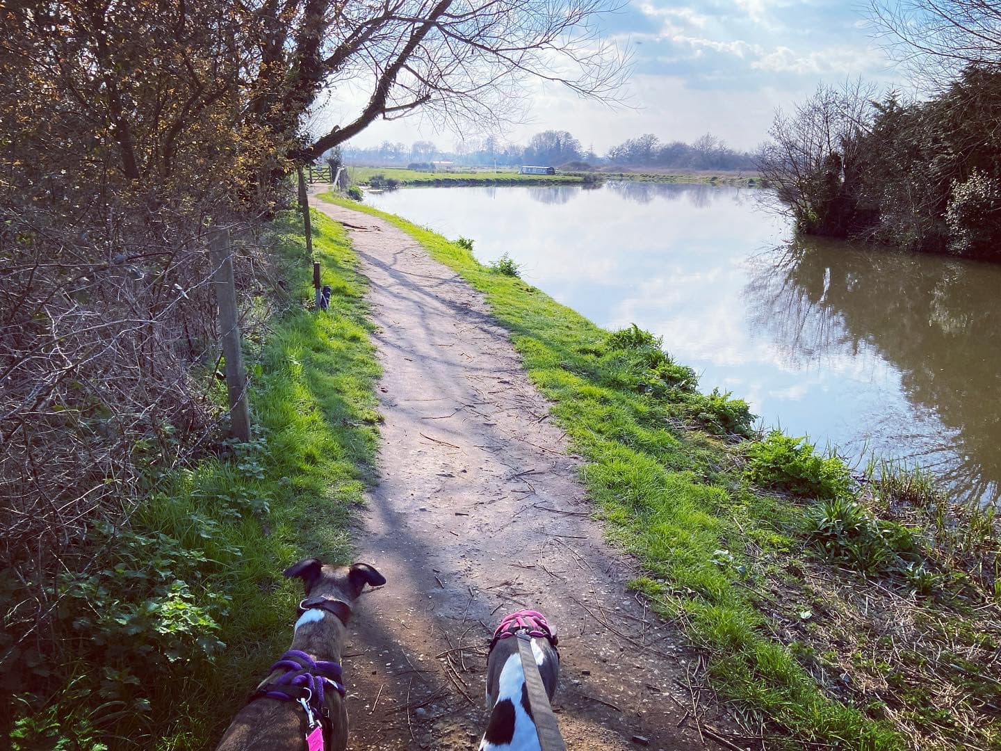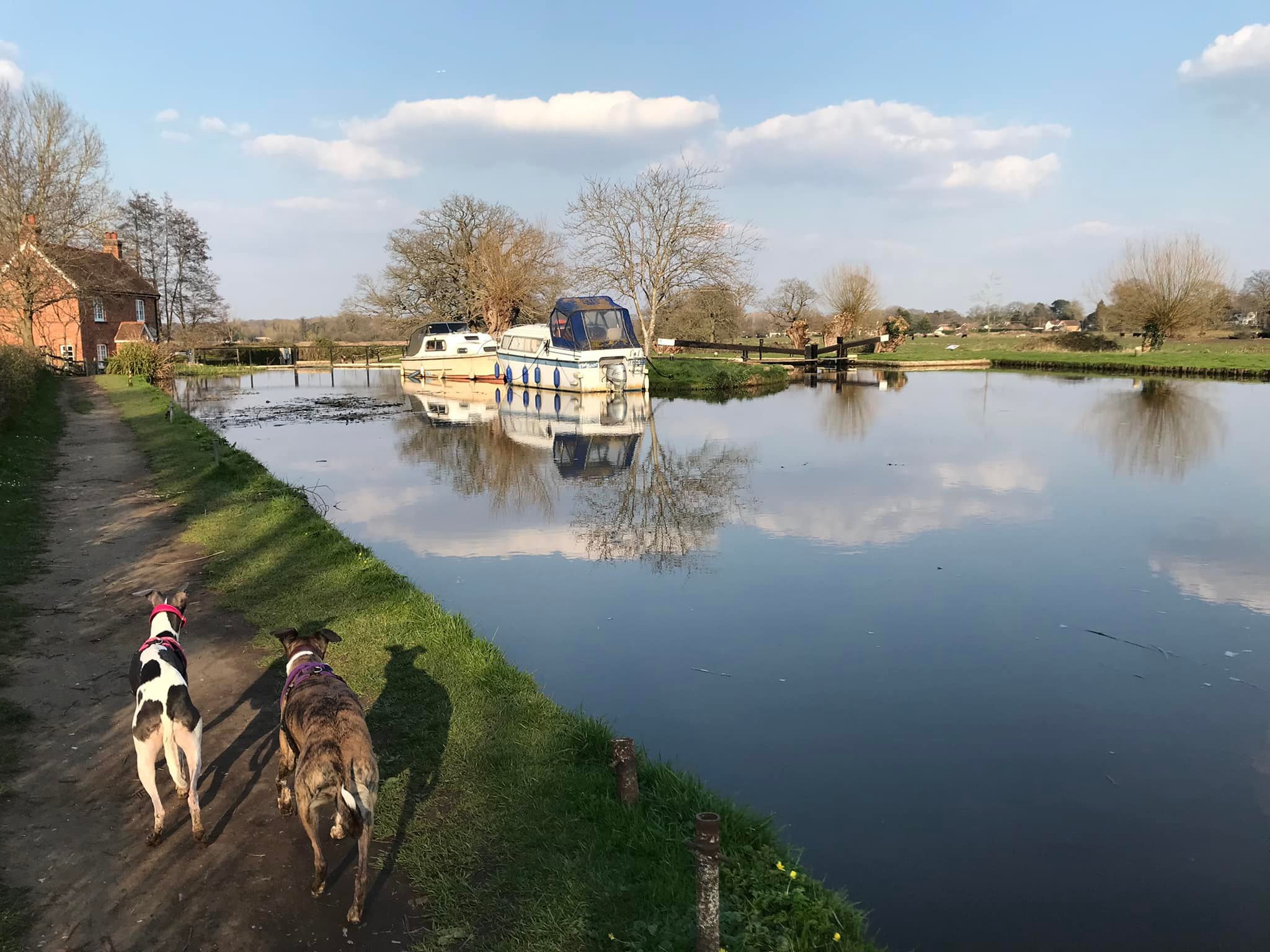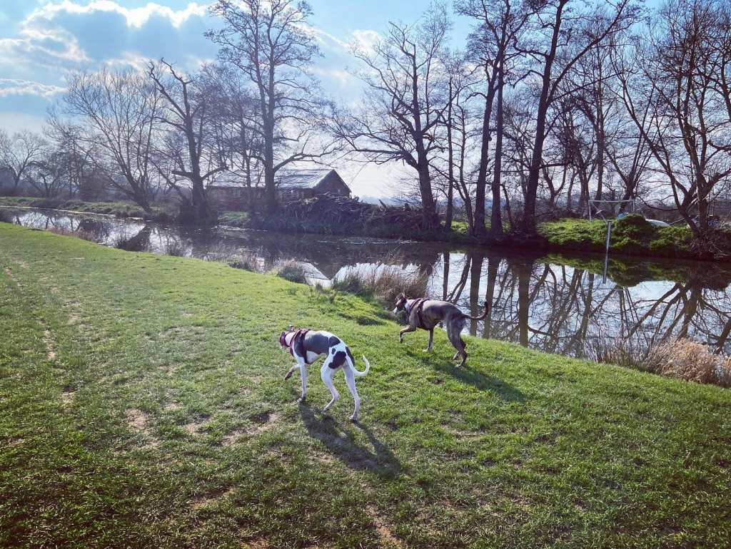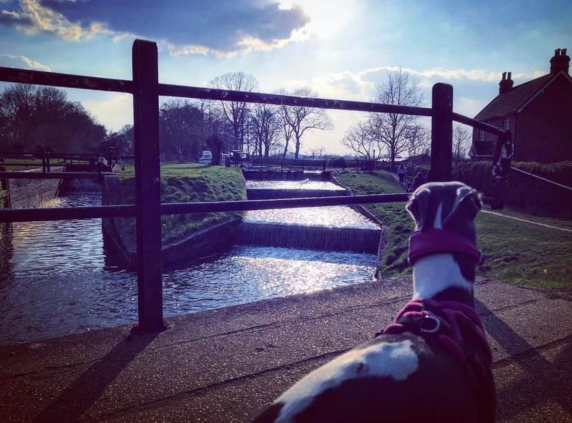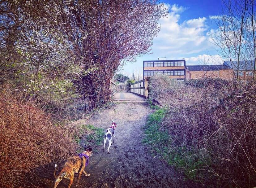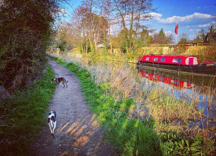 Turn left and walk alongside the canal. This path is through the flood plain and it can be very wet and muddy. If you look over to your right beyond the power lines and pylons, you can see a crumbling stone building. This is Woking Palace. The tall buildings in the distance are in Woking town centre. It is possible to go and look around them but the route I know to get there involves narrow, scrubby paths and there’s one stile (with a dog passing gap that we fit two decent sized greyhounds through) so it’s doable but it’s an off-the-beaten-track kinda walk. All that remains are a barrel vault and some adjoining Tudor brick walls. The heathen in me thinks it just looks a bit like a barn, to be honest, but history buffs that know far, far more than I have critiqued it among royal sites of the pre-16th century as an “excellent survival” that is highly diverse with large archaeological potential. You can read all about it on the Friends of Woking Palace website and the Wey Valley website.