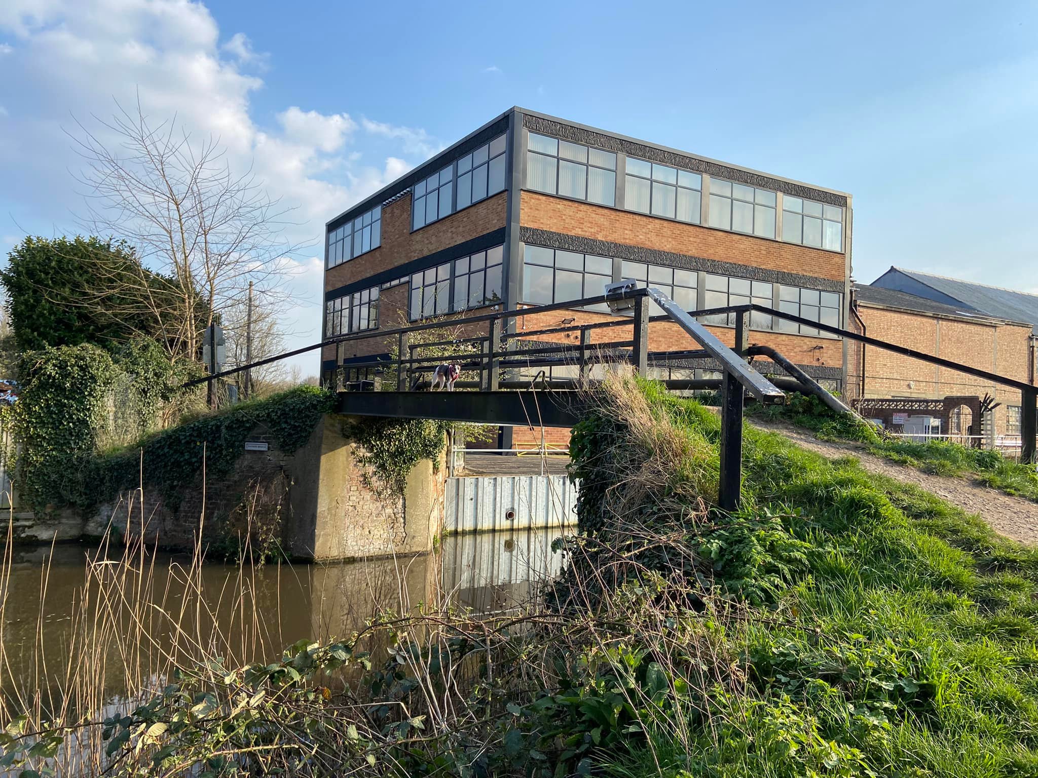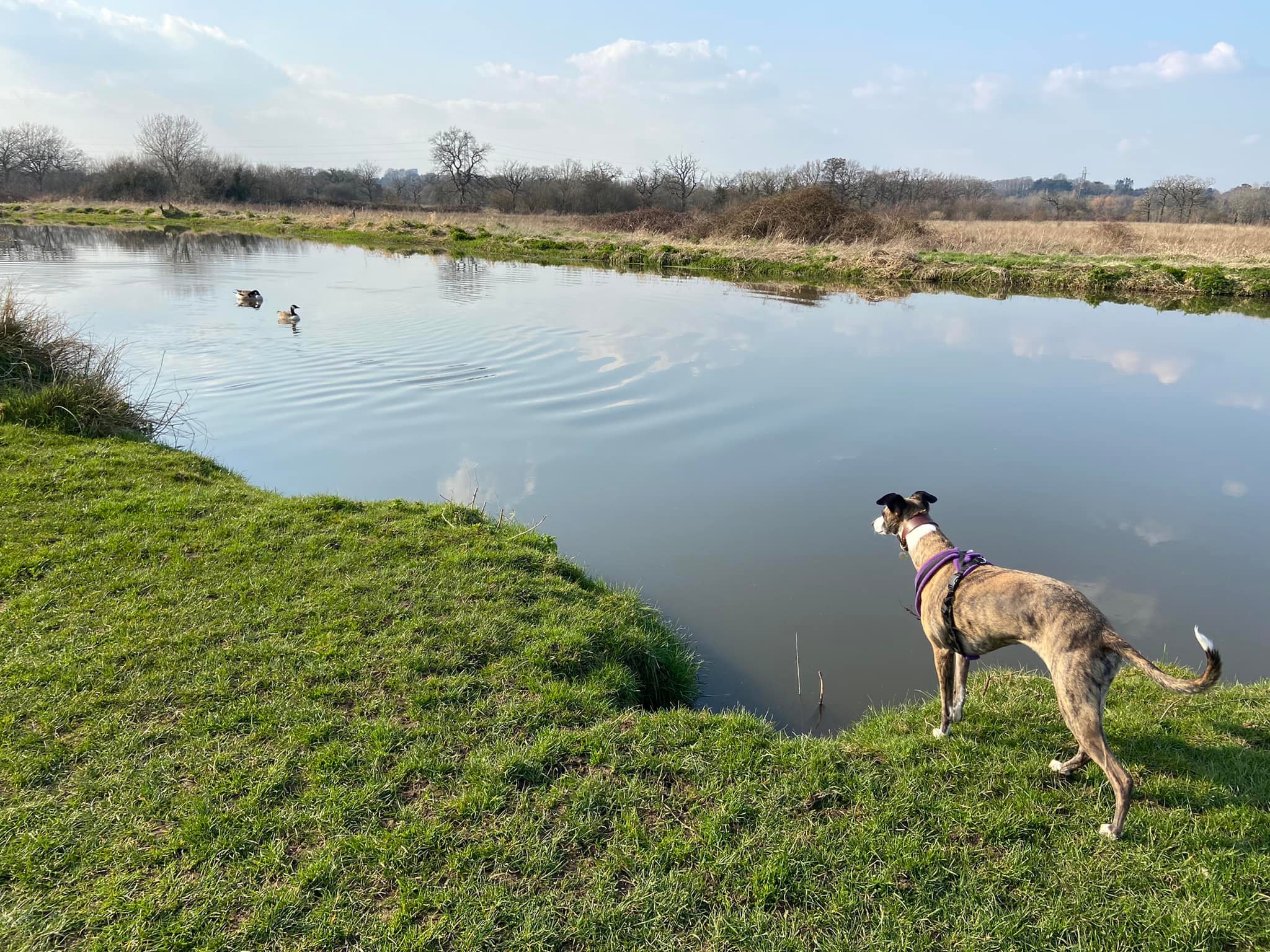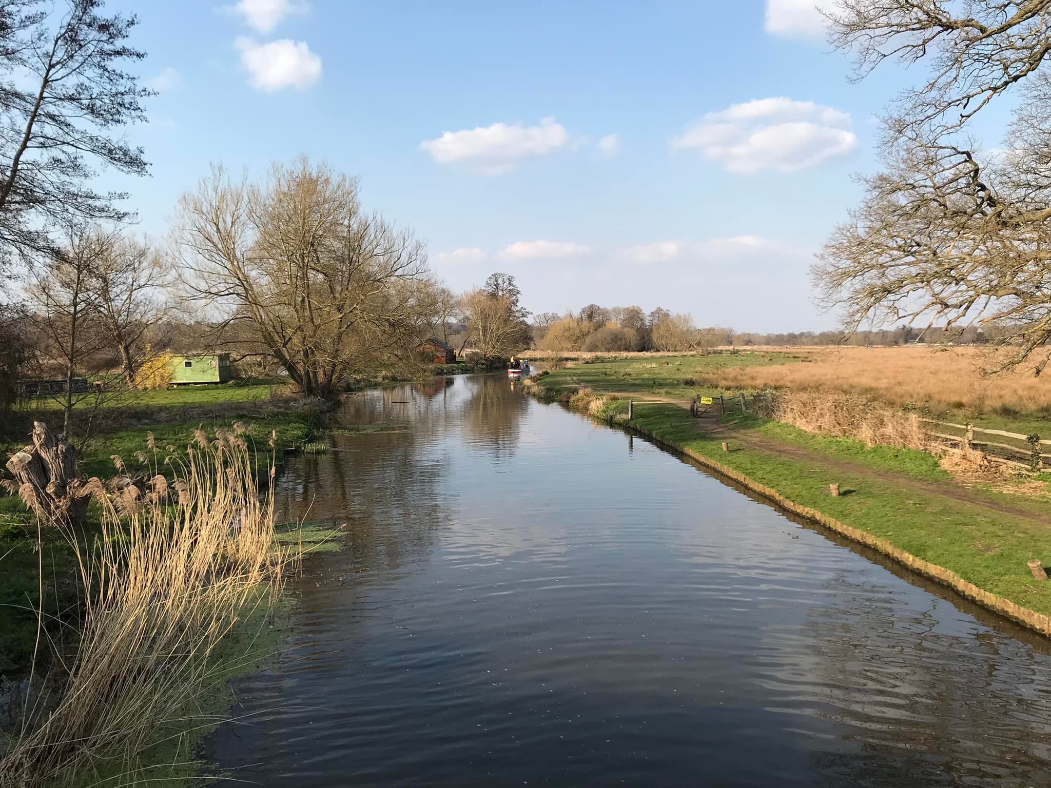 Turn left and walk alongside the canal. This path is through the flood plain and it can be very wet and muddy. If you look over to your right beyond the power lines and pylons, you can see a crumbling stone building. This is Woking Palace. The tall buildings in the distance are in Woking town centre. It is possible to go and look around them but the route I know to get there involves narrow, scrubby paths and there’s one stile (with a dog passing gap that we fit two decent sized greyhounds through) so it’s doable but it’s an off-the-beaten-track kinda walk. All that remains are a barrel vault and some adjoining Tudor brick walls. The heathen in me thinks it just looks a bit like a barn, to be honest, but history buffs that know far, far more than I have critiqued it among royal sites of the pre-16th century as an “excellent survival” that is highly diverse with large archaeological potential. You can read all about it on the Friends of Woking Palace website and the Wey Valley website.