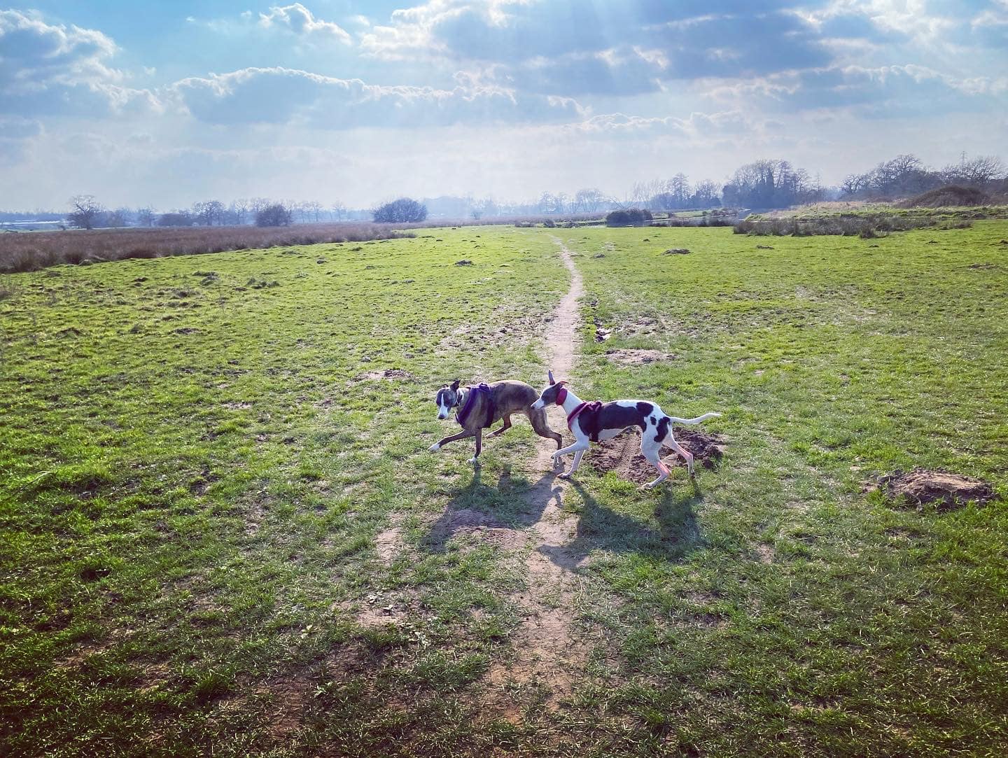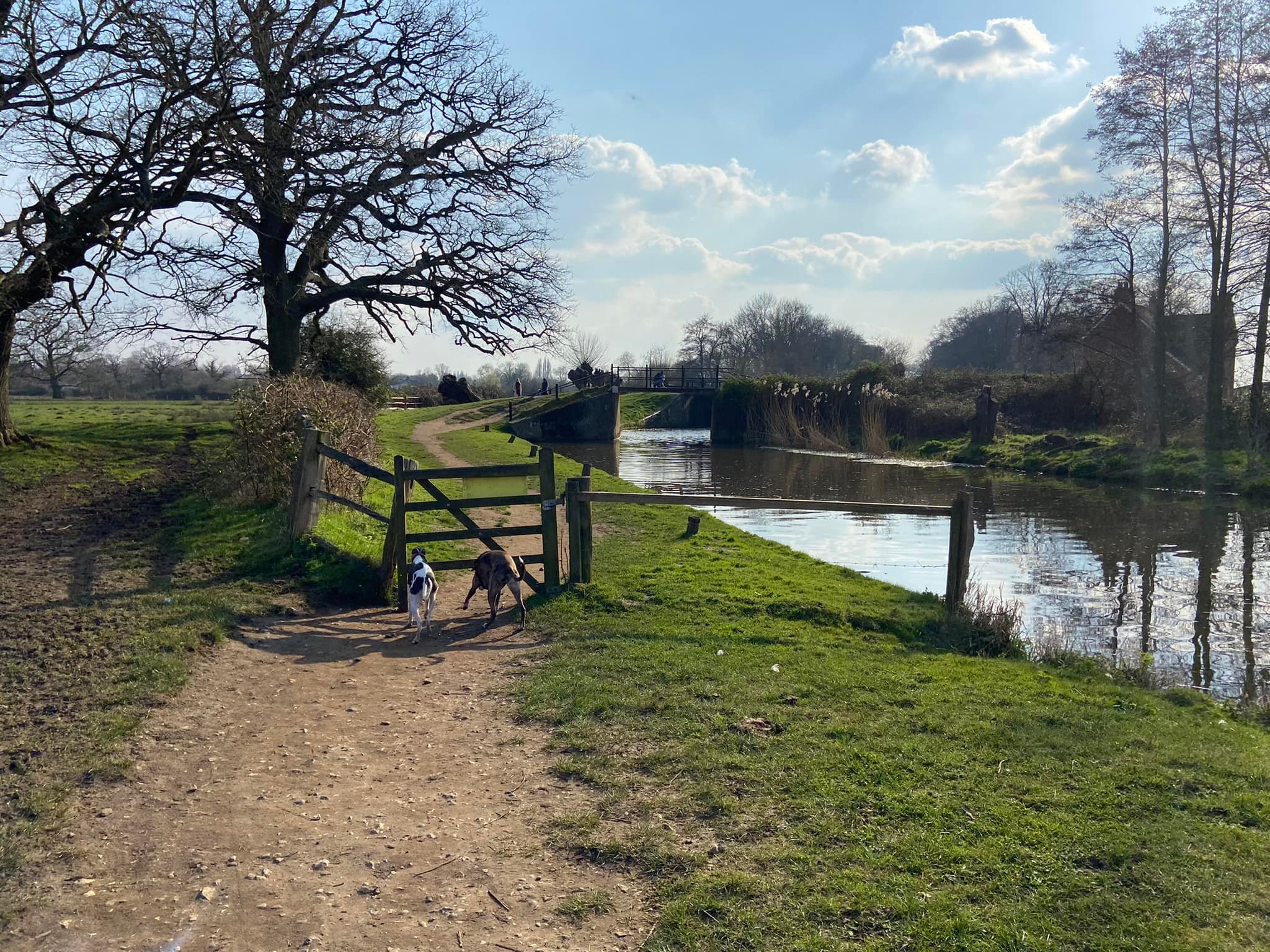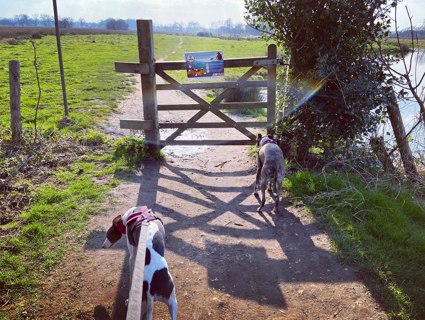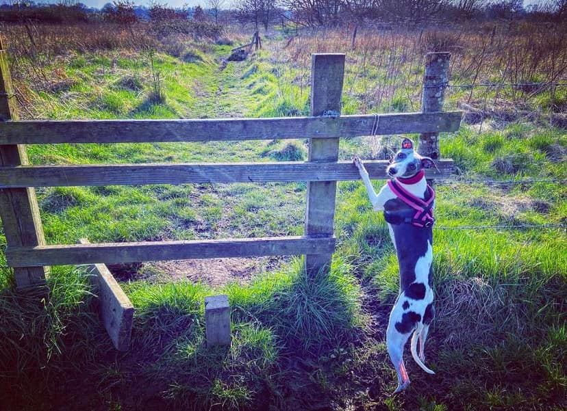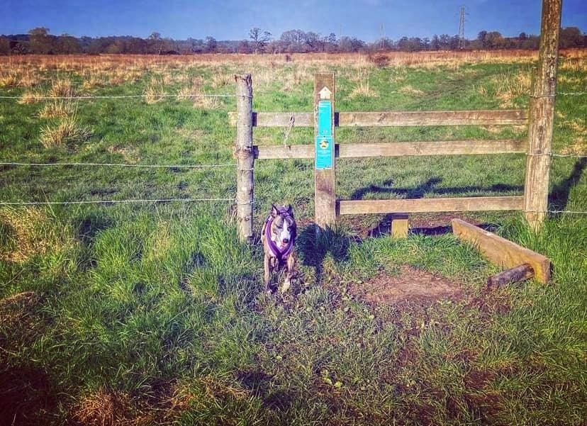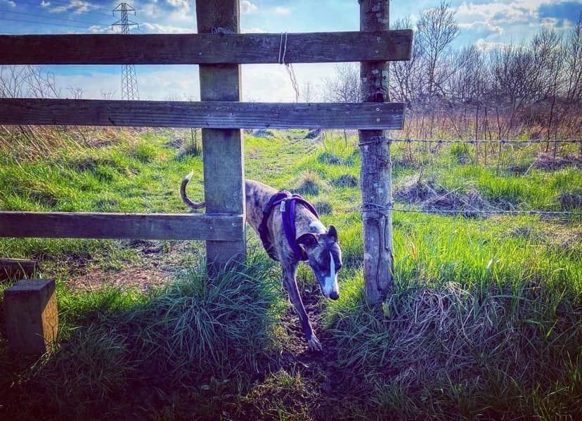 Stiles/kissing gates? No kissing gates, one stile with a tall dog passing gap that most greyhounds should be able to duck under/through