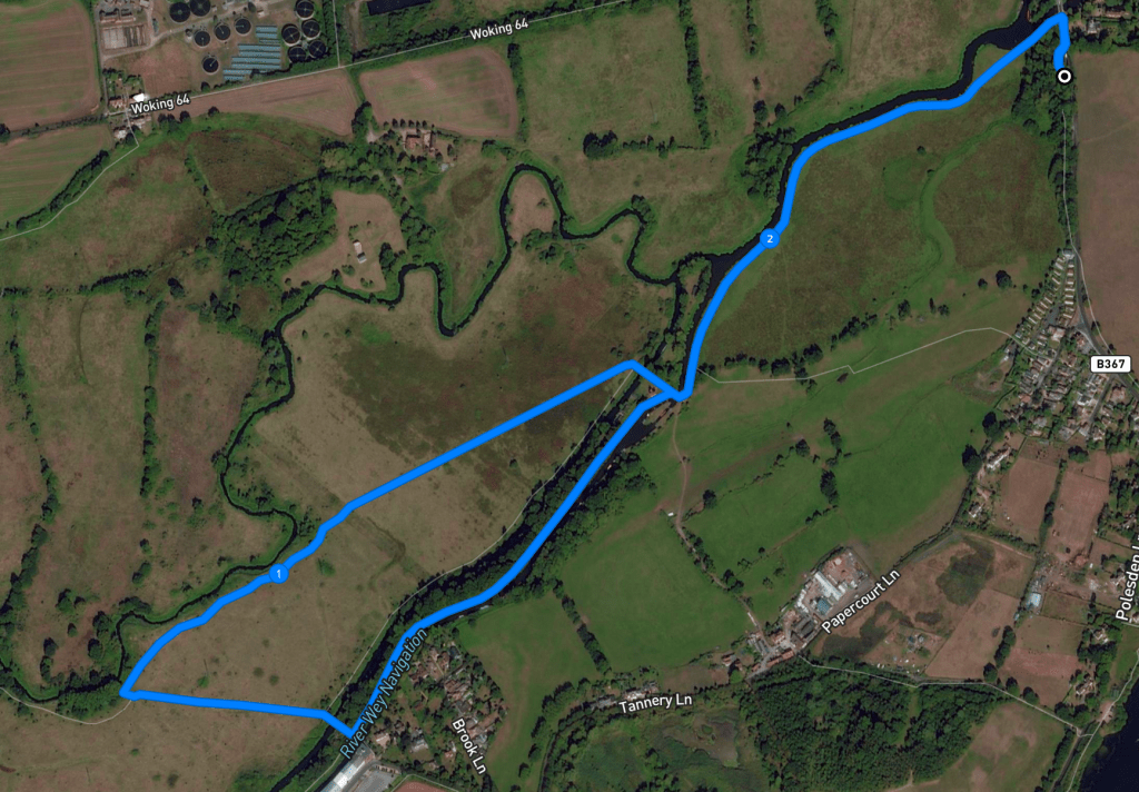 At Papercourt lock, cross back over the Wey Navigation and retrace your steps back to the car park – in short, go through the meadow with the water on your left and turn right when you reach the pavement at the road.