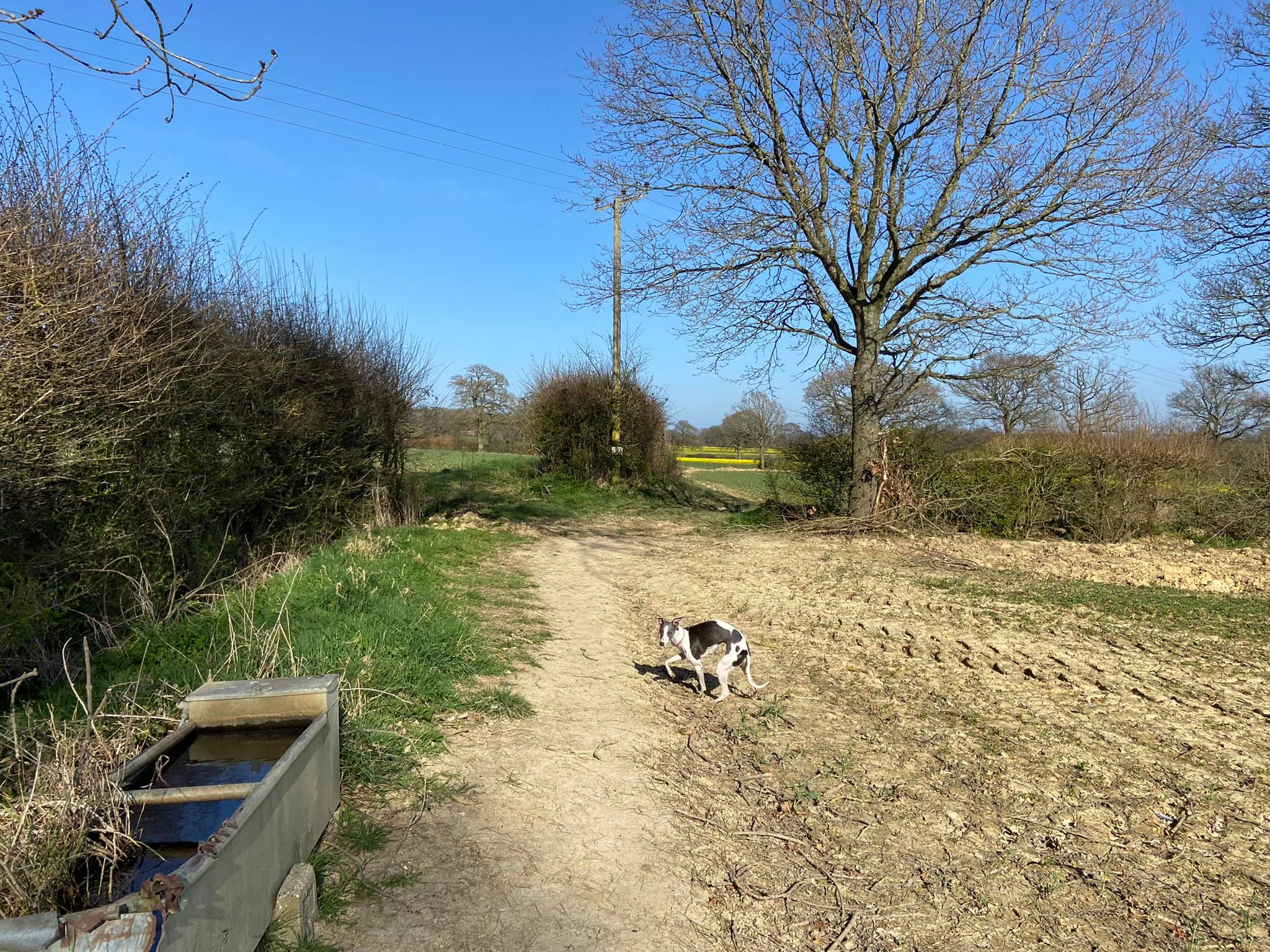 Walk along the left field boundary, passing a metal water trough and going into the next field, again keeping the hedge on your left. At the third field, the path goes straight through the middle so continue ahead.