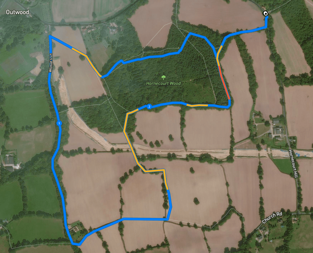 Here is a Footpath app route from Hornecourt Hill car park, which takes you across the lane and through the field to Hornecourt Wood, then through the field behind it and down Wilmot’s Lane. You then loop back through fields behind the farmhouse and return through Hornecourt Wood.
