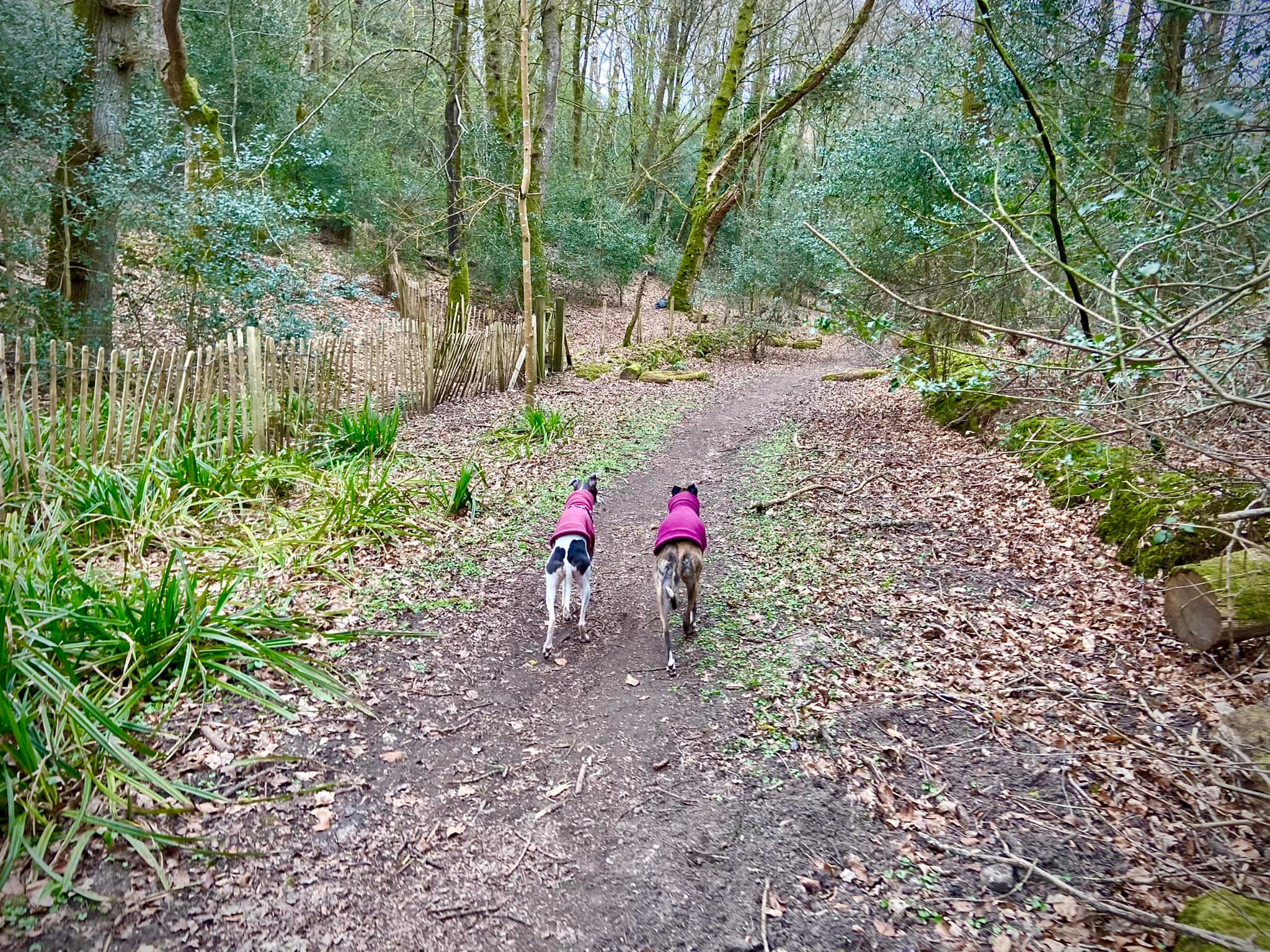 After the fourth gate on the left, the fence becomes a tall wire one like you get around school playing fields and then you’ll come down to a barrier. Go through the gap to the right of the barrier and after a few more paces, turn right on a holly lined path that heads up and away from the little building.