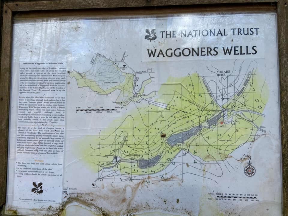 With the entrance to the car park behind you, head away from it to the rear and go down the steps at the end on the right, then turn left to walk past the information board, which has some blurb about Waggoner’s Wells and a line drawing of the area. The first pond/lake is on your right. After a few paces, at the fork, bear right to take the side nearer the water and walk towards the little bridge. Don’t go over the bridge, but turn left just before it and follow the path round left then right, with the stream /overflow channel and waterfalls on your right.