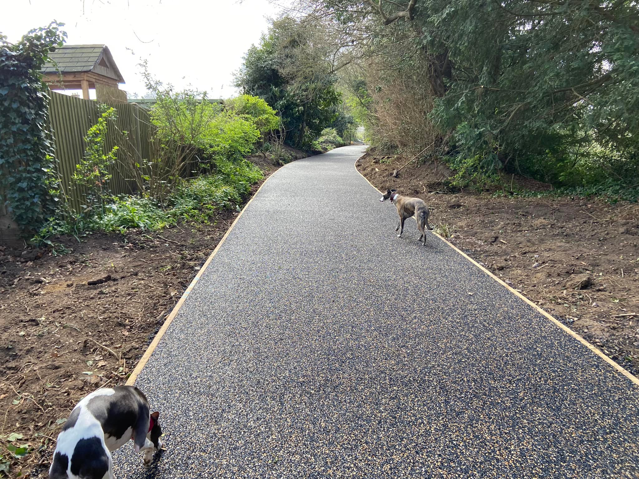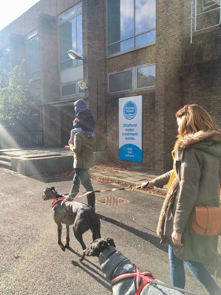 Turn right onto the tarmac. Cross the bridge and if your dog is off lead, put them back on for the next bit. Follow the chain link fence, which marks the property of Shalford Water Treatment Works. At the end of the path, walk past the waterworks building to where the public footpath picks up again on the other side. Ignore the metal kissing gate to the right.