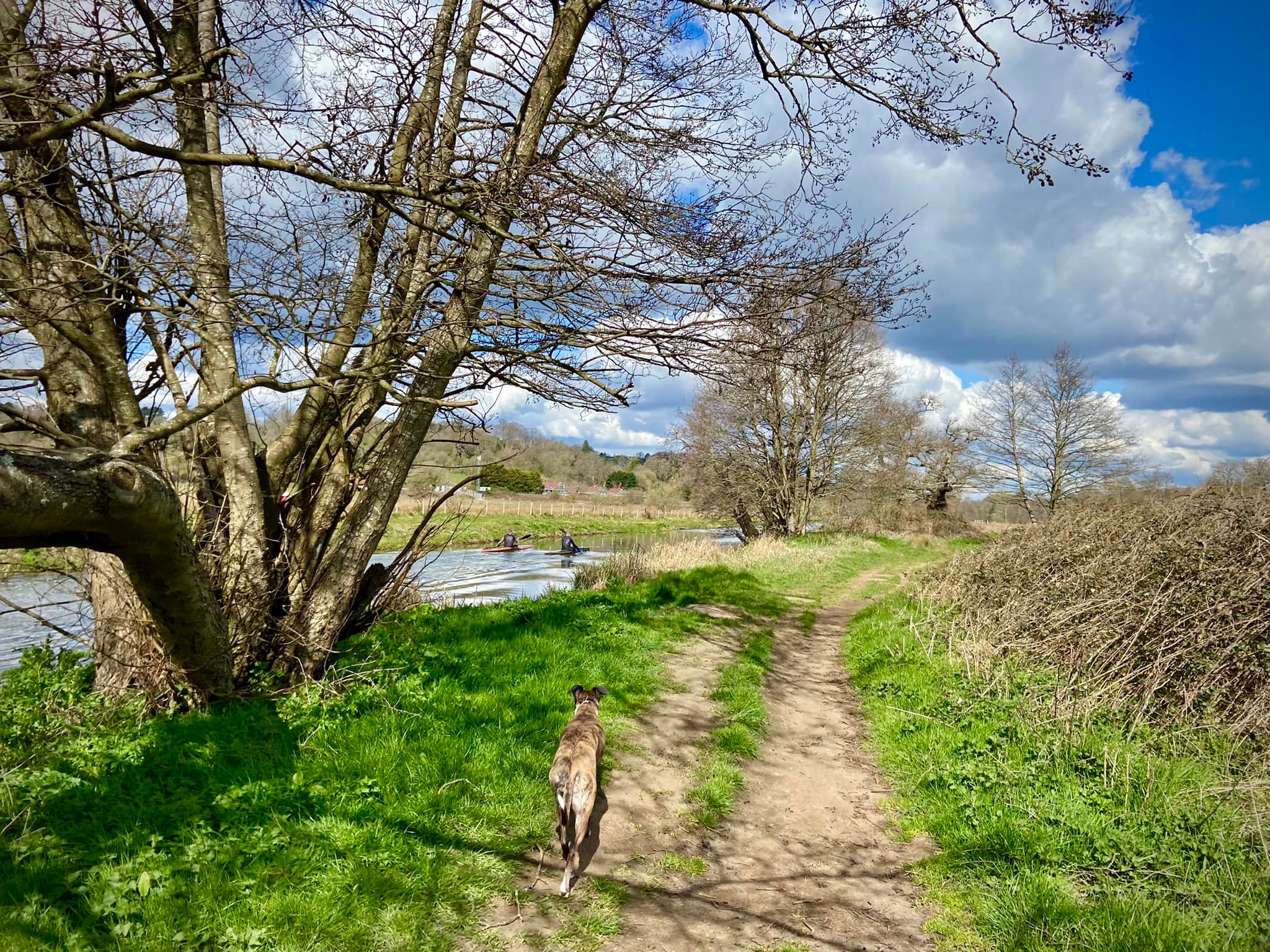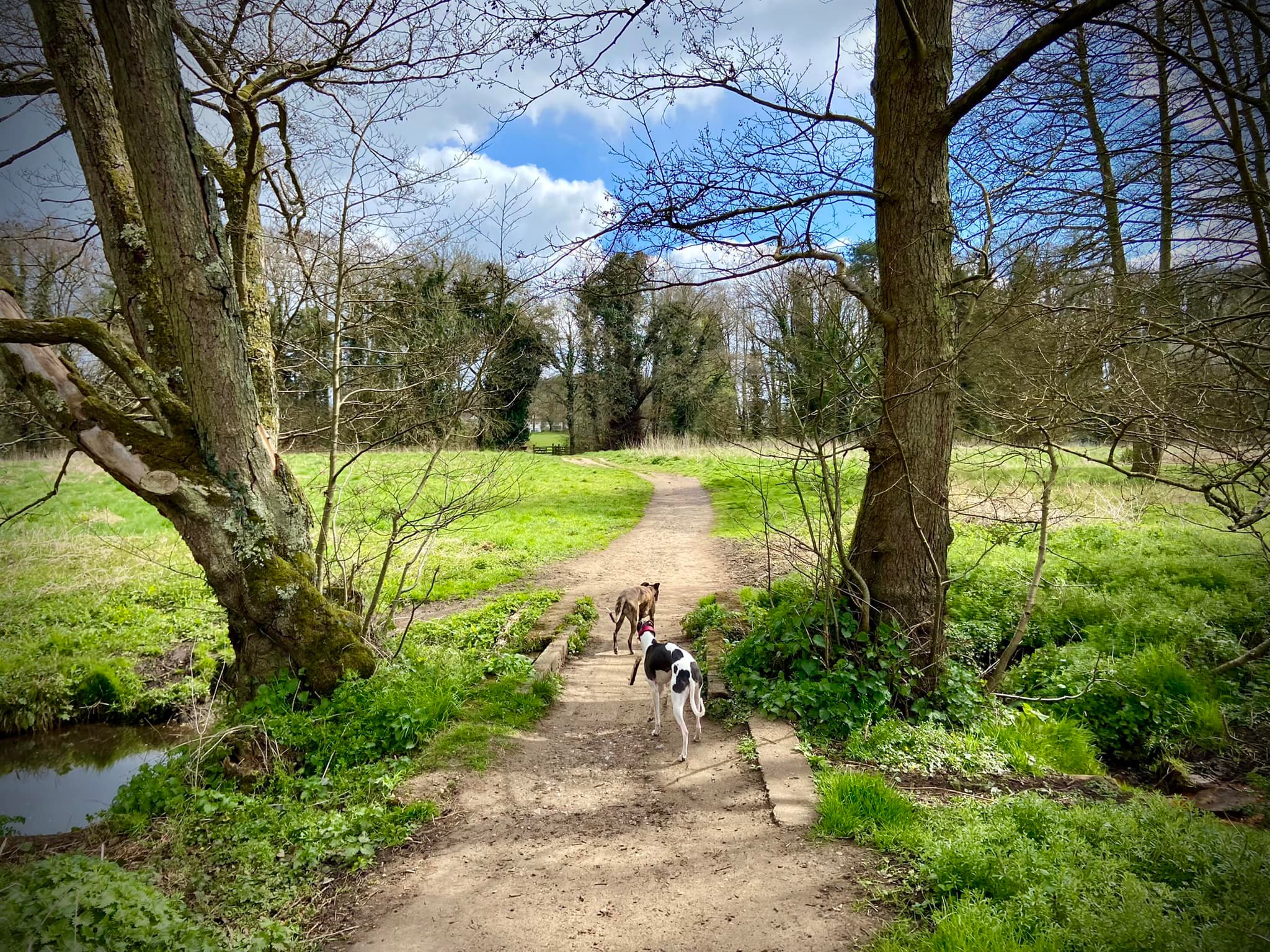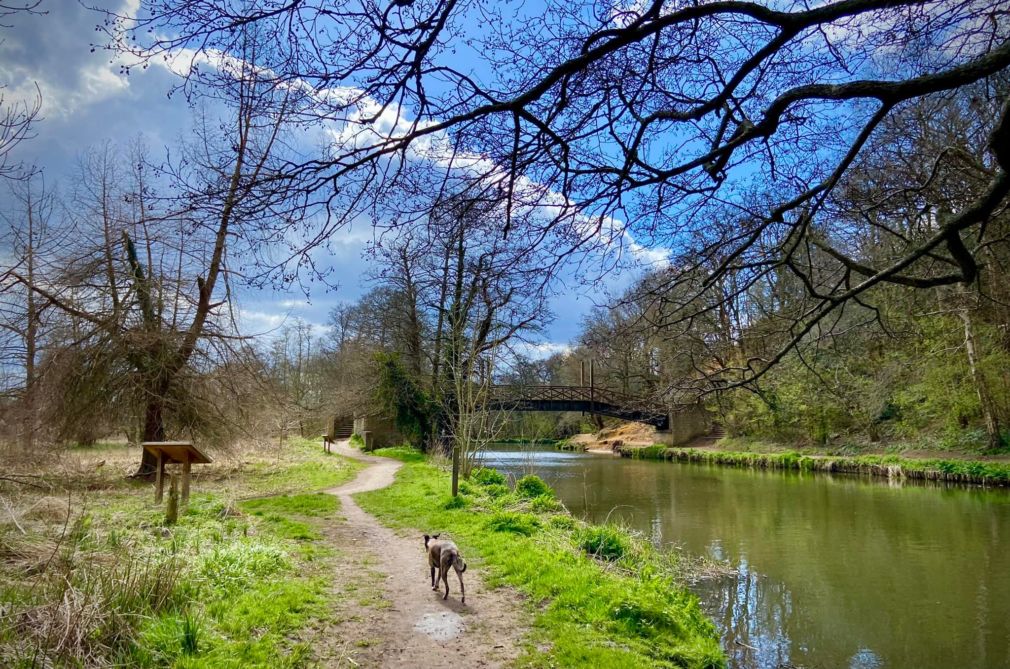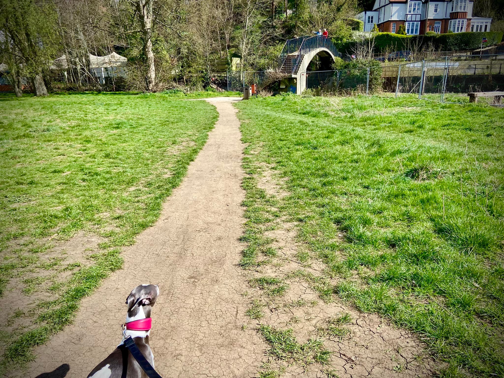 When you reach the rowing club, if your dog is off lead, put them back on for the next little bit. Cross the weir and head towards the road. Go over the footbridge over the canal right by the rowing club (marveling at the grooves for bicycles) and turn right on the other side.