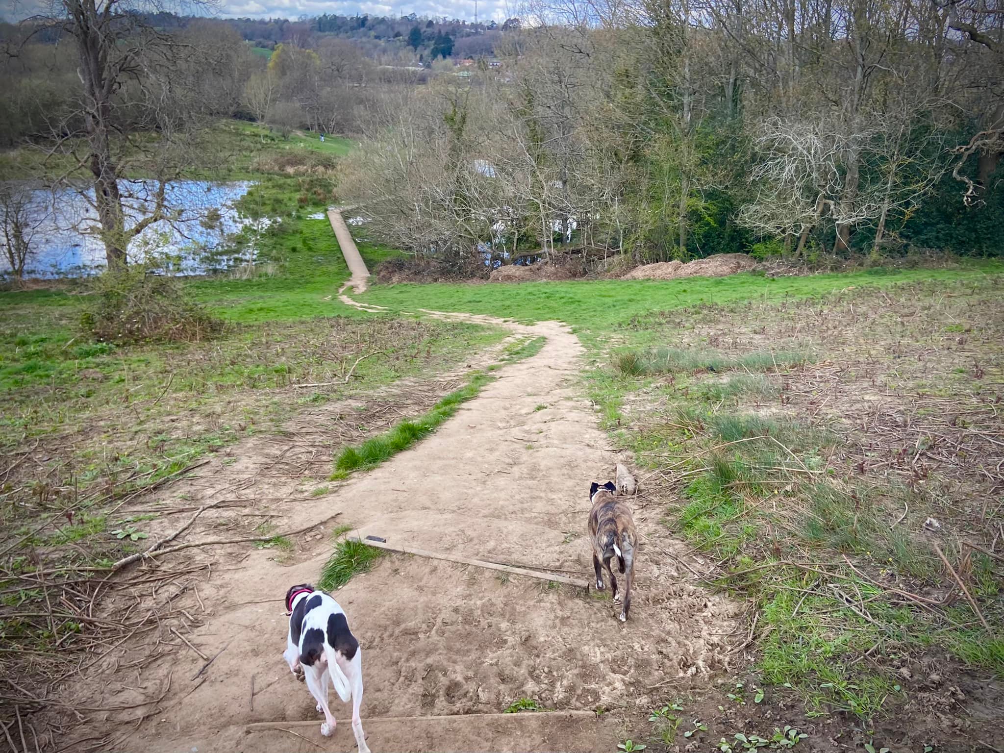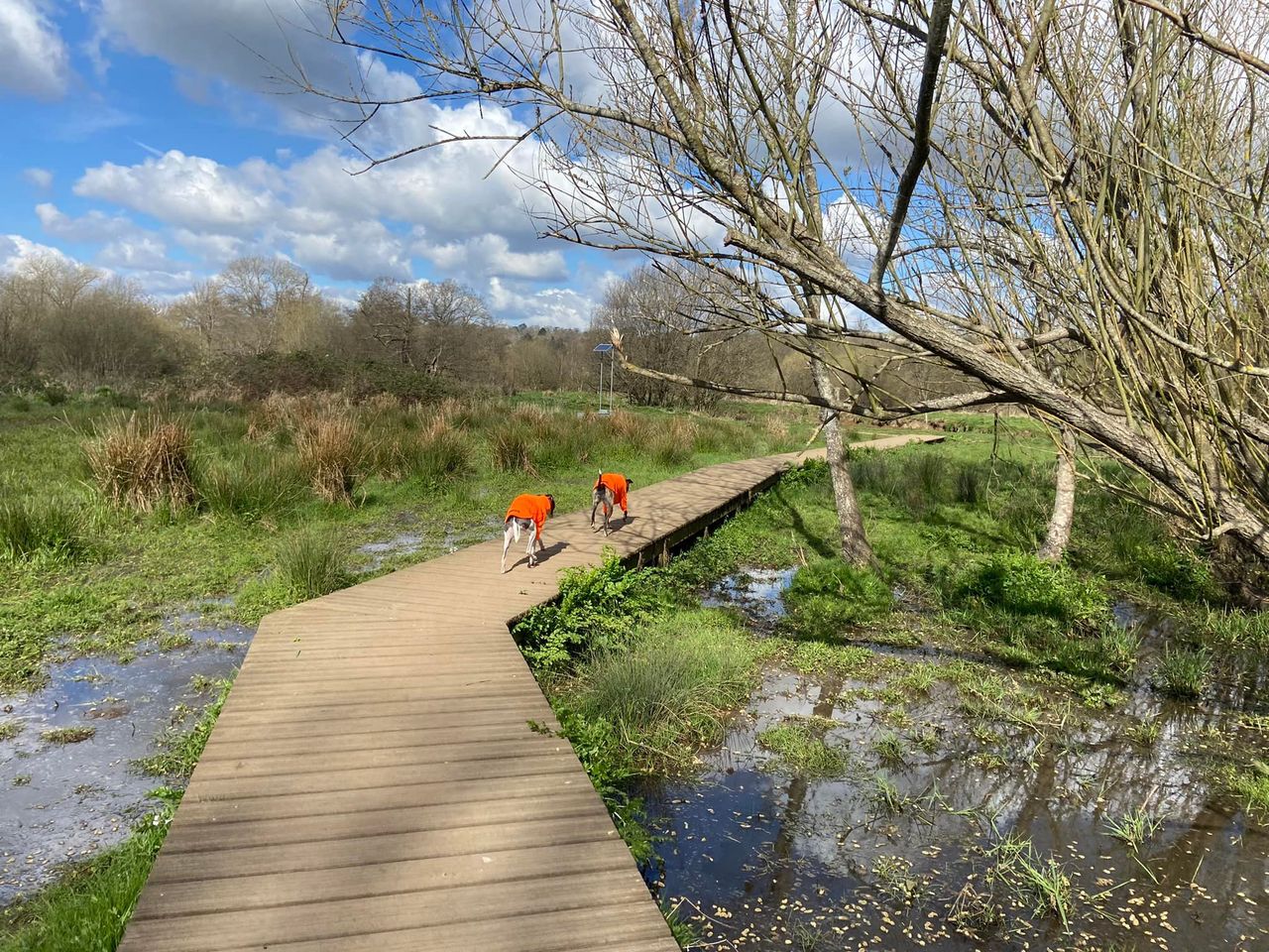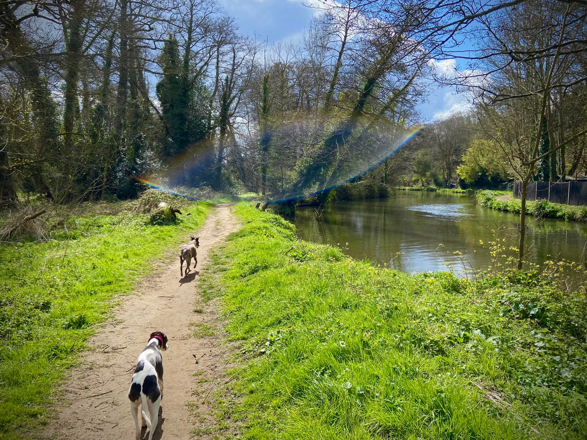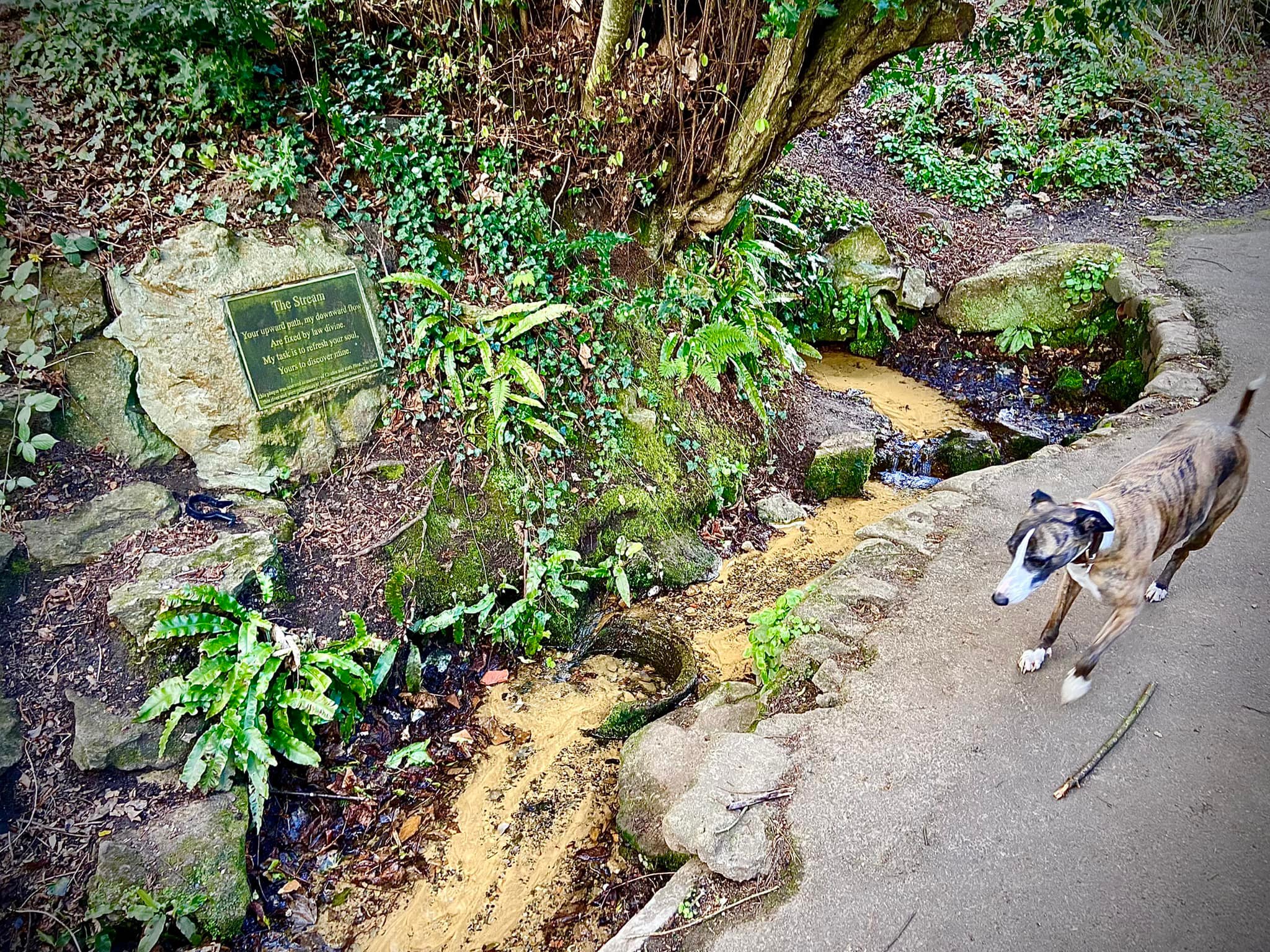 When you reach the rowing club, if your dog is off lead, put them back on for the next little bit. Cross the weir and head towards the road. Go over the footbridge over the canal right by the rowing club (marveling at the grooves for bicycles) and turn right on the other side.